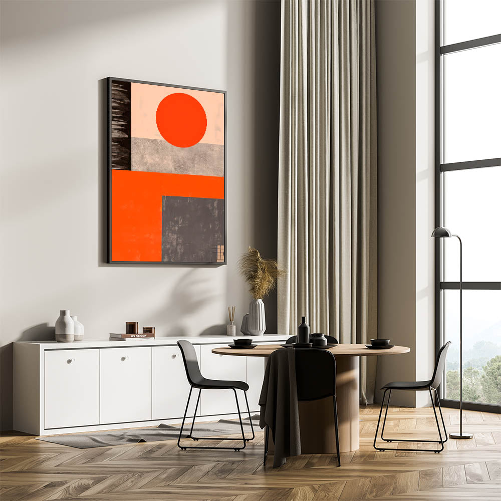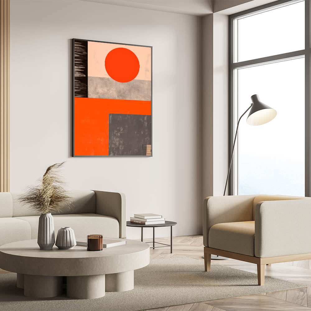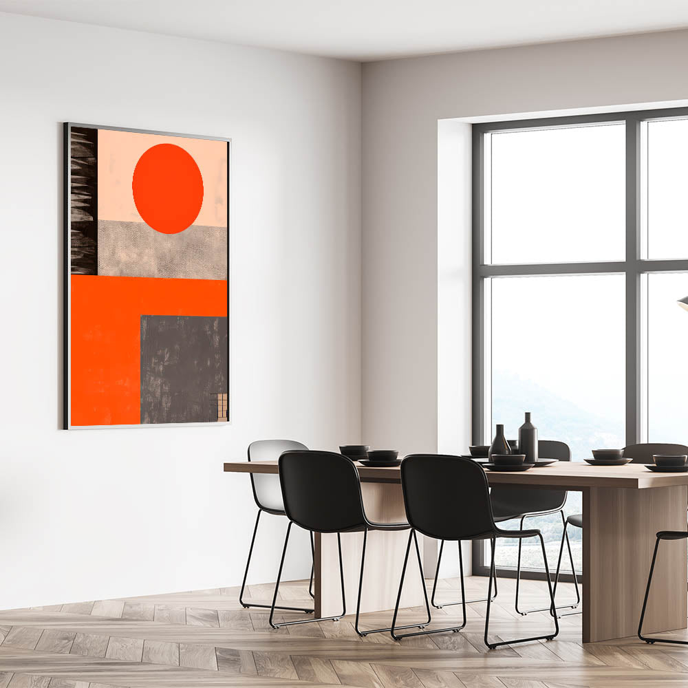 Add a striking touch to your space with this bold maximalist wall art, featuring a geometric abstract composition. The design combines vibrant orange, muted gray, and black elements, creating a dynamic and visually compelling piece that adds depth and contemporary style to any room. The sharp contrasts and layered textures evoke a sense of movement and structure, making it an ideal choice for those who appreciate modern and eclectic decor. Perfect for living rooms, offices, or creative spaces, this artwork brings an eye-catching statement to your walls.