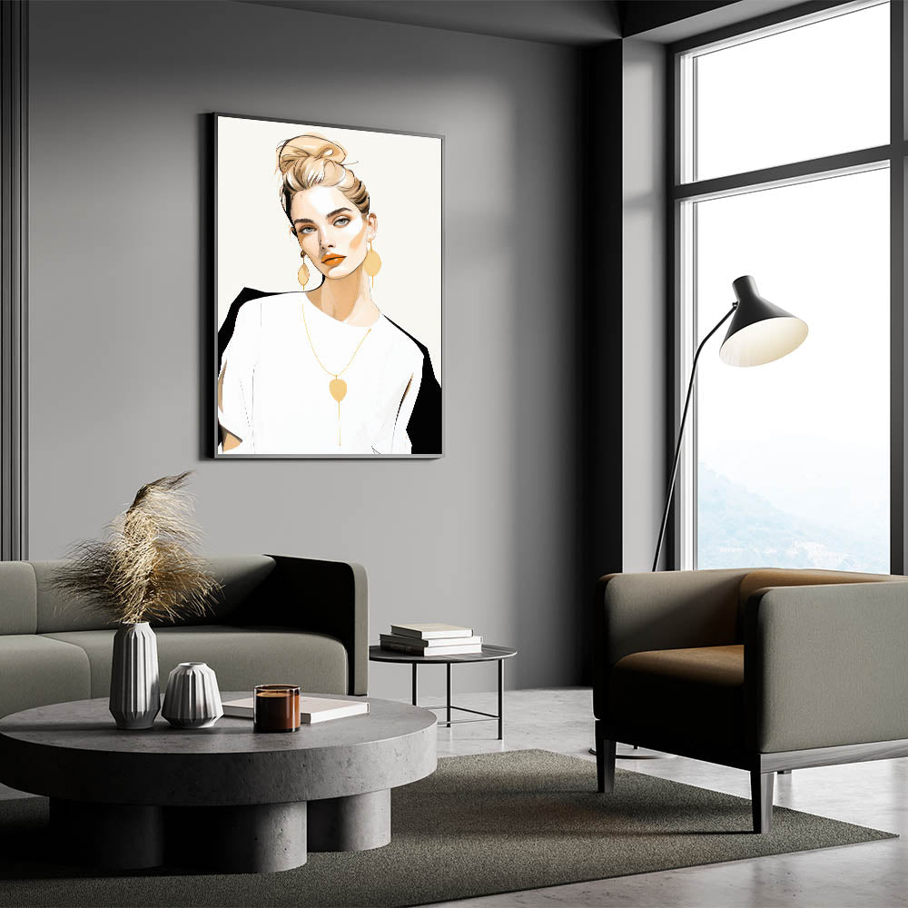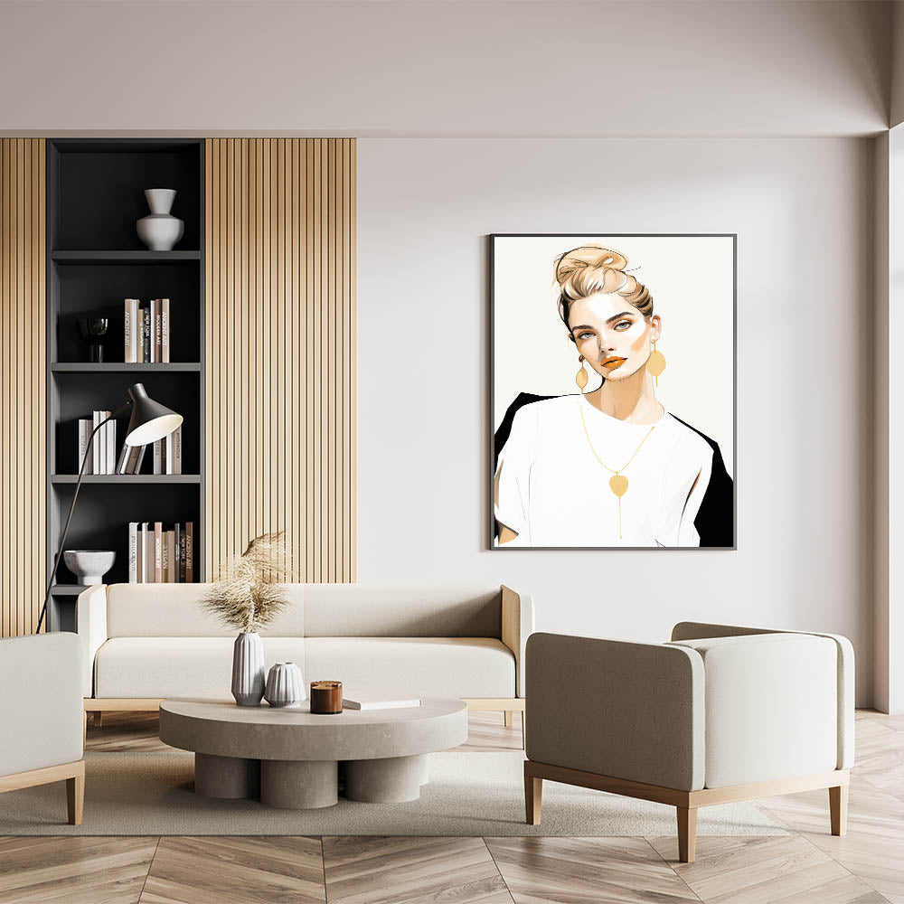 Make a statement with this bold maximalist portrait featuring a refined yet powerful depiction of a woman adorned with striking gold accessories. The artwork captures a minimalist yet vibrant aesthetic, blending soft tones with bold black and gold contrasts. Her elegant earrings and matching gold necklace create a unique focal point, making this piece a standout addition to any eclectic home decor.