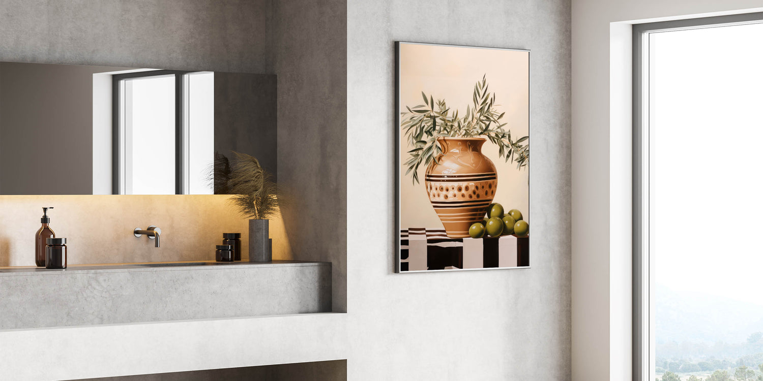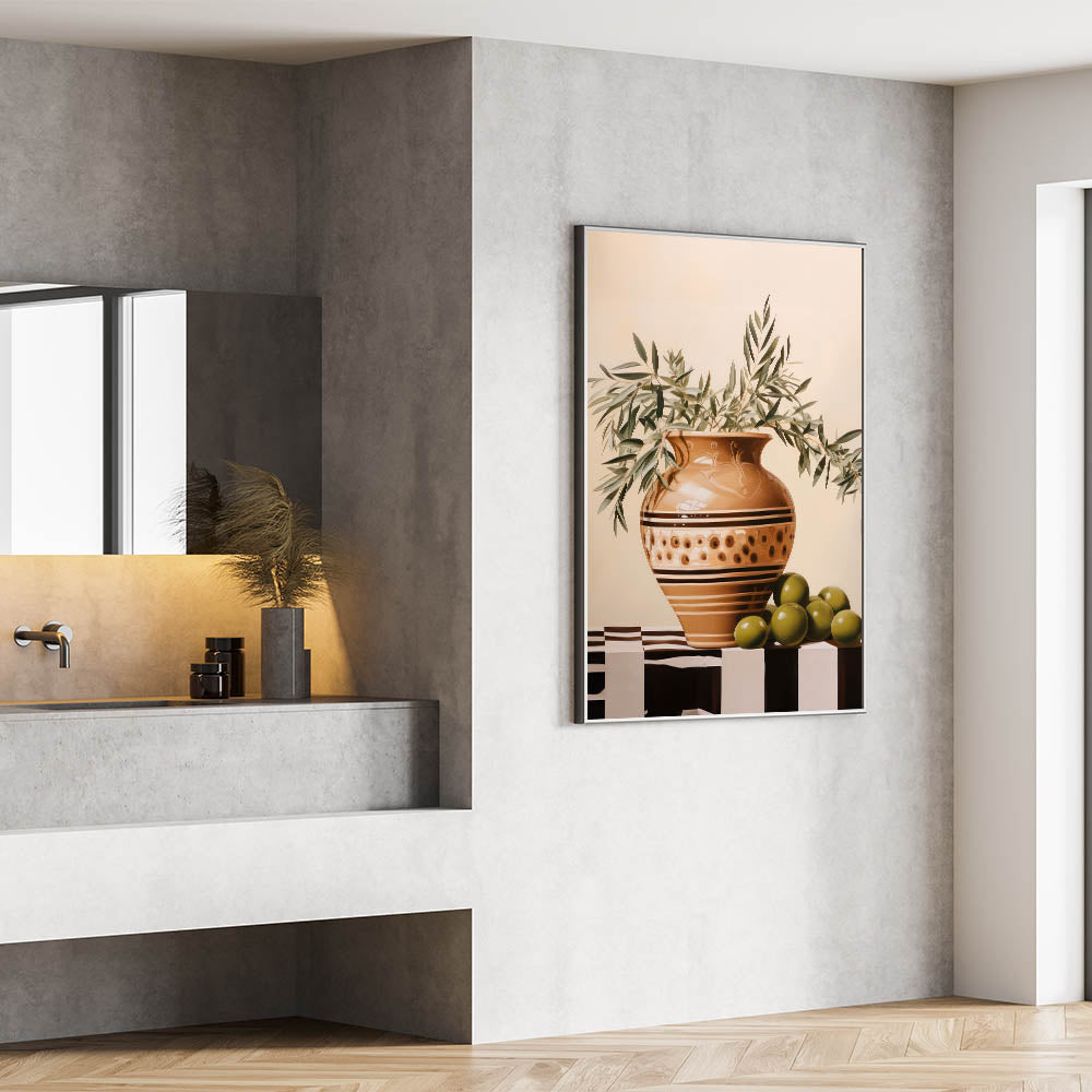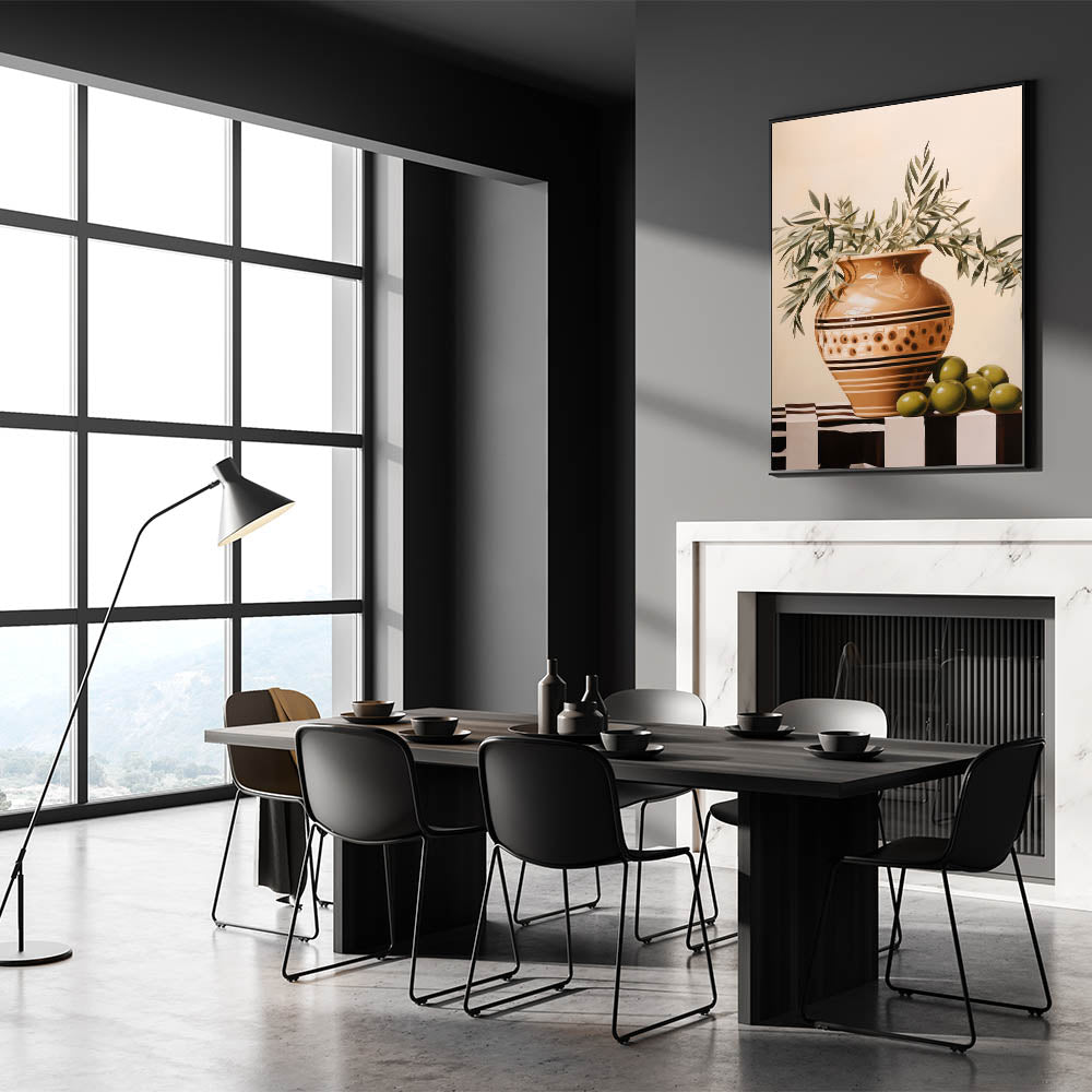 Transform your space with this stunning Maximalist Wall Art, featuring a bold and vibrant still life of a beautifully detailed vase filled with olive branches. The earthy tones and intricate patterns on the vase, combined with the lush greens of the olives, create an eye-catching design perfect for those who appreciate eclectic and expressive art pieces. This artwork brings a touch of nature and elegance, adding a sense of warmth and charm to any room.