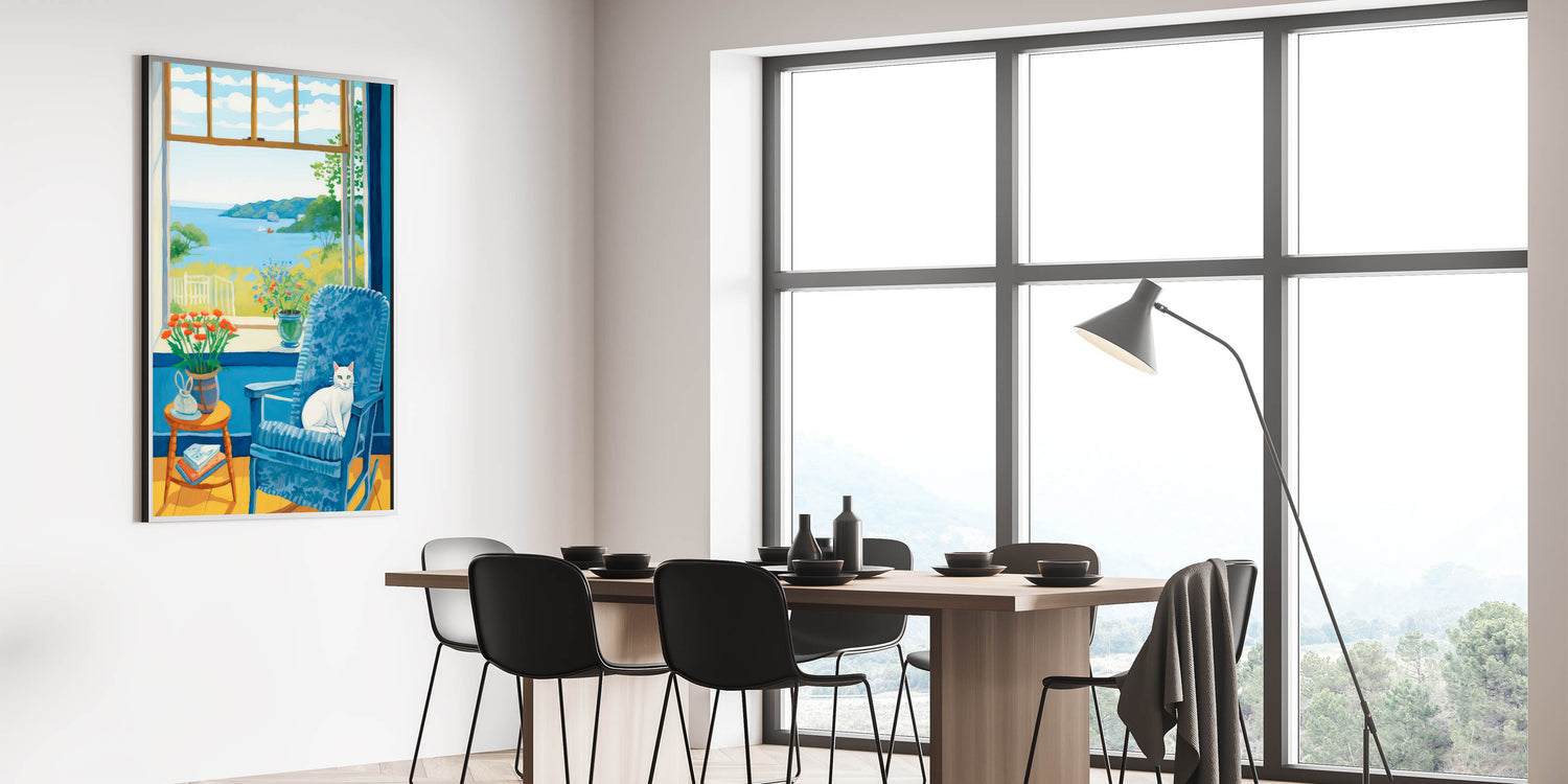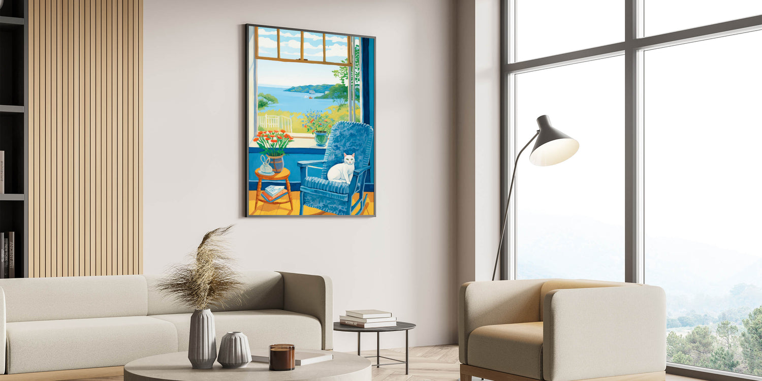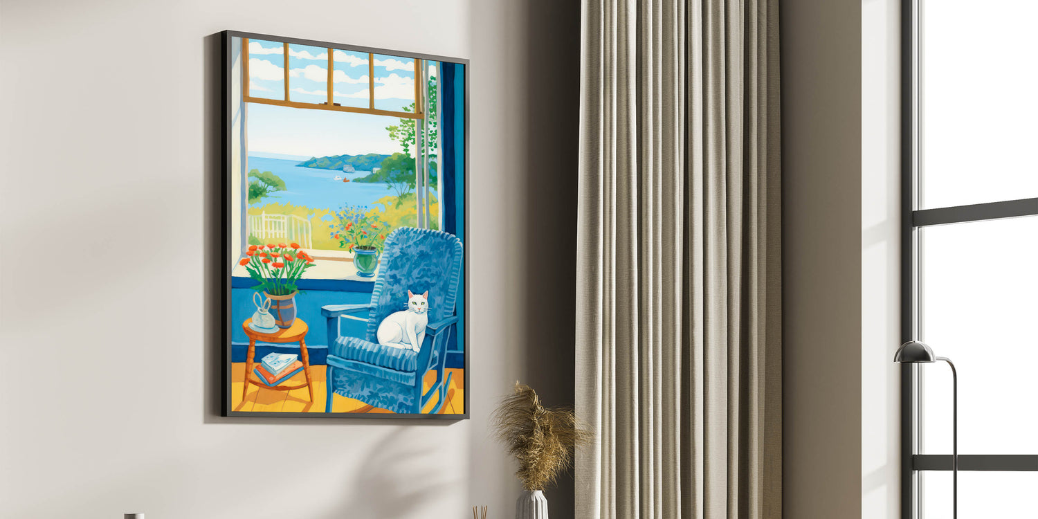 Maximalist Wall Art - Cozy Seaside Scene with Cat - Vibrant Decor Piece