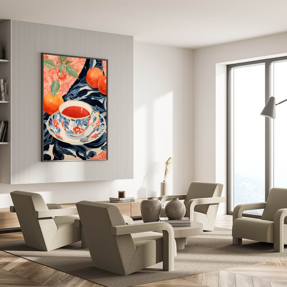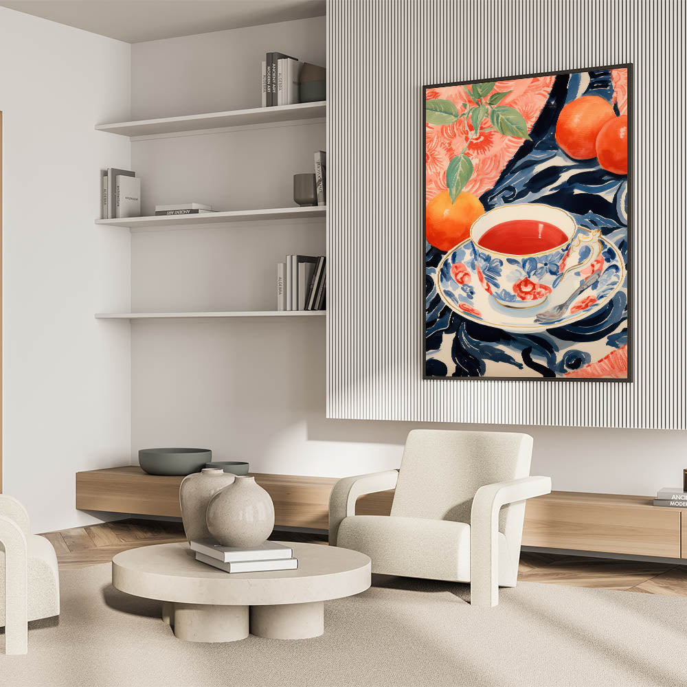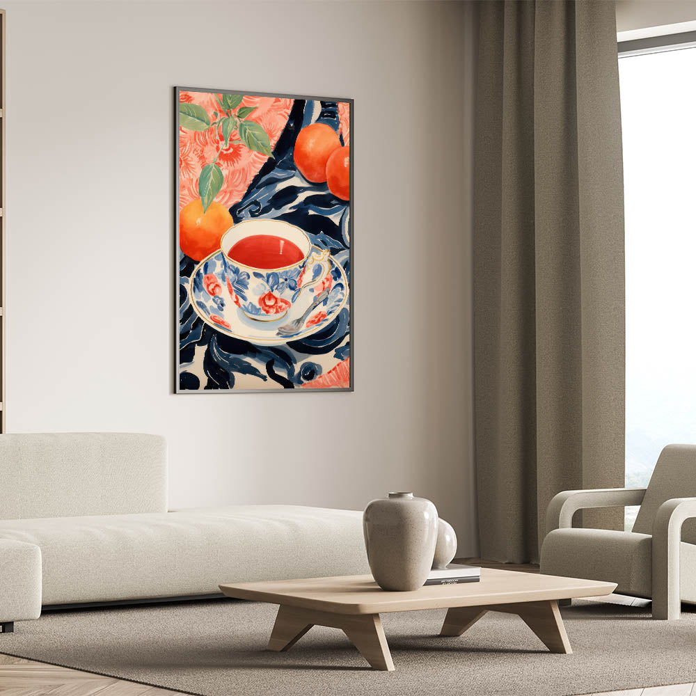 Add a touch of vibrant maximalism to your space with this eclectic art print featuring a beautifully detailed tea cup surrounded by bold patterns and colorful fruits. The artwork showcases a dynamic design that effortlessly blends traditional charm with modern flair, perfect for those looking to make a statement with their wall decor. The rich colors and expressive details make it an eye-catching addition to any room, whether used as a focal point or part of a larger gallery wall.