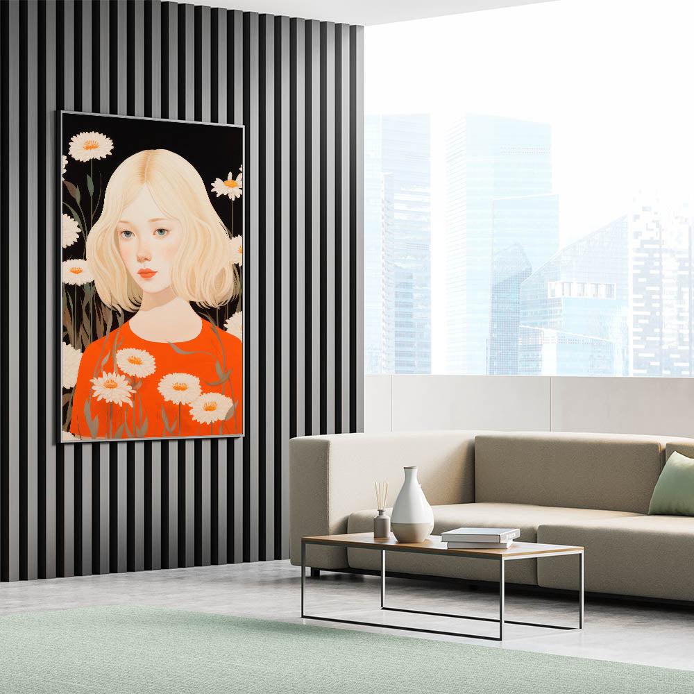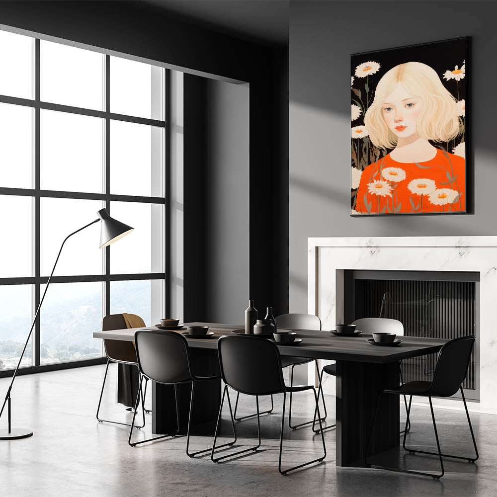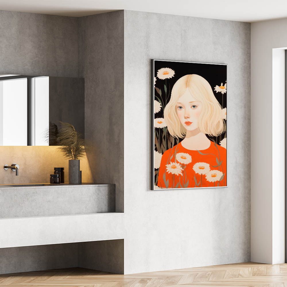 This captivating Maximalist Wall Art adds a vibrant and eclectic touch to your home decor. Featuring a serene yet expressive portrait surrounded by delicate floral patterns, the artwork stands out with its striking contrast of bold, bright colors and intricate details. The soft blend of pastel tones in the background, paired with the bold orange and white florals, creates a dynamic design that instantly elevates any space.