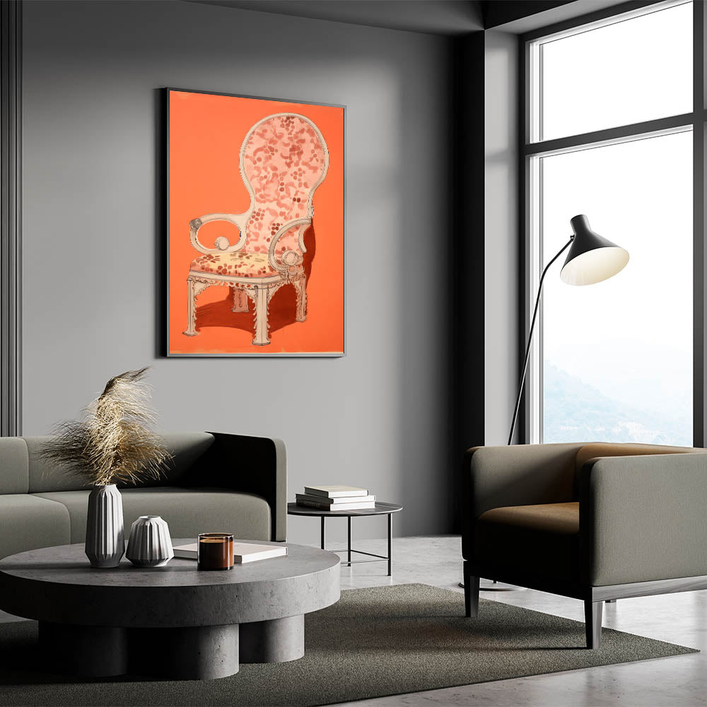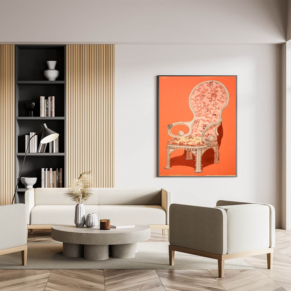 Elevate your space with this striking Maximalist wall art, featuring a bold, eclectic chair design set against a vibrant orange backdrop. The intricate details of the ornate chair, with its soft pink and beige patterns, create a unique blend of vintage charm and modern flair. This eye-catching piece is perfect for those who enjoy adding artistic and bold statement pieces to their decor.