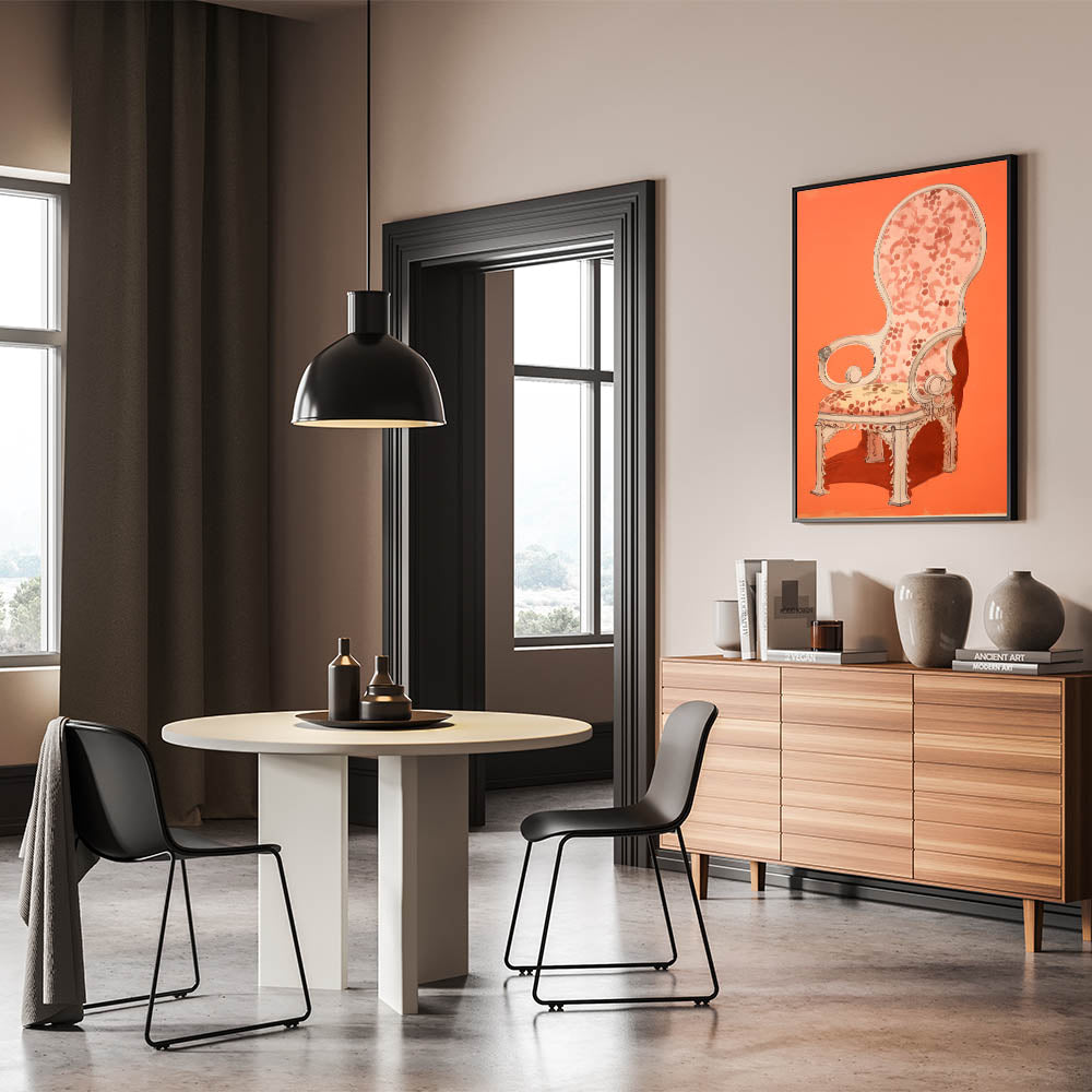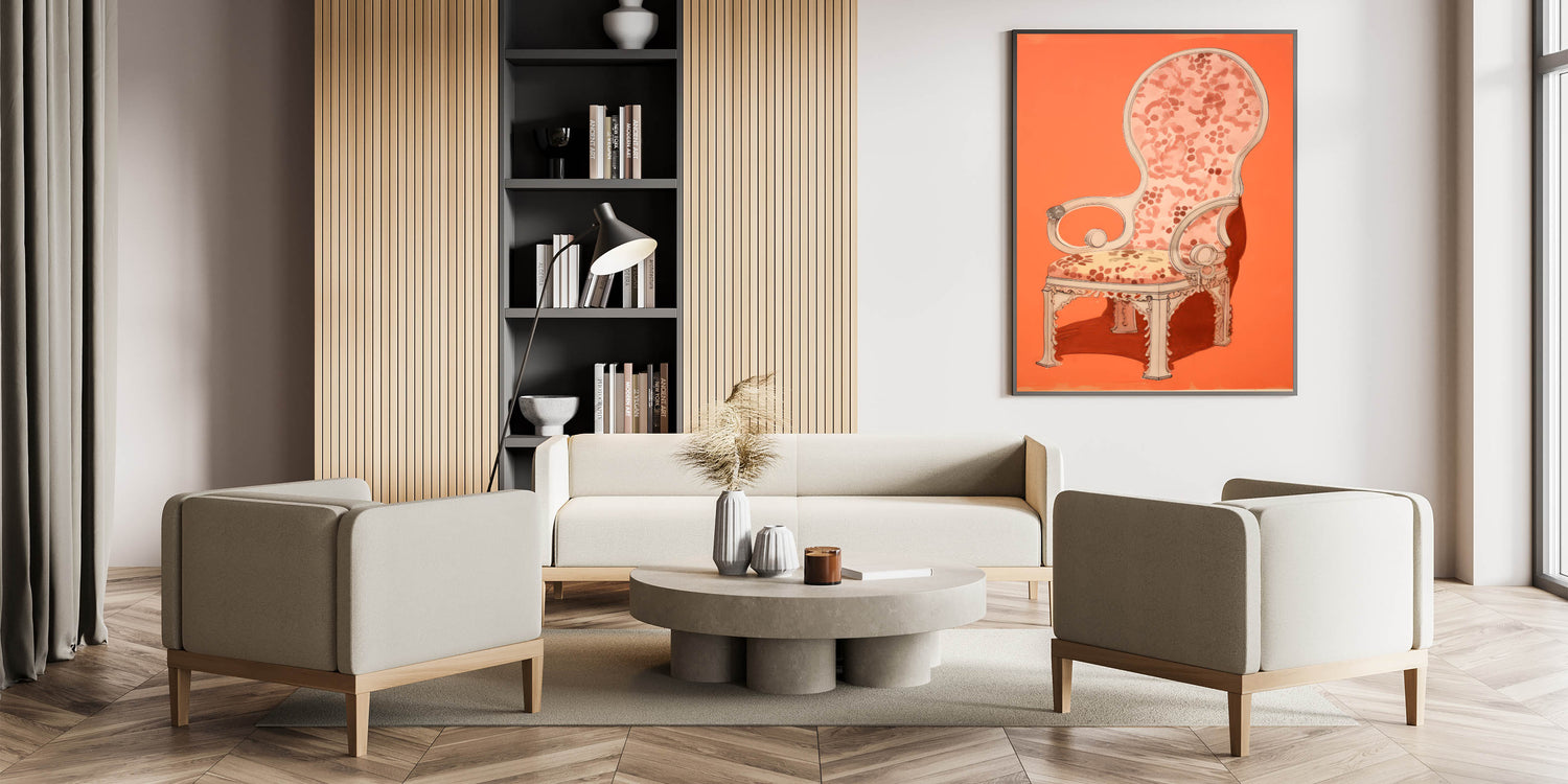 - Bold colors and patterns: Featuring a vibrant orange background and soft pink and beige chair design for a dynamic visual impact.