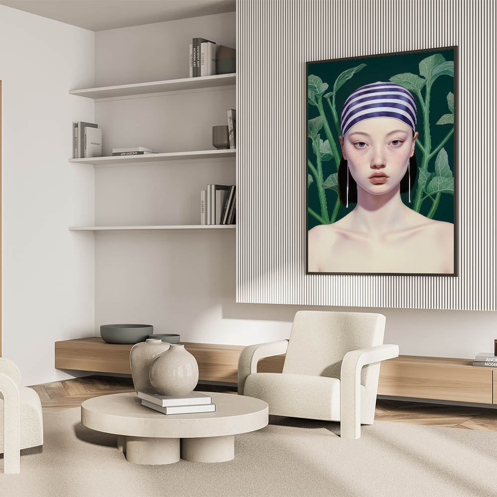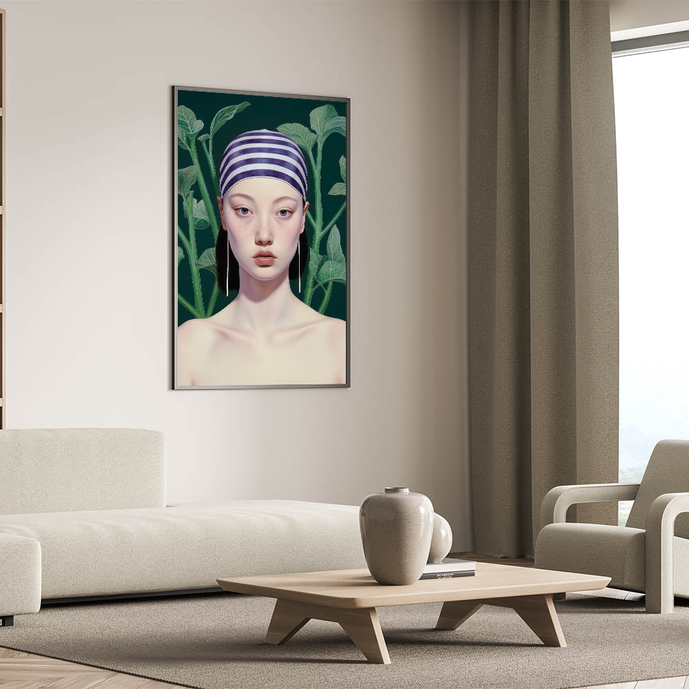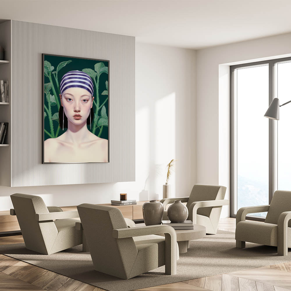 Embrace the bold and eclectic with this striking maximalist wall art, featuring a serene portrait set against lush greenery. The subject’s calm gaze, framed by a vivid striped headscarf and delicate foliage, creates a dynamic and unique composition. The artwork’s contrasting tones of deep green and soft pastels bring out the vibrant maximalism, making it an ideal choice for contemporary spaces or those who appreciate a touch of expressive art. This piece is perfect for adding a unique and artistic flair to your decor, effortlessly blending minimalism and maximalism.