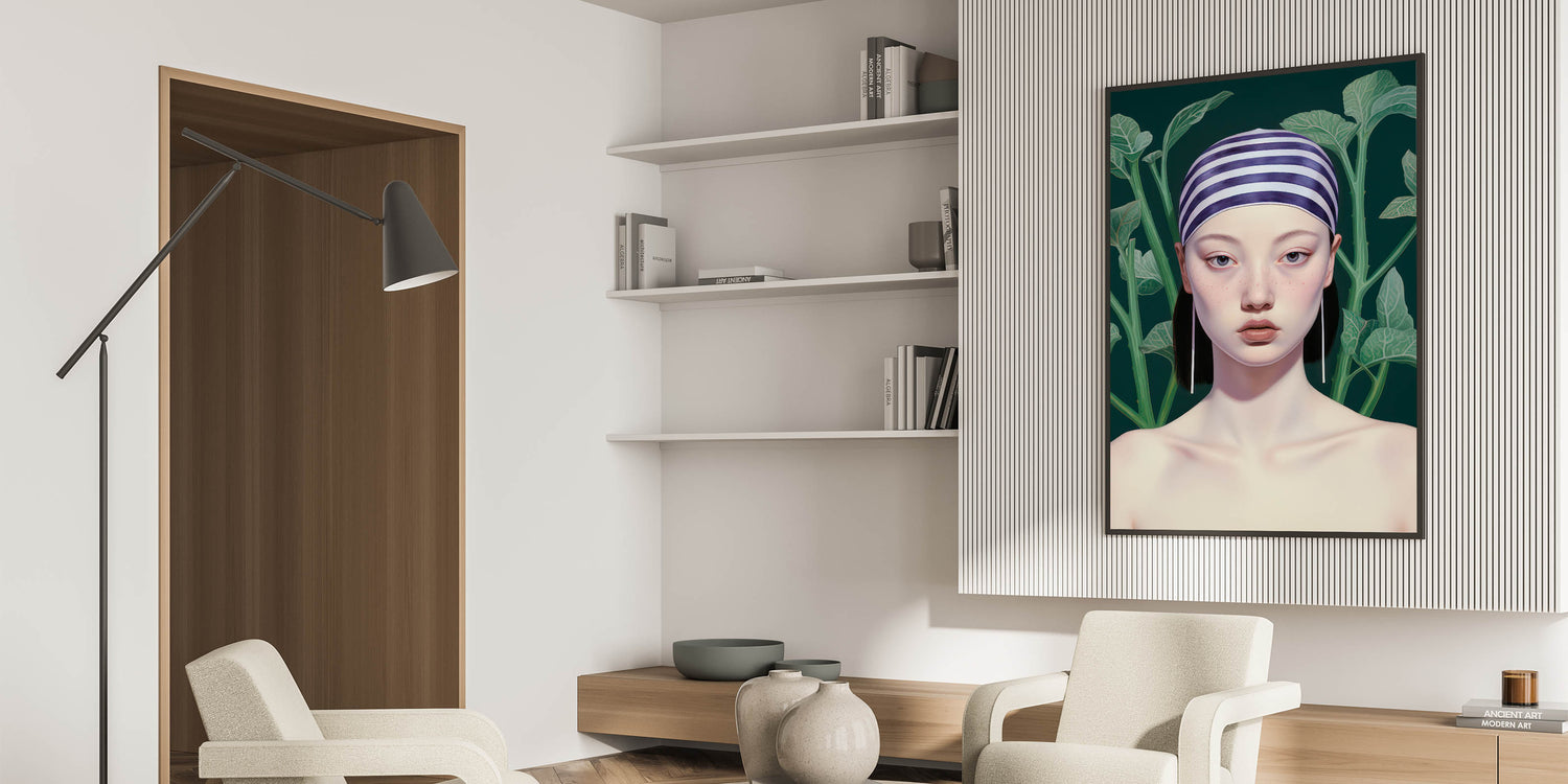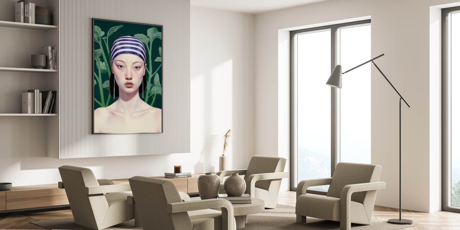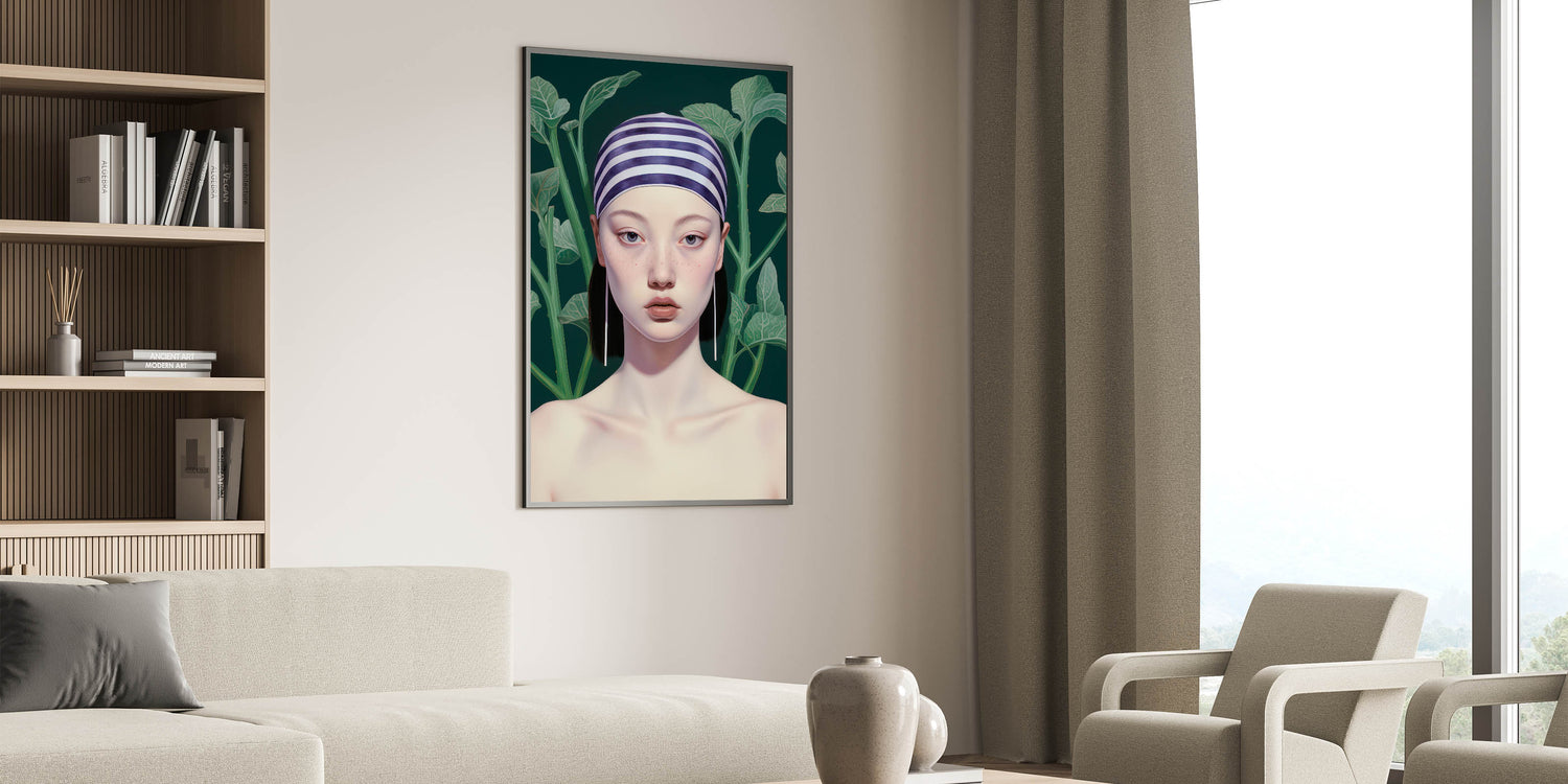Embrace the bold and eclectic with this striking maximalist wall art, featuring a serene portrait set against lush greenery. The subject’s calm gaze, framed by a vivid striped headscarf and delicate foliage, creates a dynamic and unique composition. The artwork’s contrasting tones of deep green and soft pastels bring out the vibrant maximalism, making it an ideal choice for contemporary spaces or those who appreciate a touch of expressive art. This piece is perfect for adding a unique and artistic flair to your decor, effortlessly blending minimalism and maximalism.