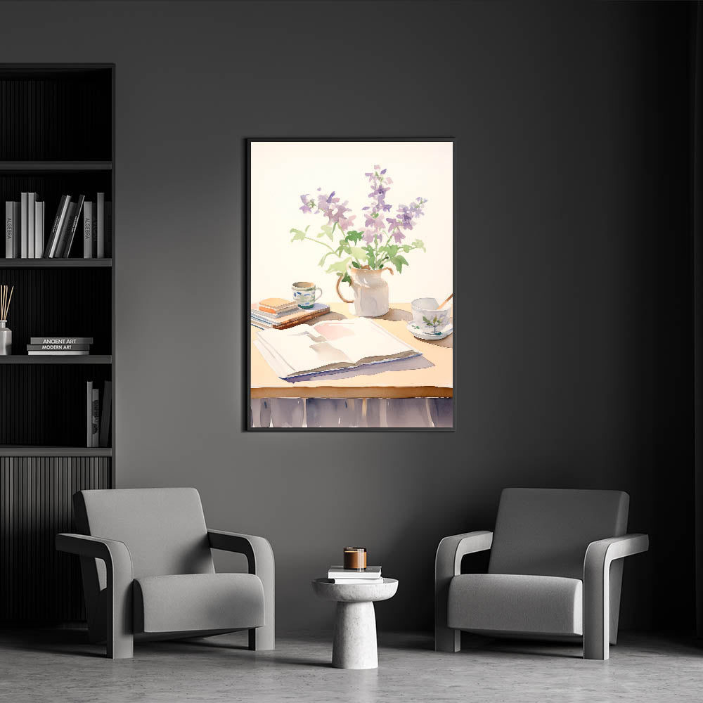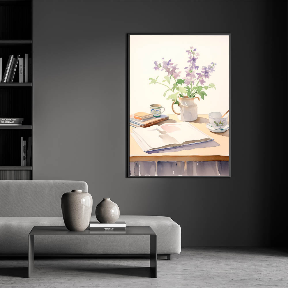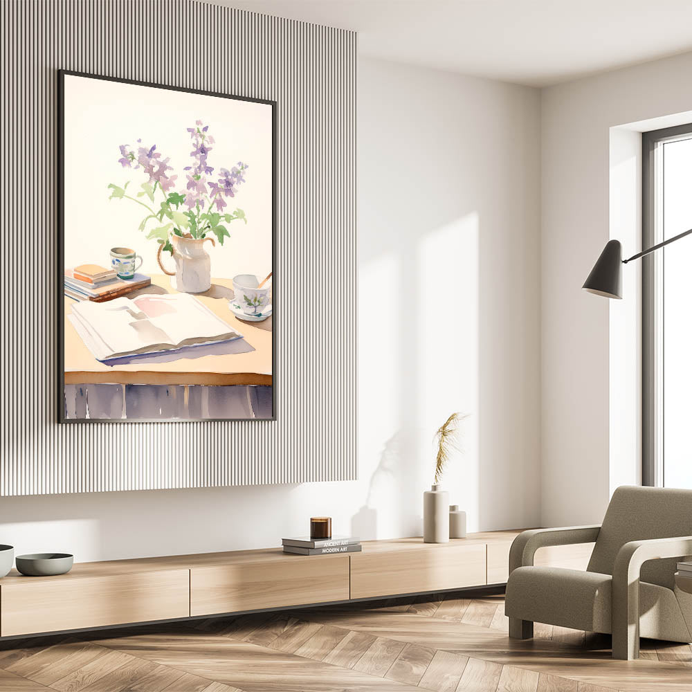 Enhance your home decor with this serene maximalist wall art featuring a peaceful still life scene. The artwork captures the essence of calm with its delicate arrangement of purple flowers in a ceramic jug, an open book, and a beautifully crafted tea set. The soft color palette, consisting of lilac, green, and beige, blends perfectly with the quiet atmosphere of this piece, creating a subtle yet bold statement wall art.