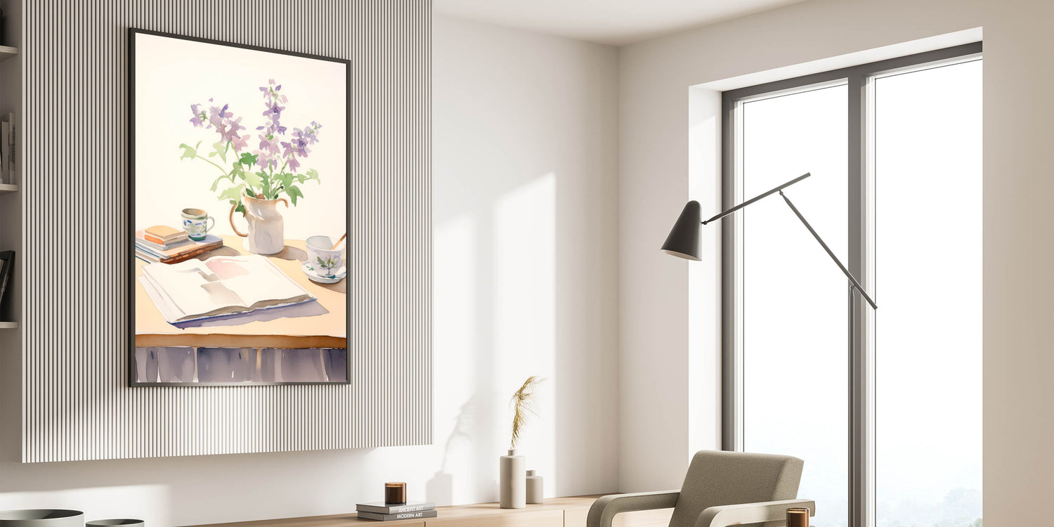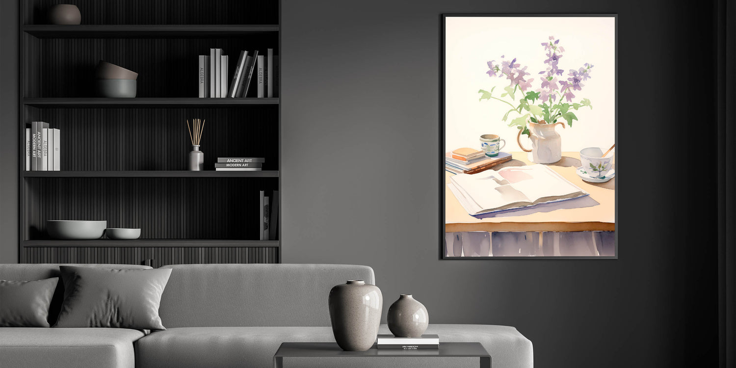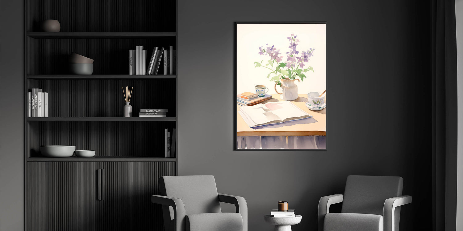 Enhance your home decor with this serene maximalist wall art featuring a peaceful still life scene. The artwork captures the essence of calm with its delicate arrangement of purple flowers in a ceramic jug, an open book, and a beautifully crafted tea set. The soft color palette, consisting of lilac, green, and beige, blends perfectly with the quiet atmosphere of this piece, creating a subtle yet bold statement wall art.