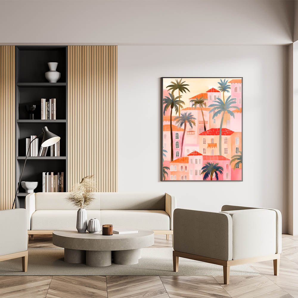 Add a touch of vibrant maximalism to your home with this lively cityscape wall art, featuring colorful Mediterranean buildings and lush palm trees. The artwork brings a dynamic mix of warm hues and bold patterns, capturing the essence of a sunlit coastal town. The expressive design and vivid color palette make it an eye-catching statement wall art piece, perfect for eclectic decor styles. Ideal for living rooms, bedrooms, or creative spaces, this piece enhances any interior with its unique and vibrant style, bringing life and personality to your decor.
