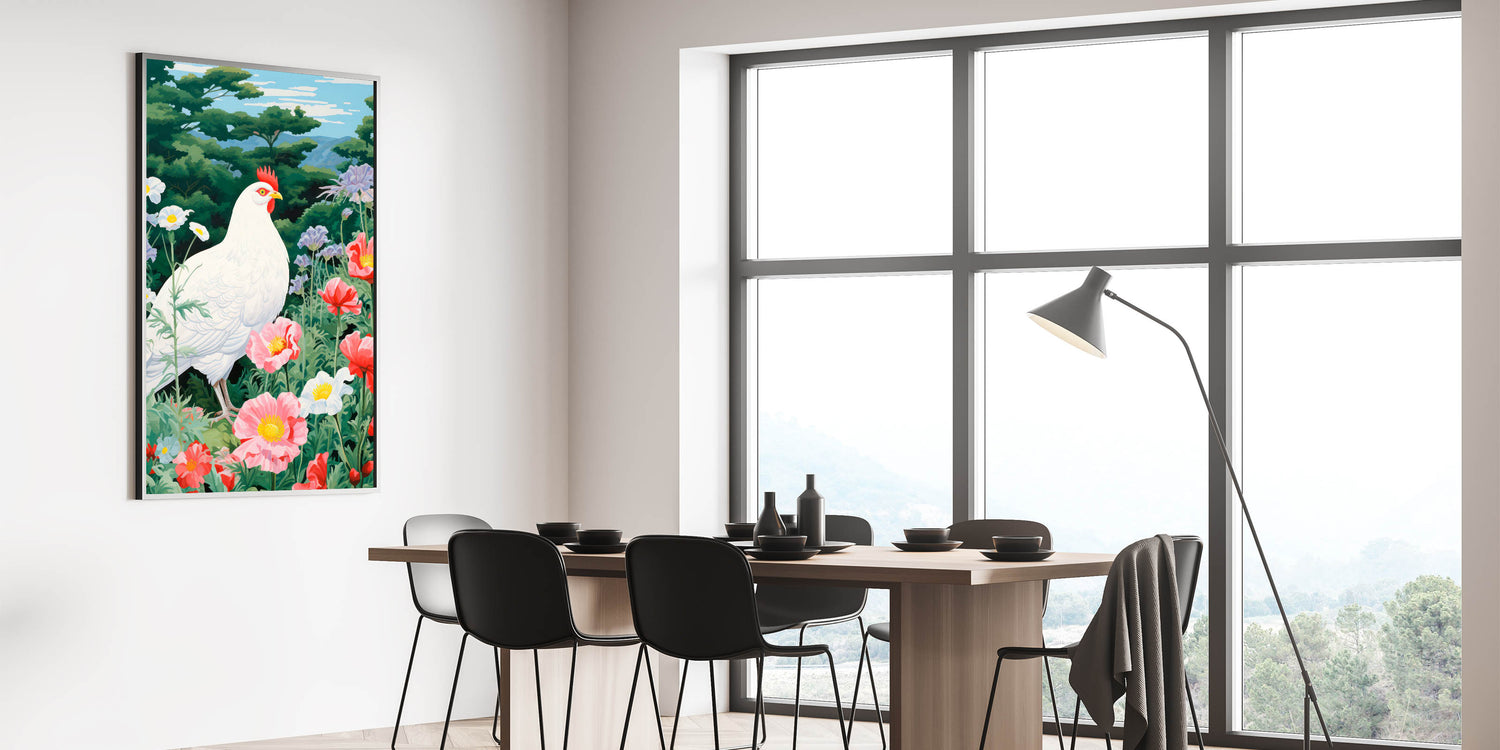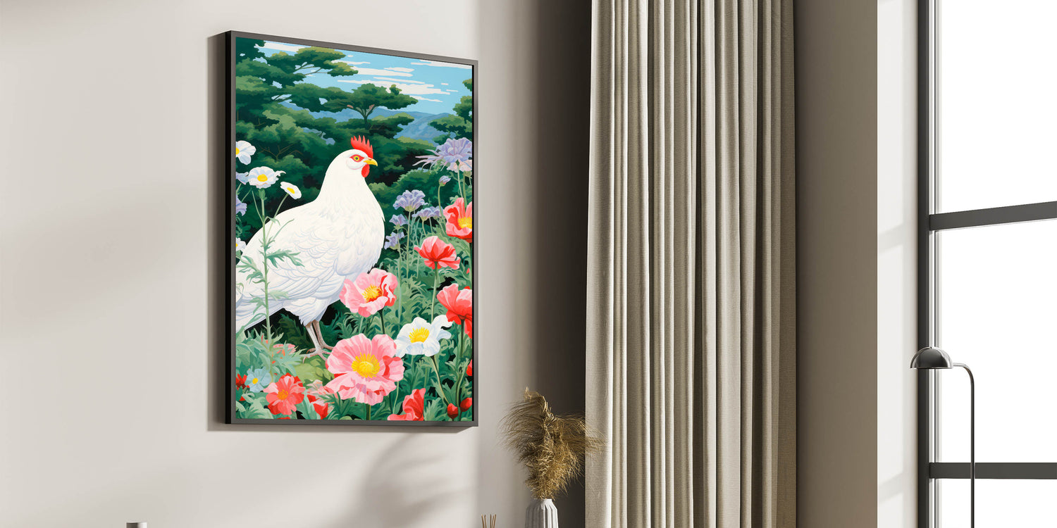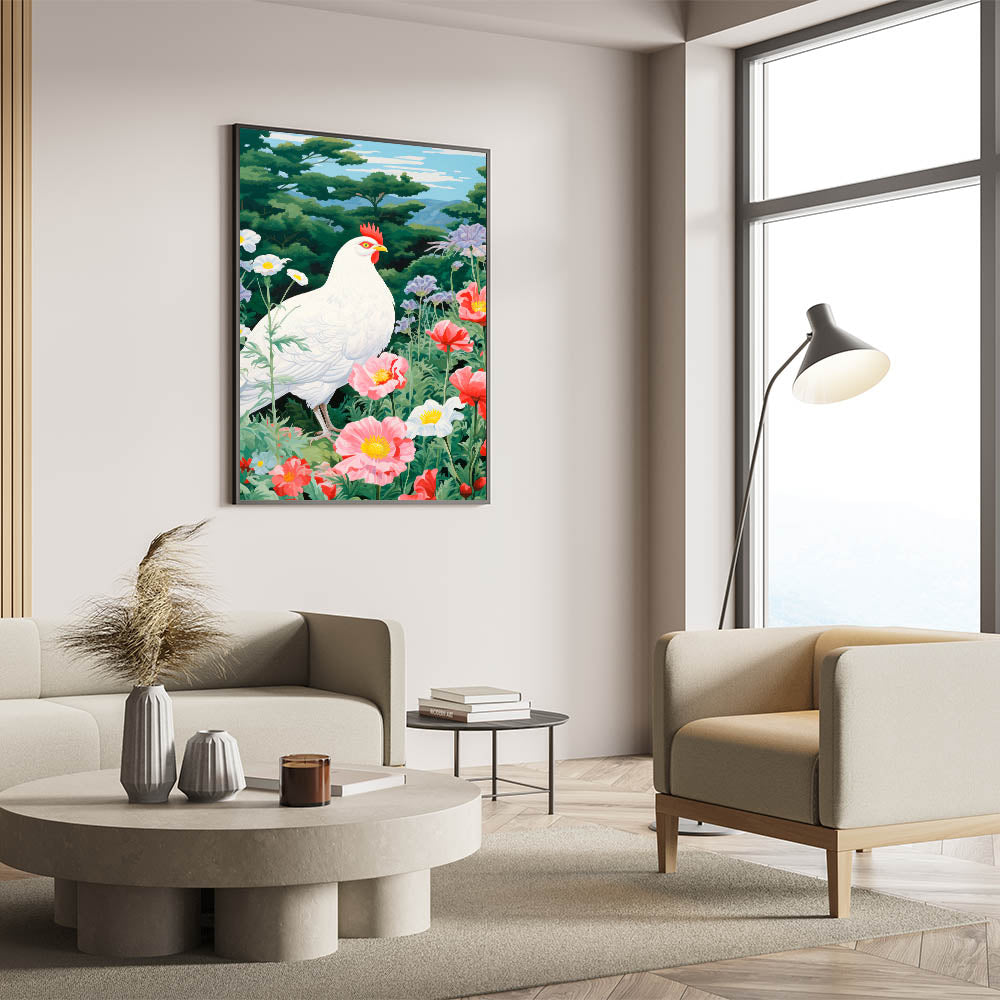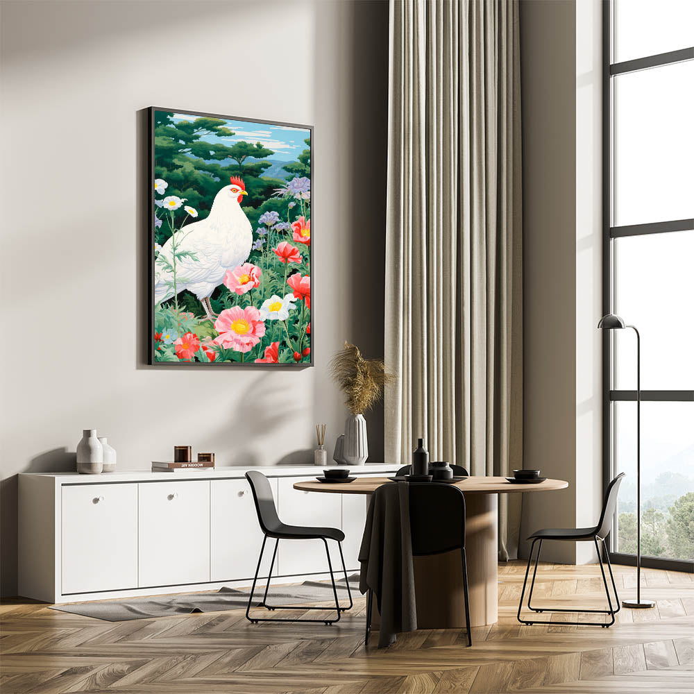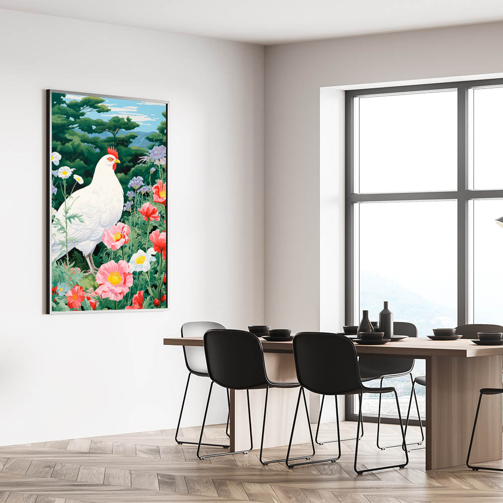 Maximalist Wall Art - Vibrant Nature Scene with White Hen and Flowers