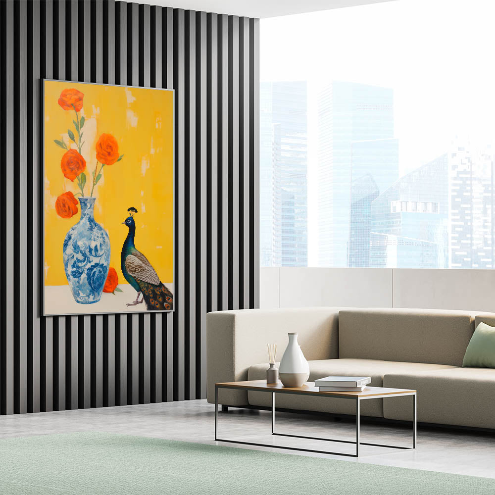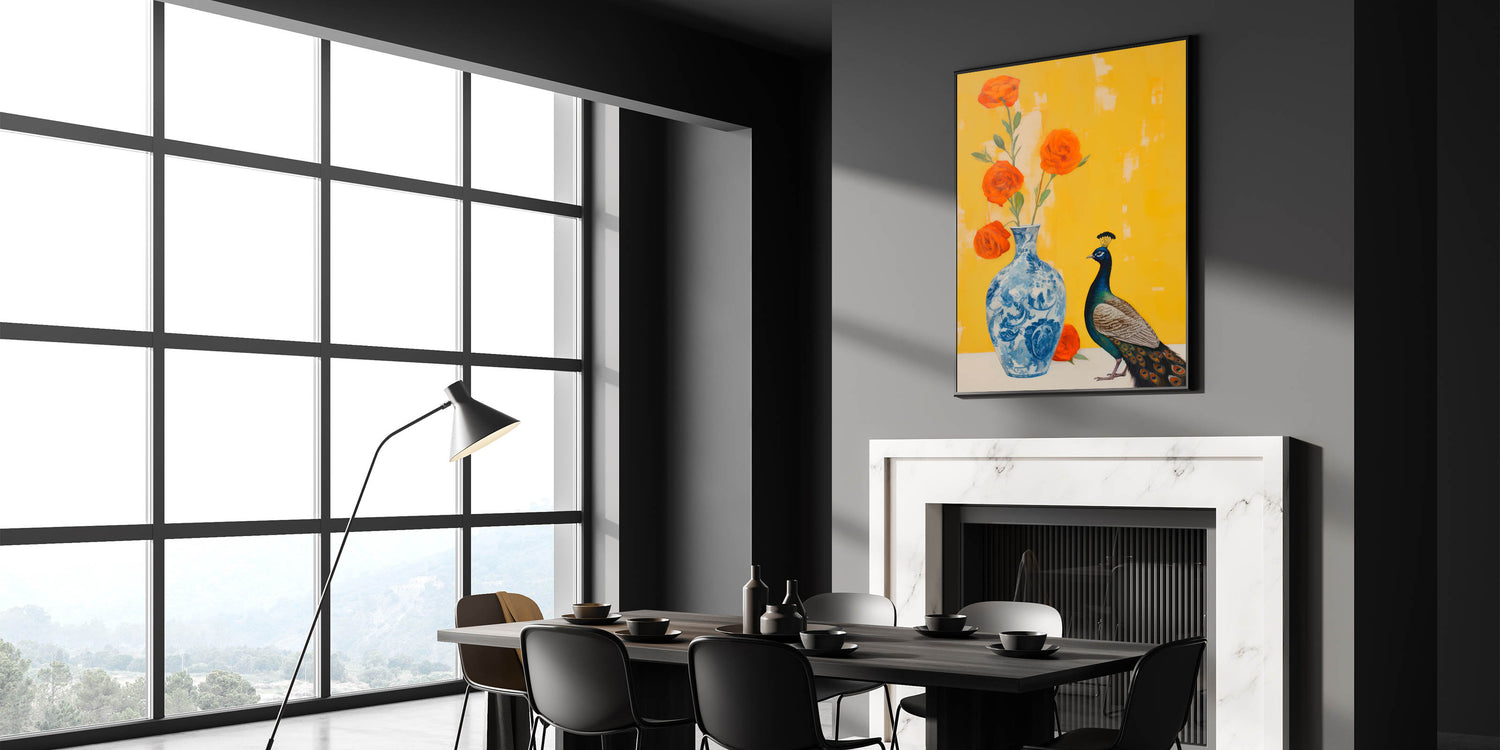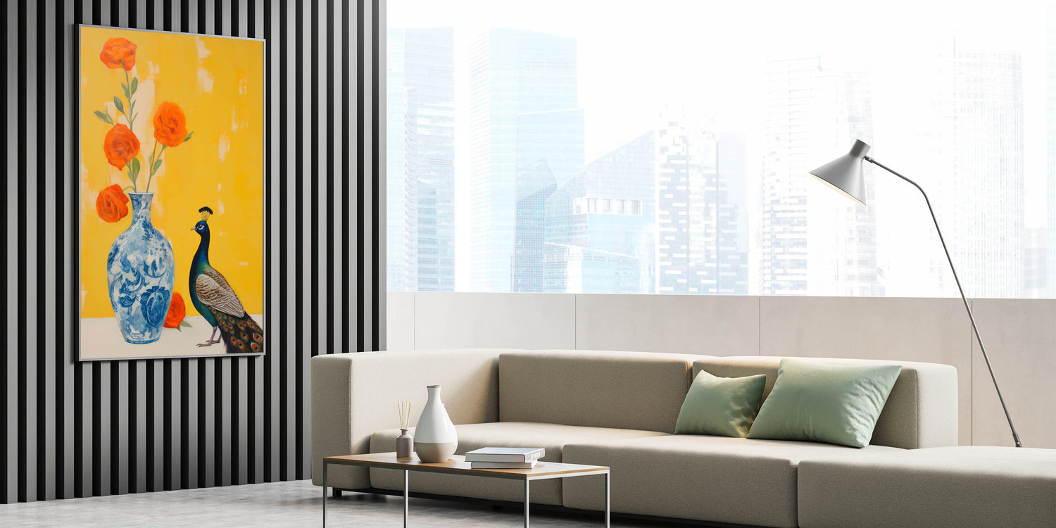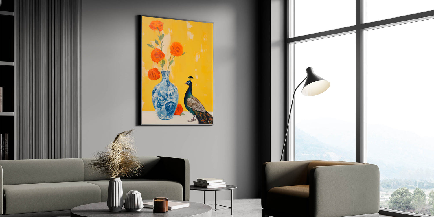• Bold colors and patterns: A rich blue-and-white vase with orange flowers stands out against a bright yellow backdrop, with a detailed peacock adding elegance.