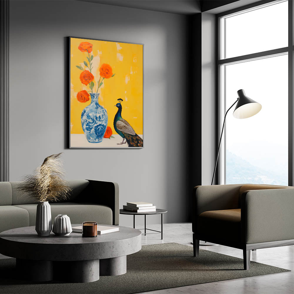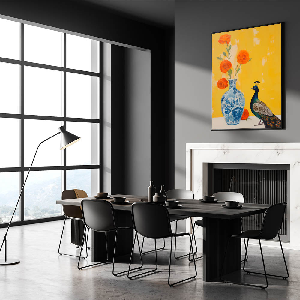 Infuse your space with color and elegance with this Maximalist wall art featuring a majestic peacock standing beside a beautiful blue-and-white porcelain vase filled with vibrant orange flowers. The striking contrast between the bright yellow background and the detailed elements of the peacock and vase creates a dynamic composition that captivates the eye. This artwork blends traditional beauty with bold, modern colors, making it a perfect statement piece for eclectic and vibrant interiors. Ideal for living rooms, dining areas, or creative spaces, this artwork brings a touch of sophistication and lively energy to any room.