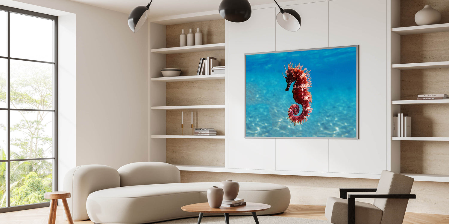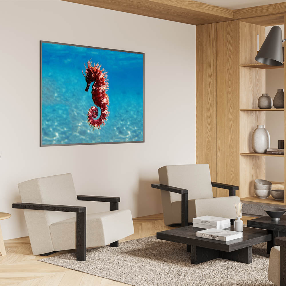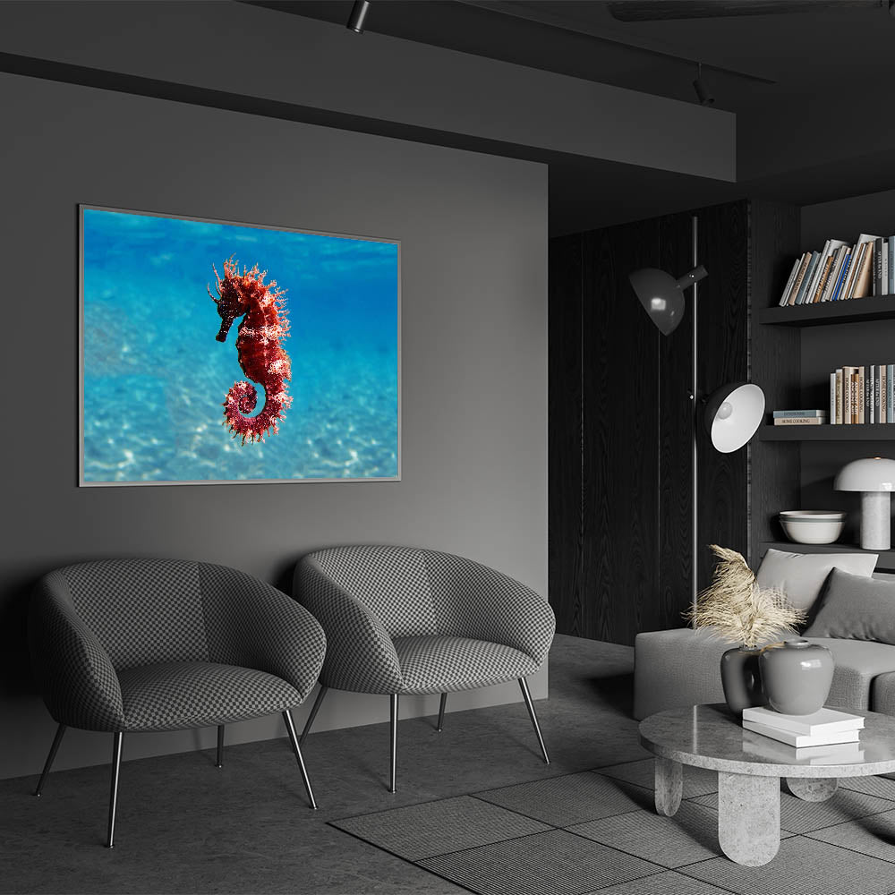 Add a touch of marine elegance to your decor with this striking underwater scene featuring a vibrant seahorse swimming gracefully in the clear Mediterranean Sea. The detailed capture of the seahorse, set against the serene blue of the ocean, makes this piece a perfect choice for anyone seeking Mediterranean-inspired wall decor. This unique artwork is ideal for creating a calming, aquatic atmosphere in any space, from living rooms to bedrooms.