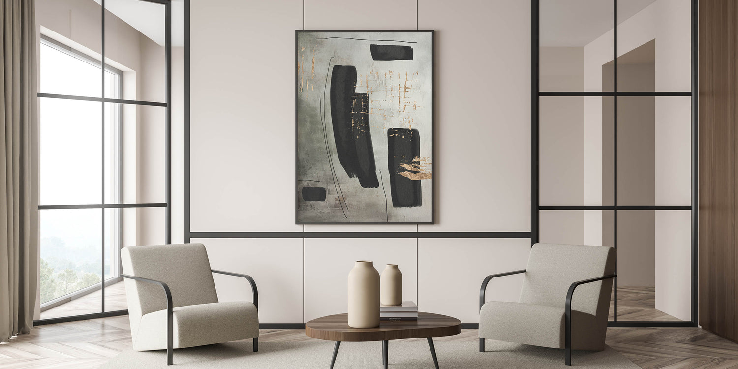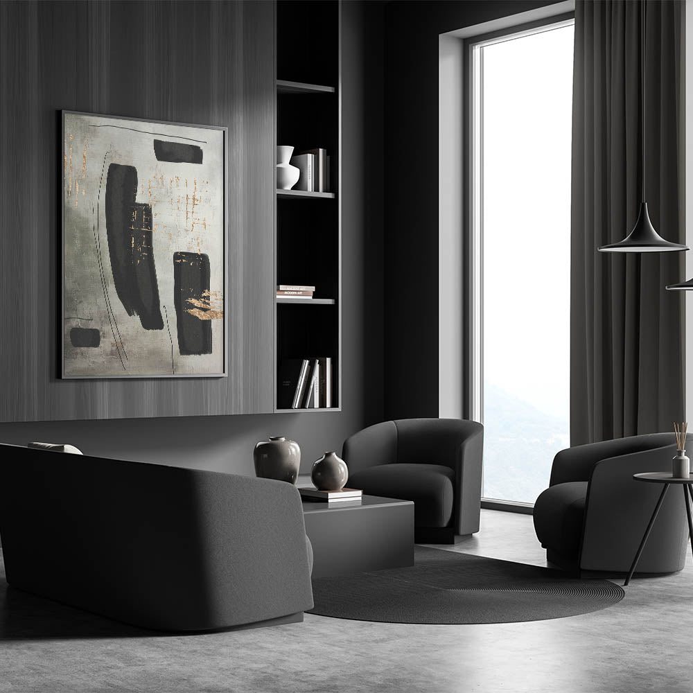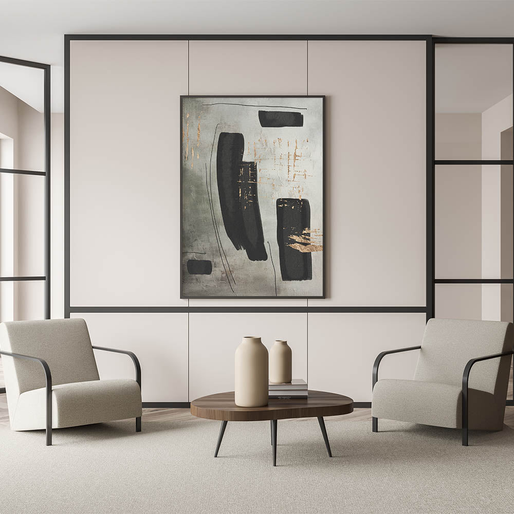 - Design: Modern abstract painting with luxurious black and gold accents on a textured gray background.