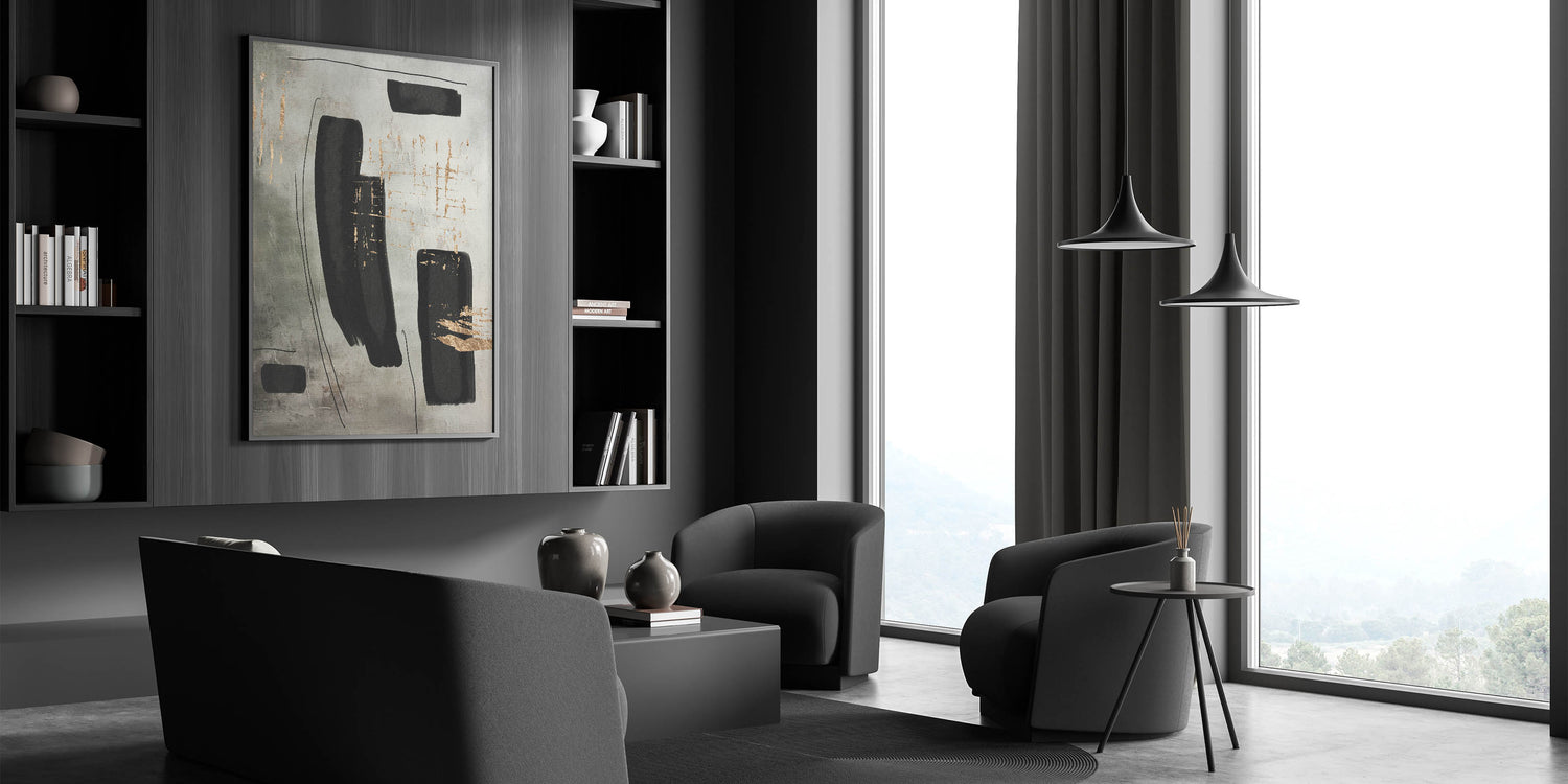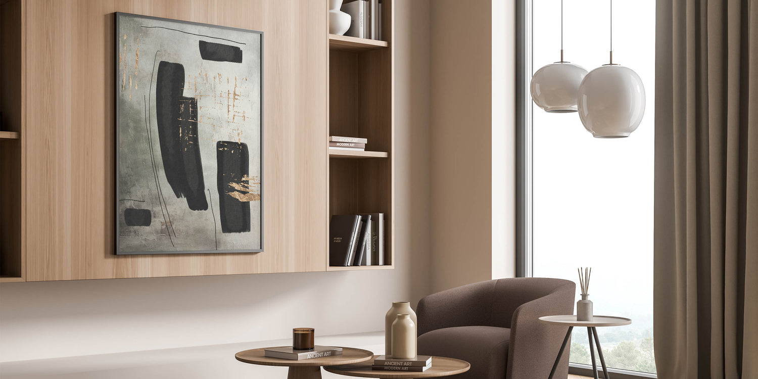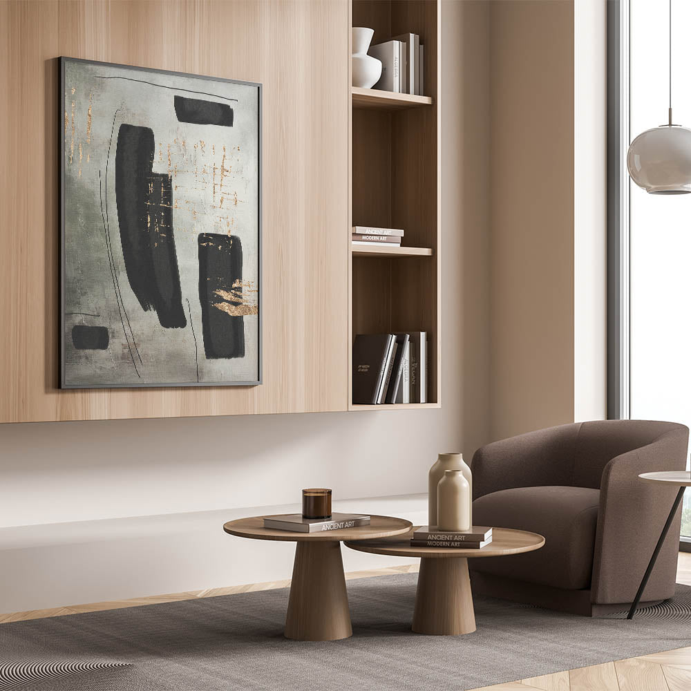 - Design: Modern abstract painting with luxurious black and gold accents on a textured gray background.