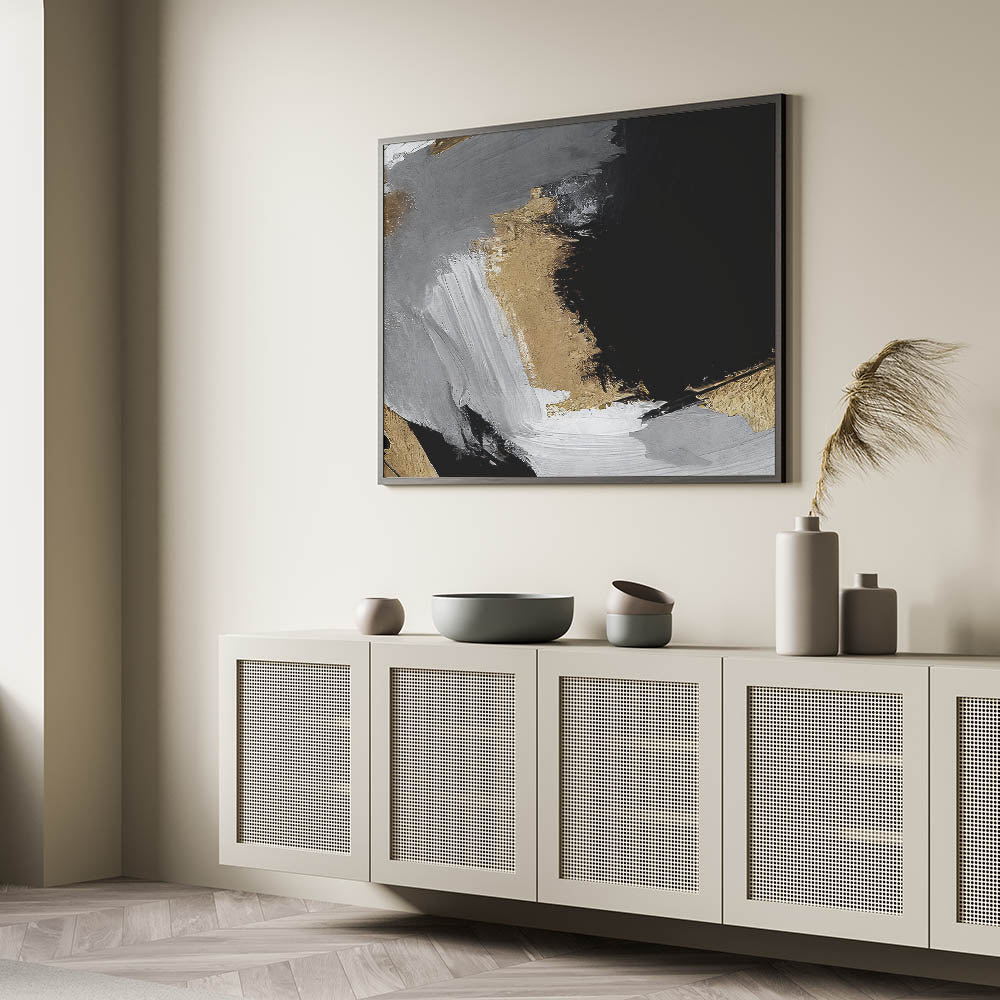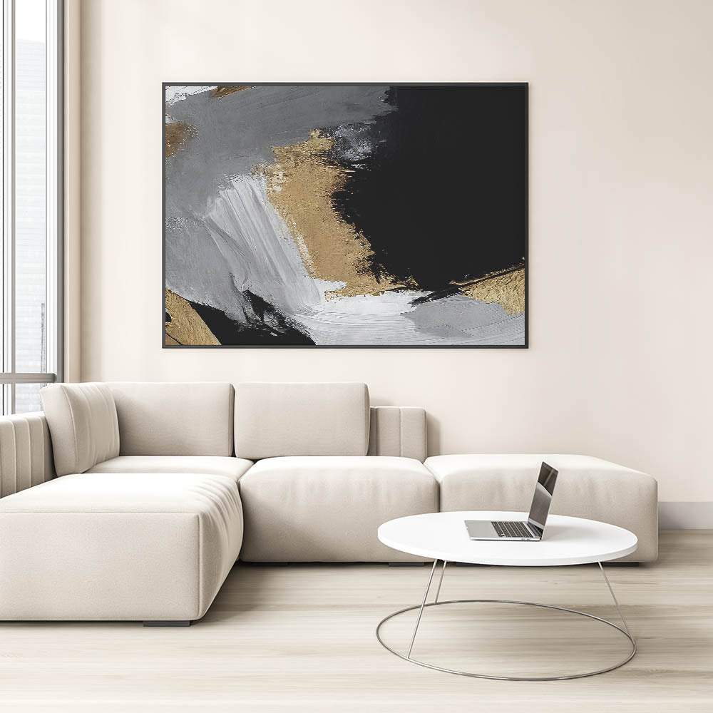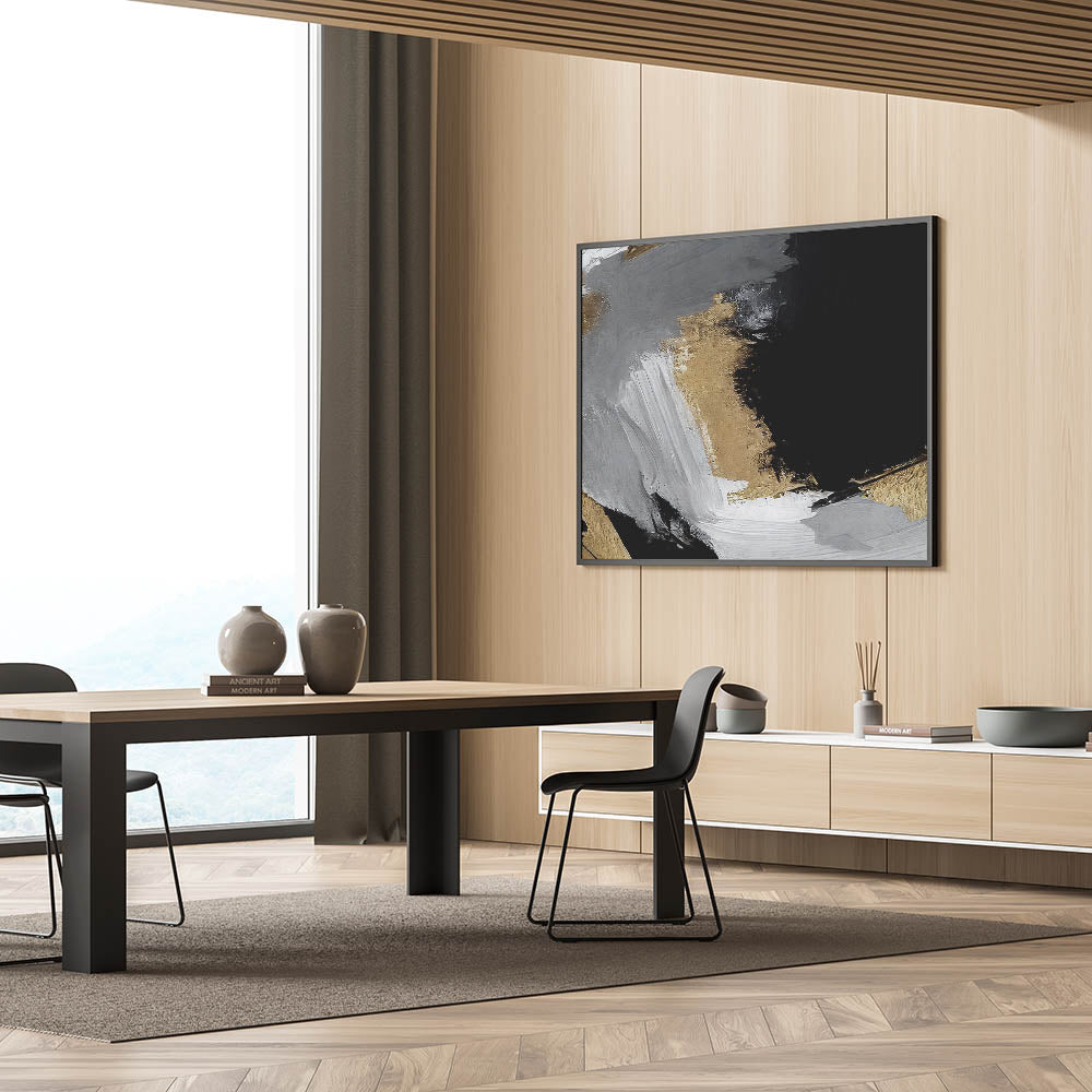 Make a striking statement in your space with this Bold Abstract Strokes Canvas Art. This artwork features a dramatic composition of bold brush strokes in black, gold, and gray, creating a powerful visual impact. The abstract design blends modern aesthetics with a touch of luxury, making it a perfect addition to any contemporary setting. The contrast of dark and metallic tones adds depth and intrigue, transforming any room into a sophisticated environment.