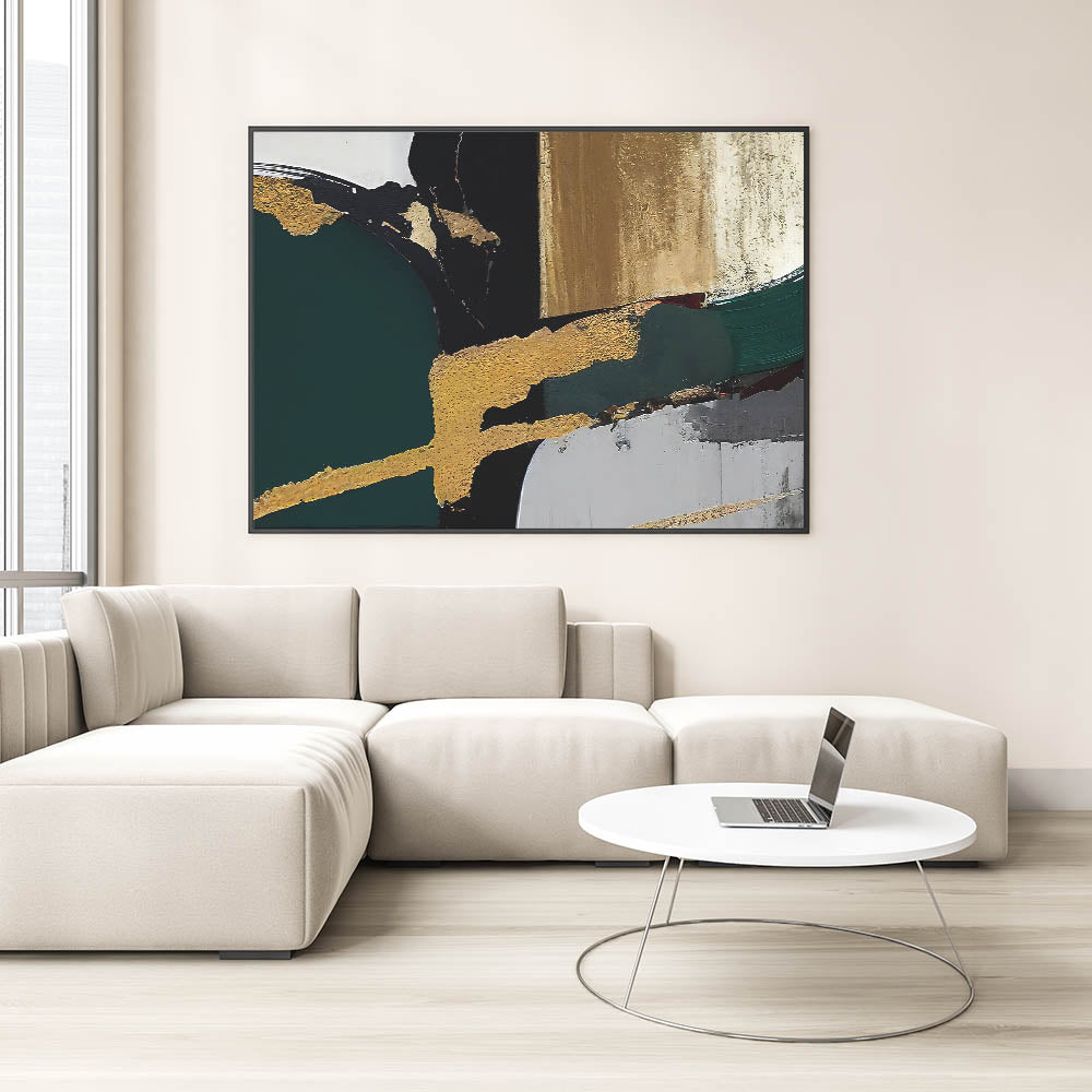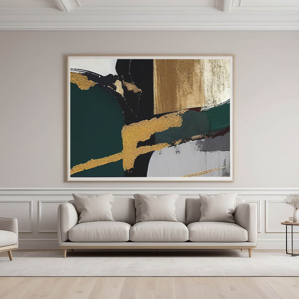 Make a bold statement in your space with this Geometric Abstract Canvas Art, featuring a striking blend of rich green, gold, and black tones. The artwork’s sharp geometric lines and textured brush strokes create a dynamic composition that adds depth and sophistication to any room. The luxurious combination of colors, with the deep green and metallic gold, evokes a sense of elegance and modernity, perfect for contemporary interiors.