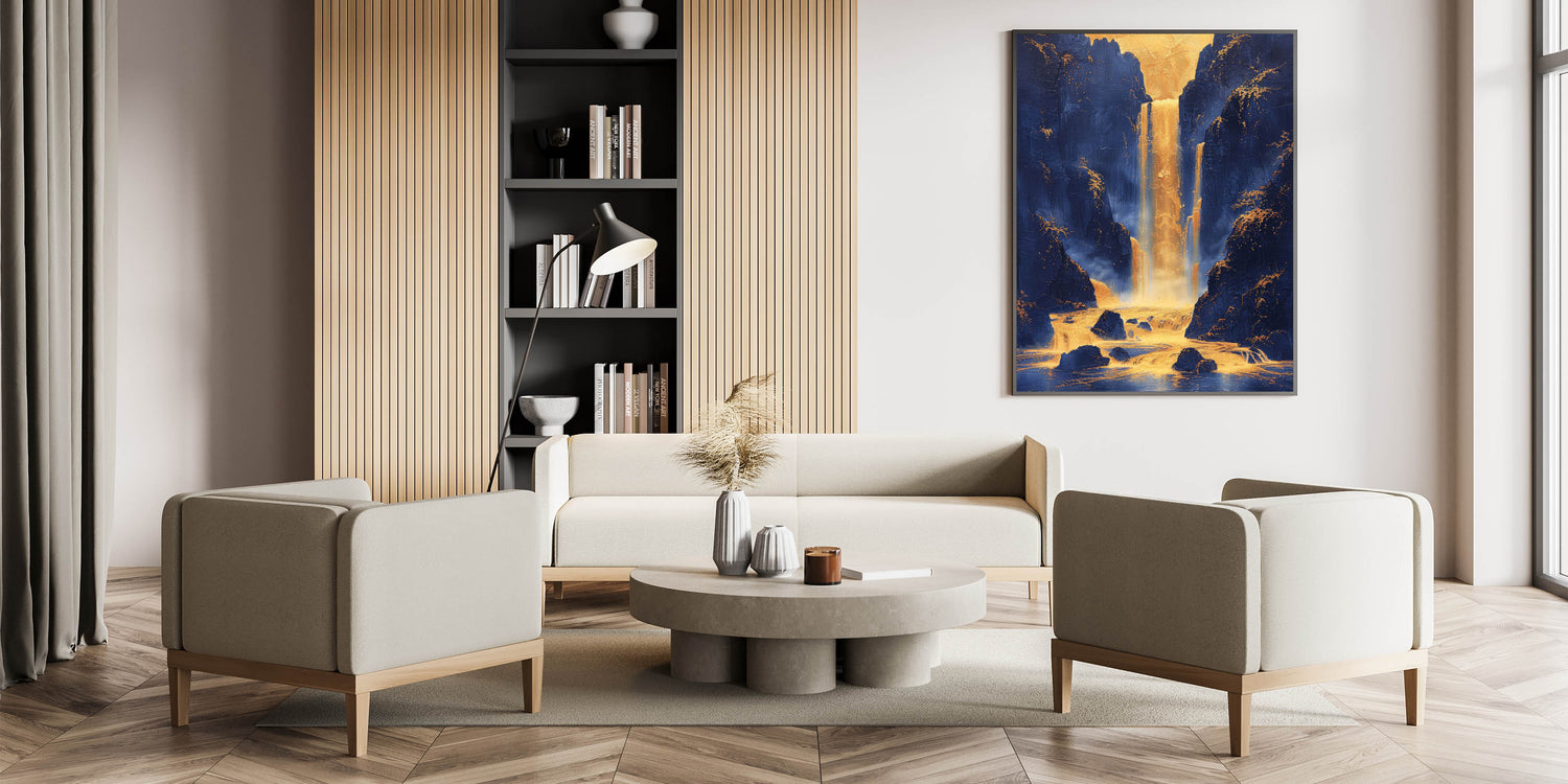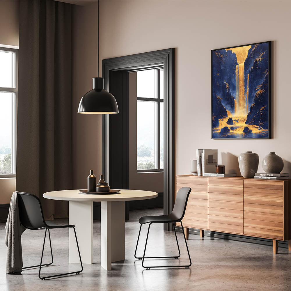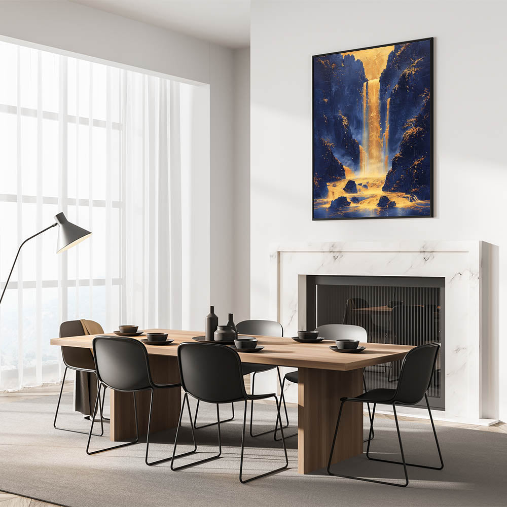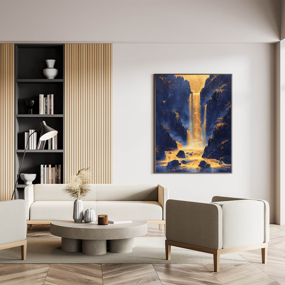 Immerse your space in luxury with this stunning Glam Wall Art, featuring a striking waterfall set against deep blue cliffs and illuminated by bold gold accents. The powerful cascade of water, depicted in vibrant gold, stands out dramatically, creating a focal point that exudes both strength and elegance. Perfect for those seeking glamorous art pieces, this artwork brings modern glam decor to life, making it an excellent choice for any luxury home decor scheme. Whether displayed in a living room, bedroom, or office, this piece offers a sophisticated touch to any glam-inspired interior.