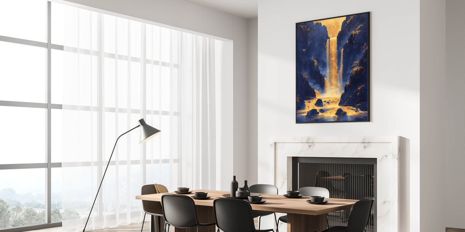 Bring this dramatic waterfall scene into your home for a glamorous statement piece that combines nature’s raw beauty with a touch of chic sophistication. Add a sense of elegance and luxury with this glam wall art from our exclusive collection.