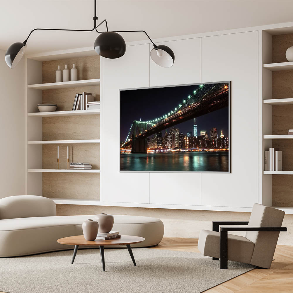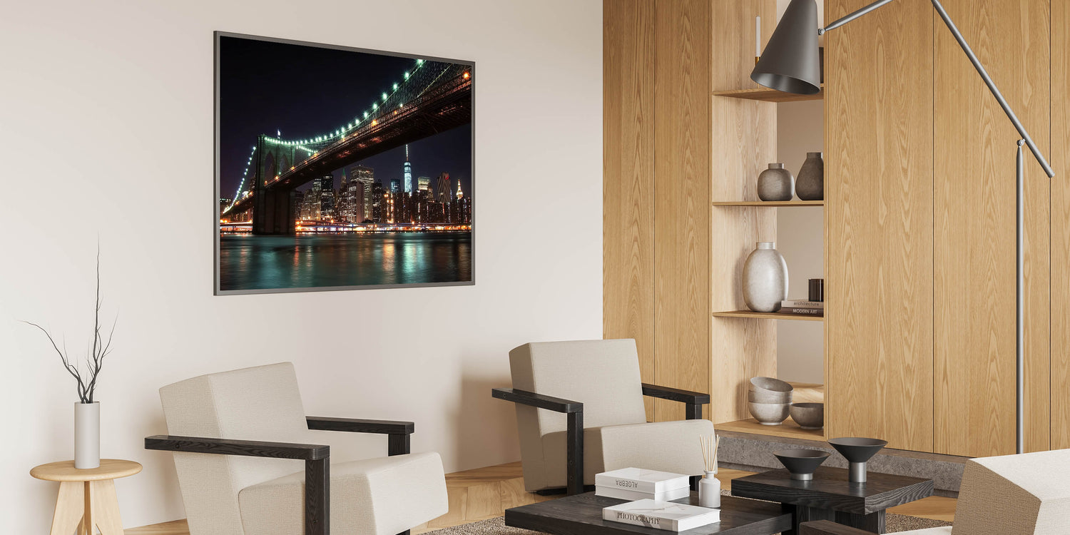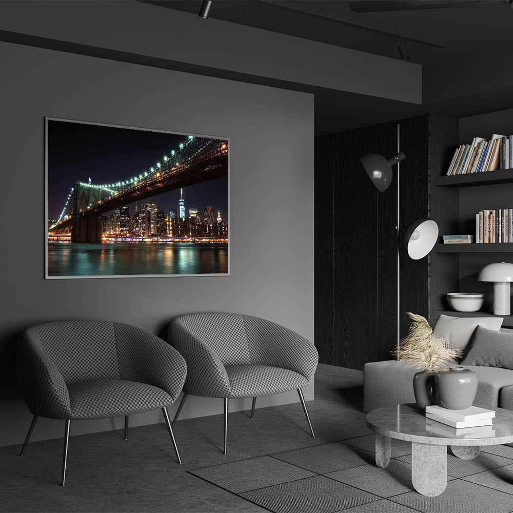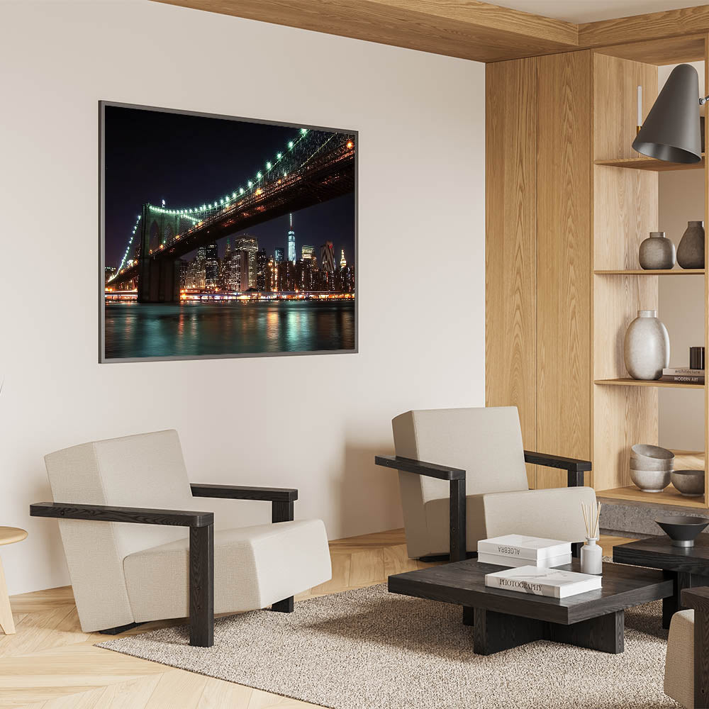 Capture the dazzling energy of New York City with this breathtaking Brooklyn Bridge photography print. Featuring the iconic bridge illuminated at night, set against a sparkling Manhattan skyline, this artwork embodies the vibrancy and allure of urban life. The glowing lights reflecting on the East River add depth and elegance, making this piece ideal for modern and contemporary interiors. Whether displayed in living rooms, offices, or loft spaces, this scenic bridge art adds a touch of sophistication and dynamism to any decor.
