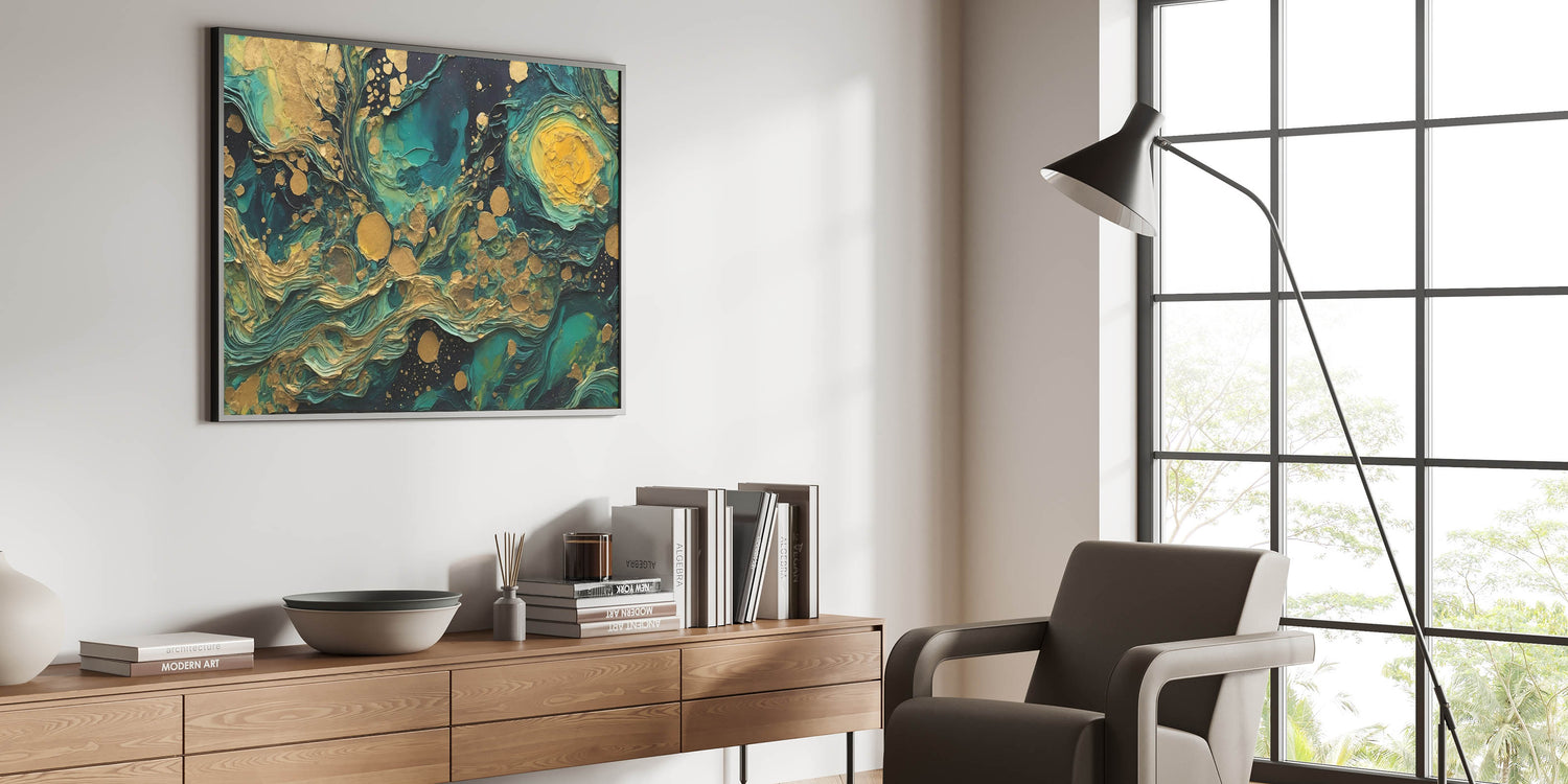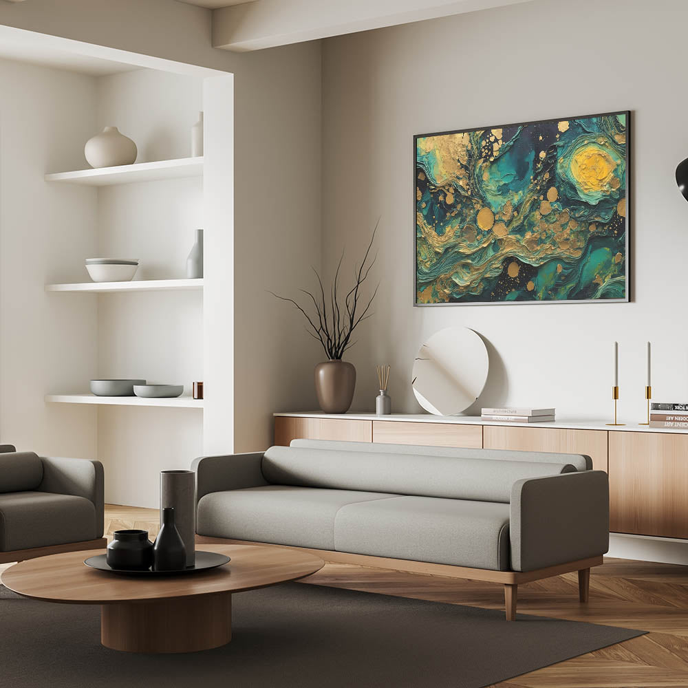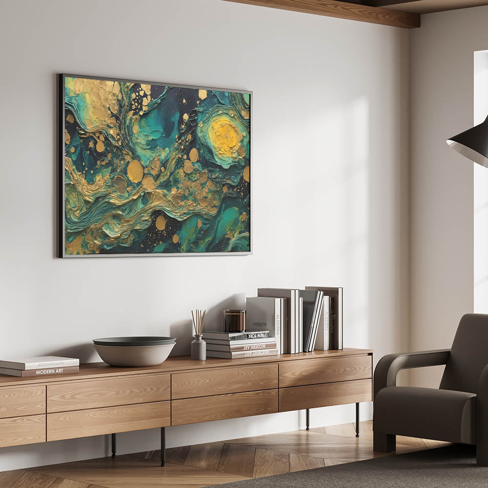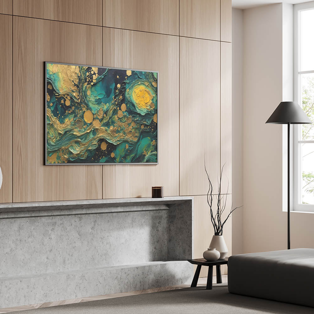 Immerse your space in the mesmerizing beauty of the Cosmic Swirl Abstract Art. This stunning piece features a captivating blend of golden and teal hues, evoking the ethereal essence of a cosmic landscape. Perfect for adding a touch of elegance and mystery to any room, this artwork is an ideal addition to modern and eclectic interiors.