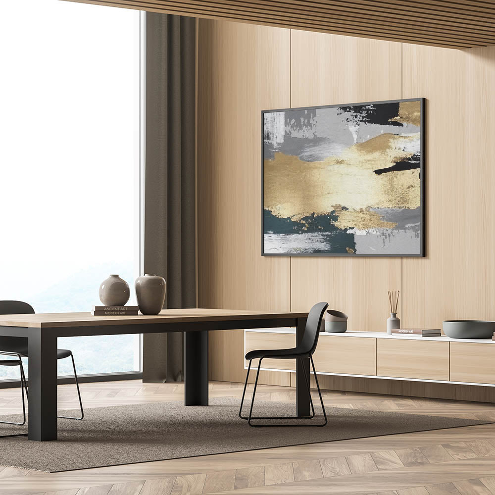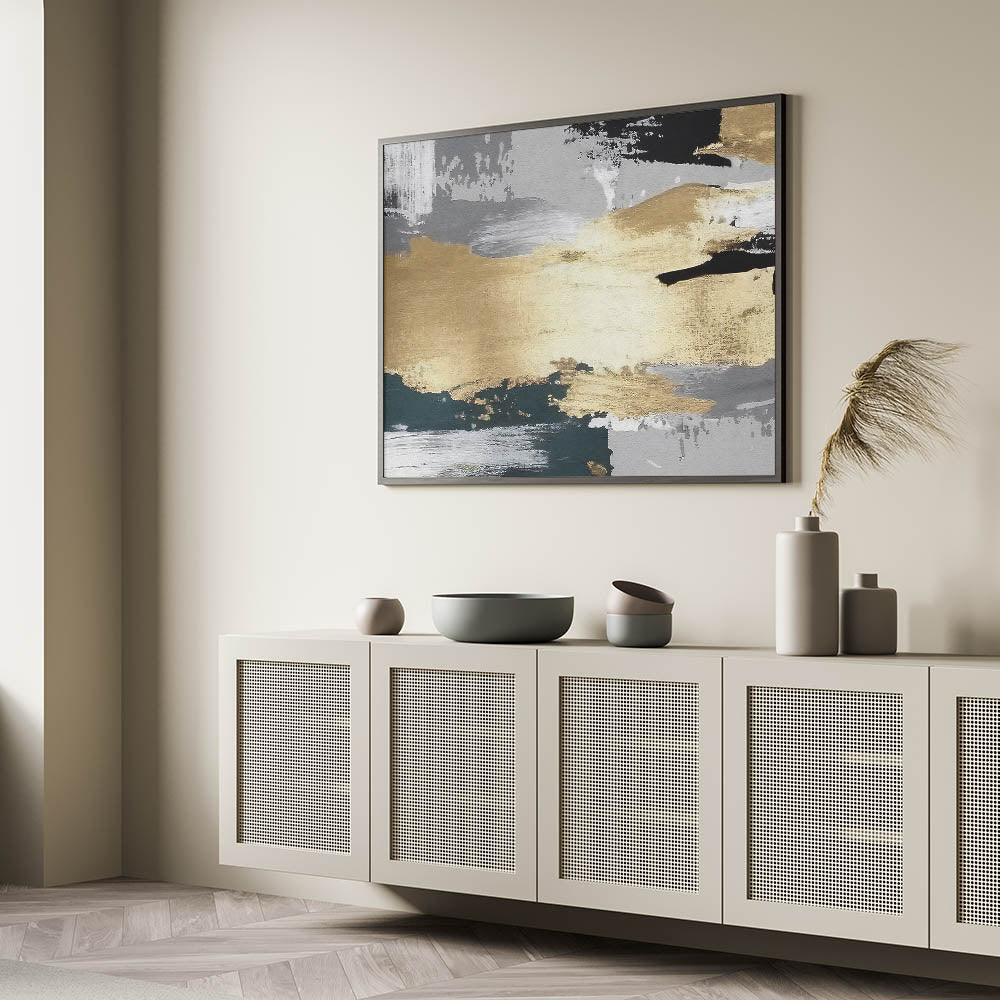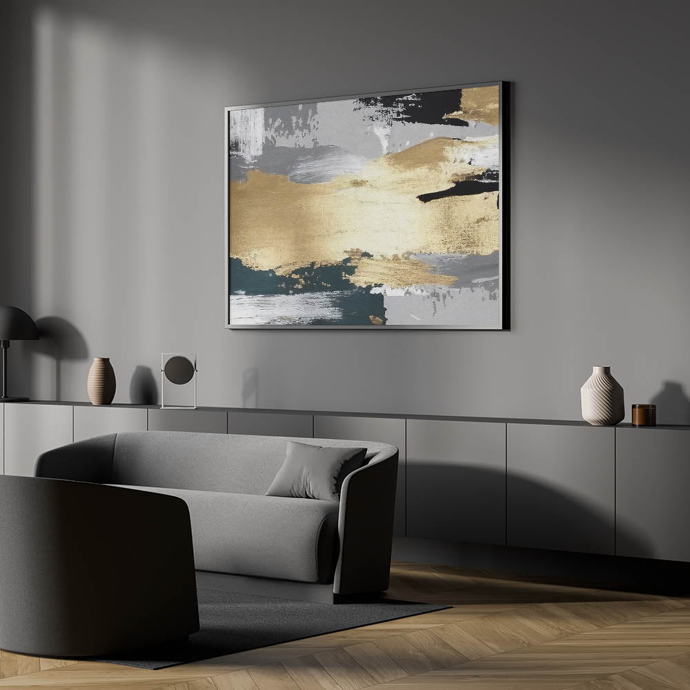 This abstract piece, with its luxurious gold accents and dynamic brush strokes, is more than just wall art—it's a statement of style and elegance. Enhance your space with this timeless artwork that radiates sophistication and artistic flair.