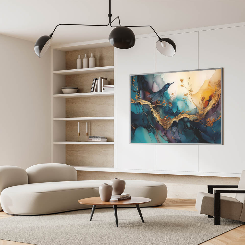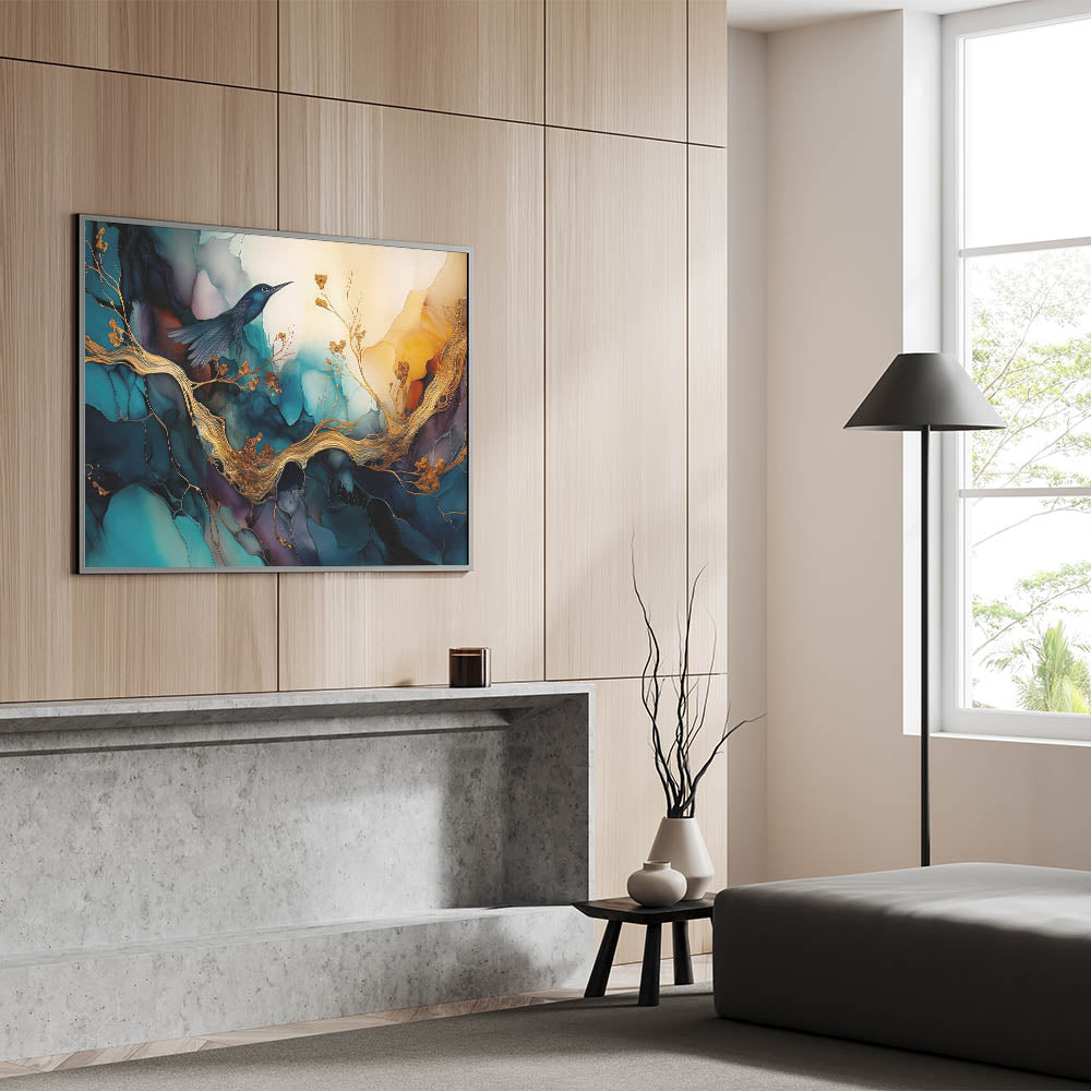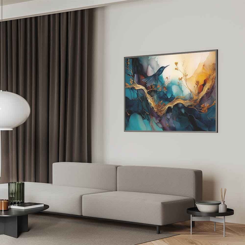 Add a touch of elegance and tranquility to your home with our "Elegant Figurative Abstract Wall Art - Hummingbird and Golden Branches." This stunning artwork features a delicate hummingbird perched on golden branches, set against a backdrop of vibrant teal and deep blue hues. The intricate details and rich colors create a serene and captivating scene, perfect for enhancing any living space.