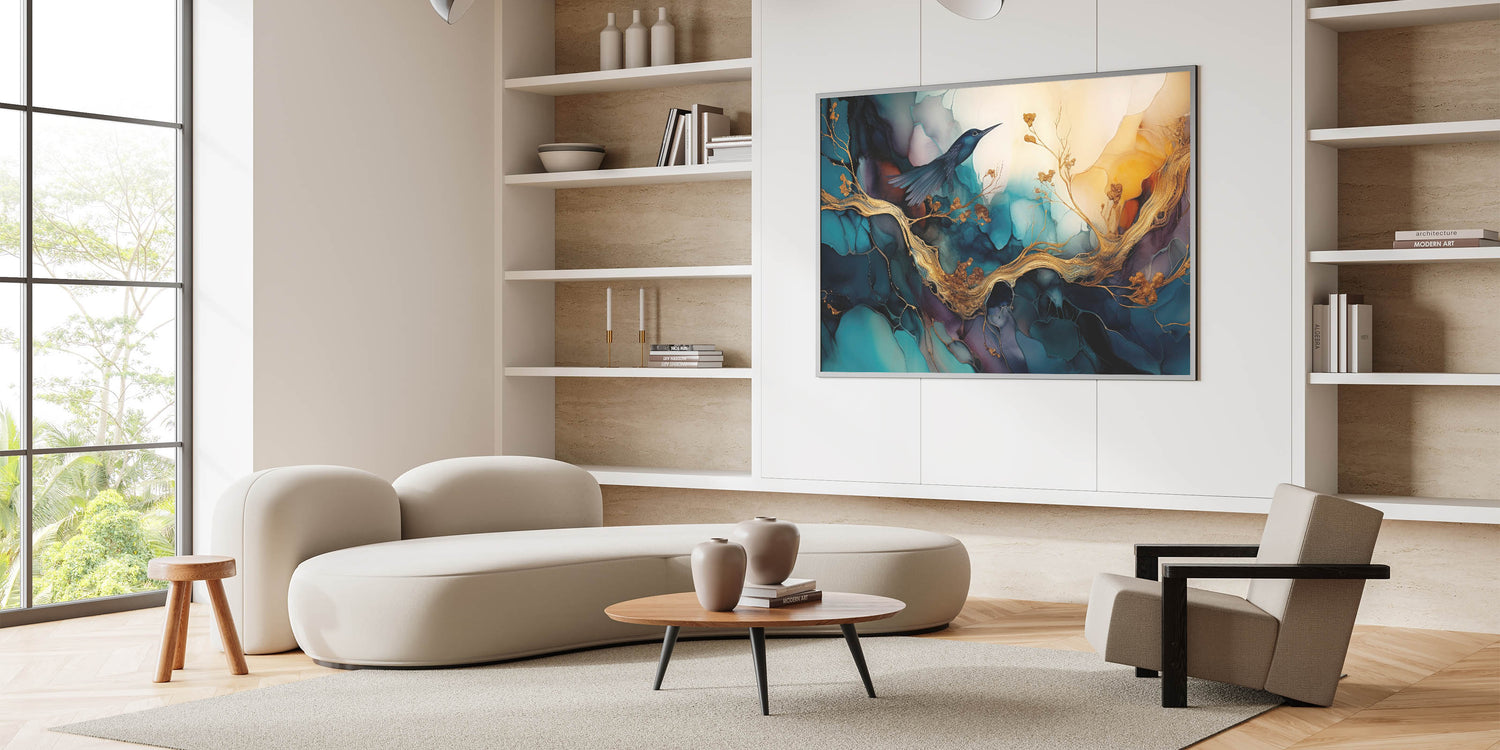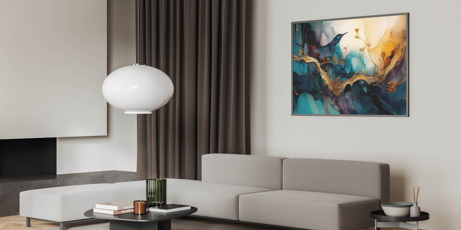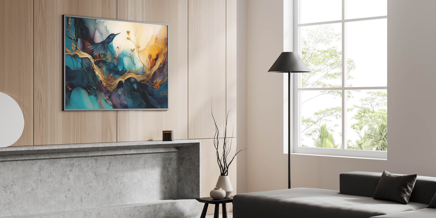 Add a touch of elegance and tranquility to your home with our "Elegant Figurative Abstract Wall Art - Hummingbird and Golden Branches." This stunning artwork features a delicate hummingbird perched on golden branches, set against a backdrop of vibrant teal and deep blue hues. The intricate details and rich colors create a serene and captivating scene, perfect for enhancing any living space.
