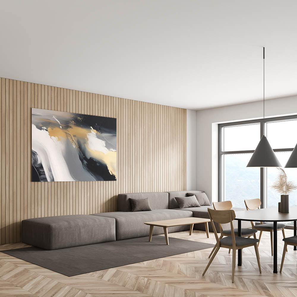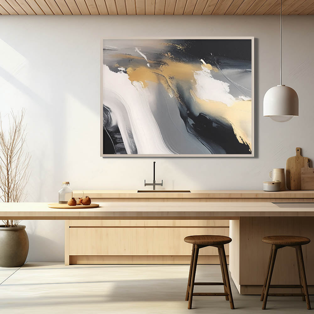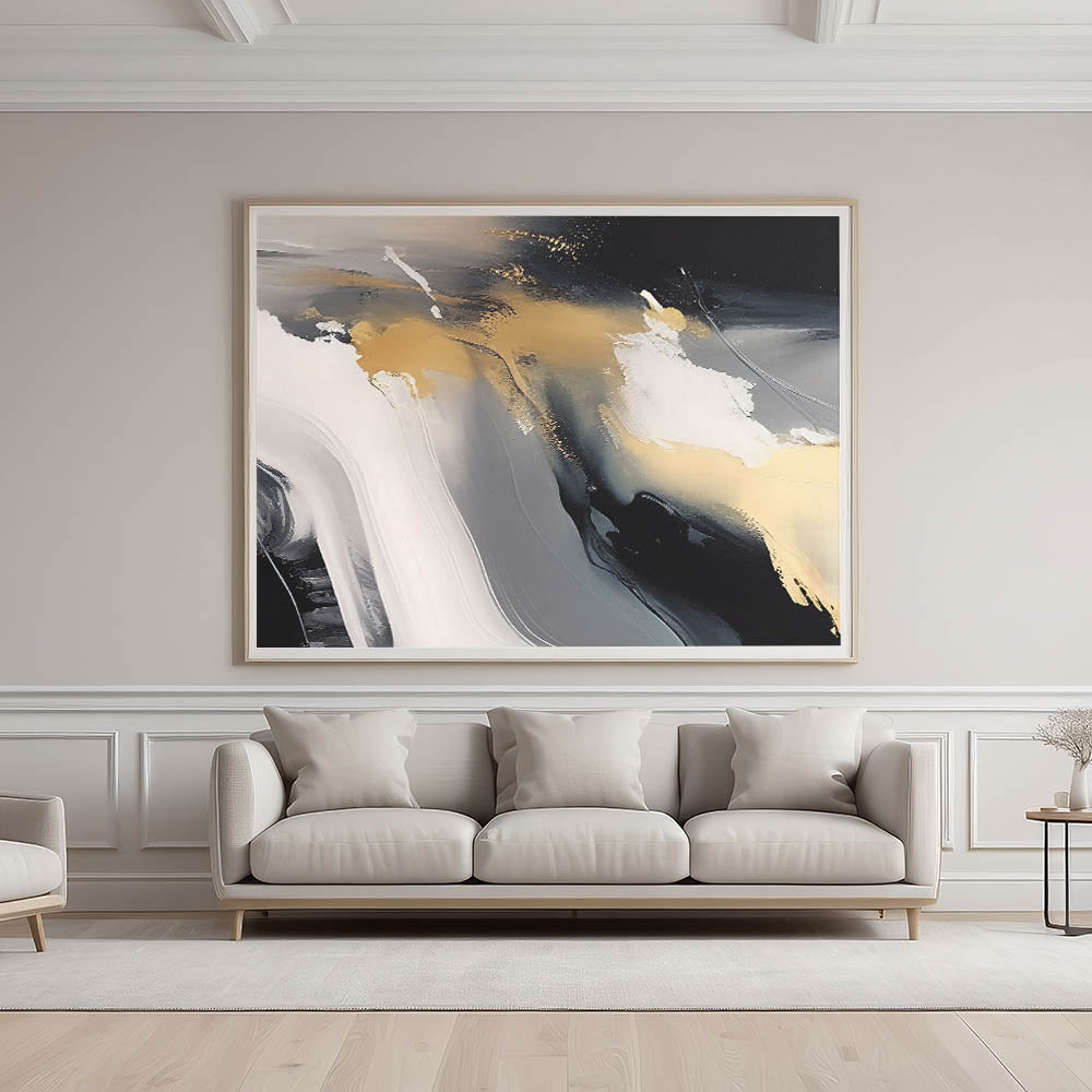 Enhance your space with this striking Geometric Line Art piece, featuring bold black, gold, and white strokes that create a dynamic and luxurious visual effect. The flowing lines and rich color palette add depth and sophistication, making it a perfect addition to any contemporary or modern interior. The contrast between the metallic gold and monochromatic black and white tones gives this artwork a timeless appeal.