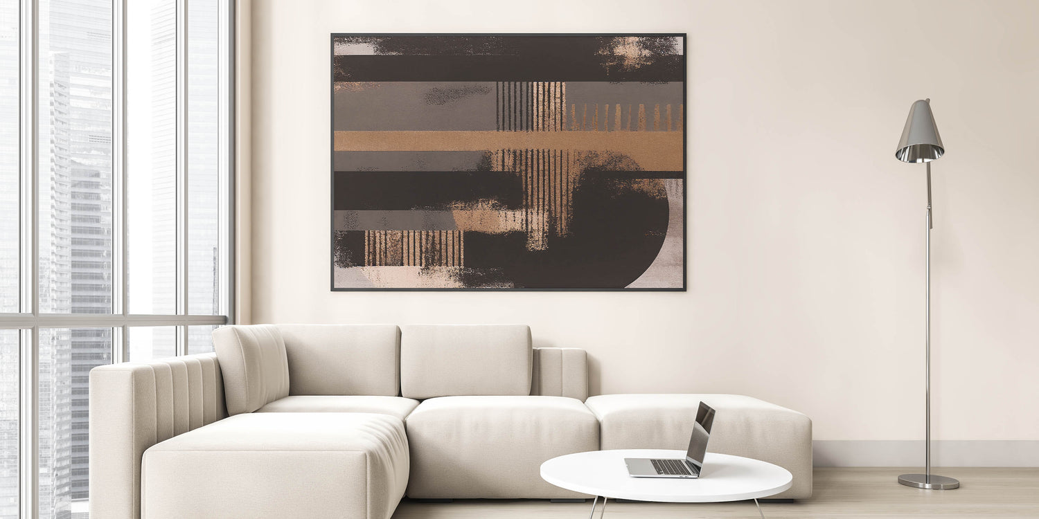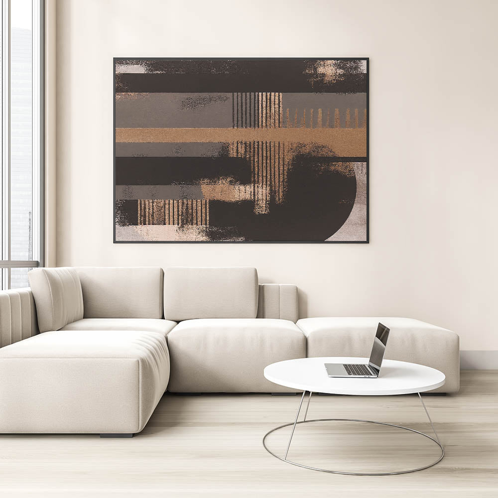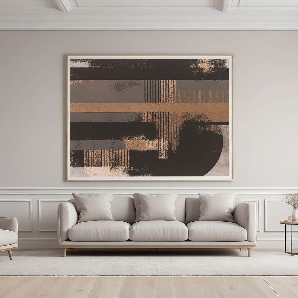 Introduce a bold and sophisticated touch to your space with this geometric strokes and lines abstract art. The design features striking linear patterns and bold shapes in rich tones of black, metallic bronze, and muted grays. The textured elements and sharp contrasts create a powerful visual statement, making it an ideal piece for modern and industrial interiors.