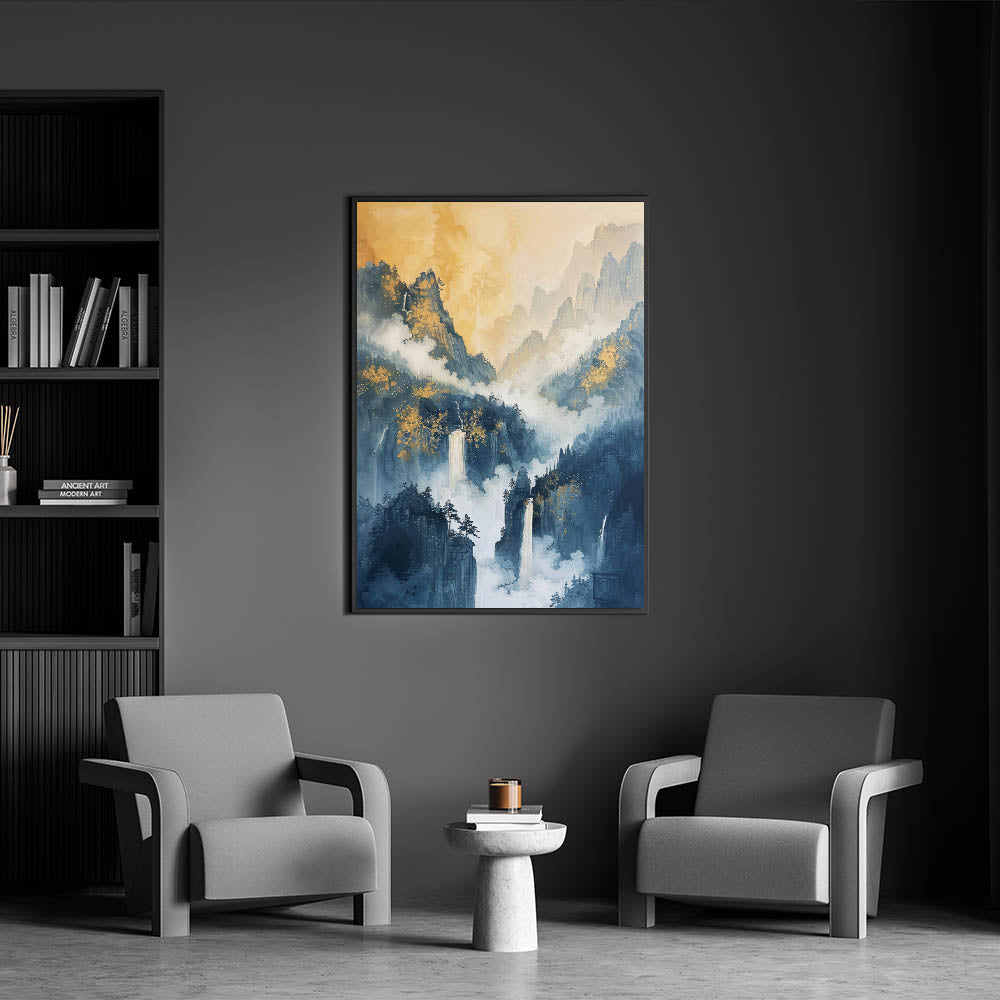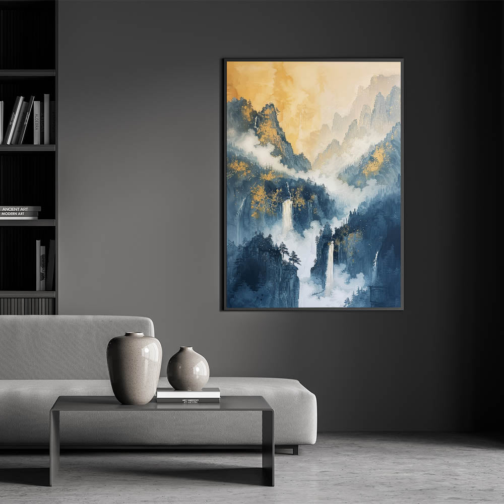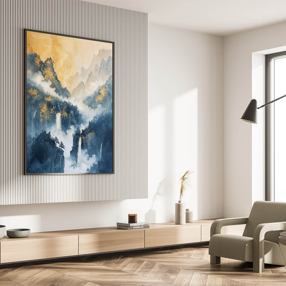 Introduce a sense of opulence and natural serenity to your space with this stunning Glam Wall Art. Featuring a majestic mountainous landscape adorned with cascading waterfalls, this piece incorporates luxurious blue tones with shimmering gold accents. The elegant mist flows through the valleys, creating a dreamlike ambiance that complements any glamorous interior. This chic artwork blends nature's beauty with sophisticated glam style, perfect for transforming your living room, bedroom, or office into a modern retreat.