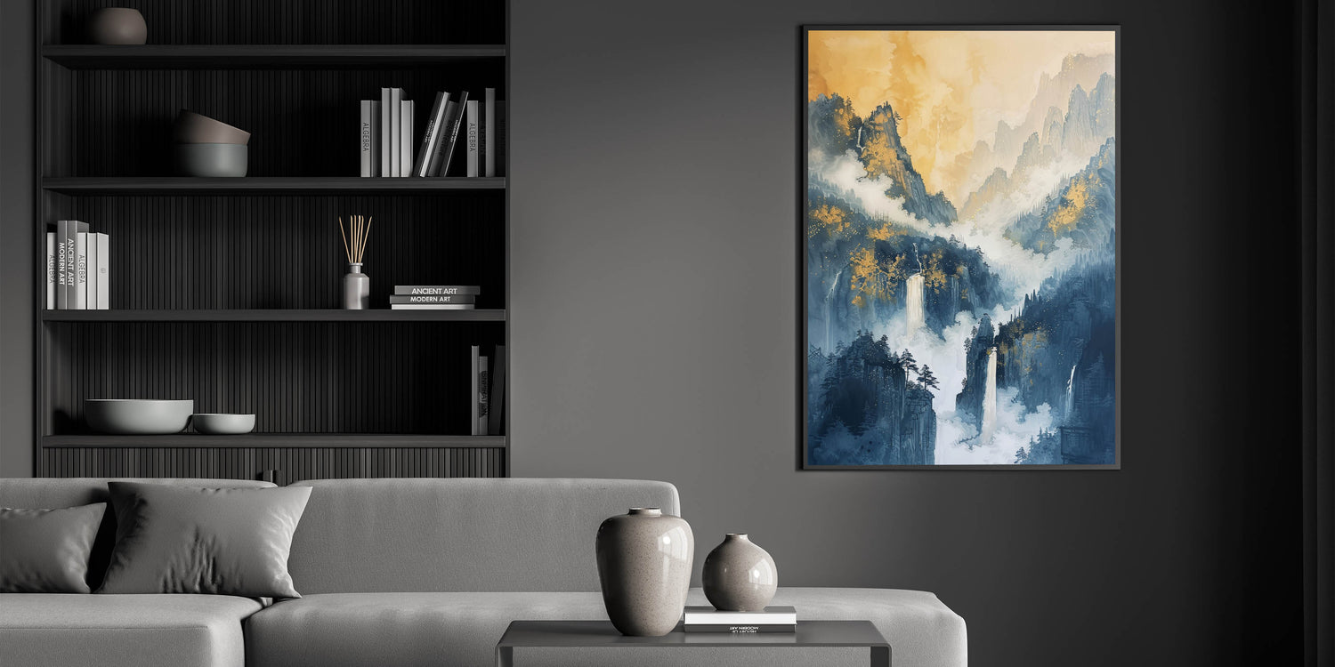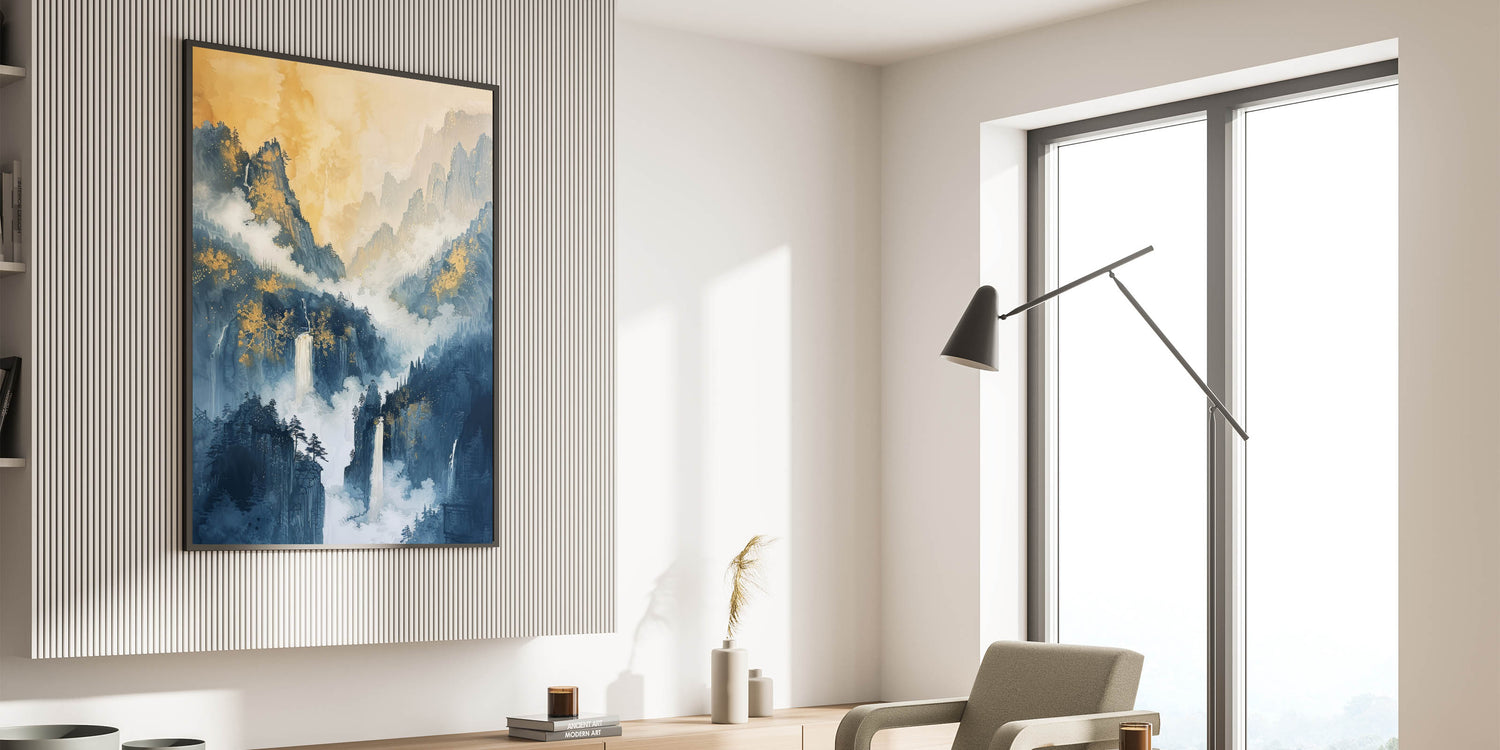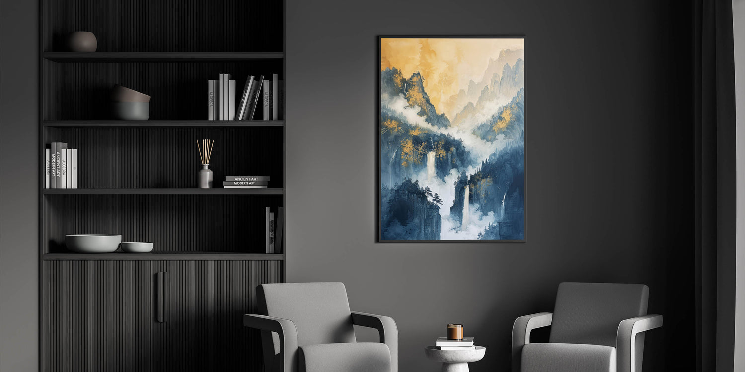 Introduce a sense of opulence and natural serenity to your space with this stunning Glam Wall Art. Featuring a majestic mountainous landscape adorned with cascading waterfalls, this piece incorporates luxurious blue tones with shimmering gold accents. The elegant mist flows through the valleys, creating a dreamlike ambiance that complements any glamorous interior. This chic artwork blends nature's beauty with sophisticated glam style, perfect for transforming your living room, bedroom, or office into a modern retreat.