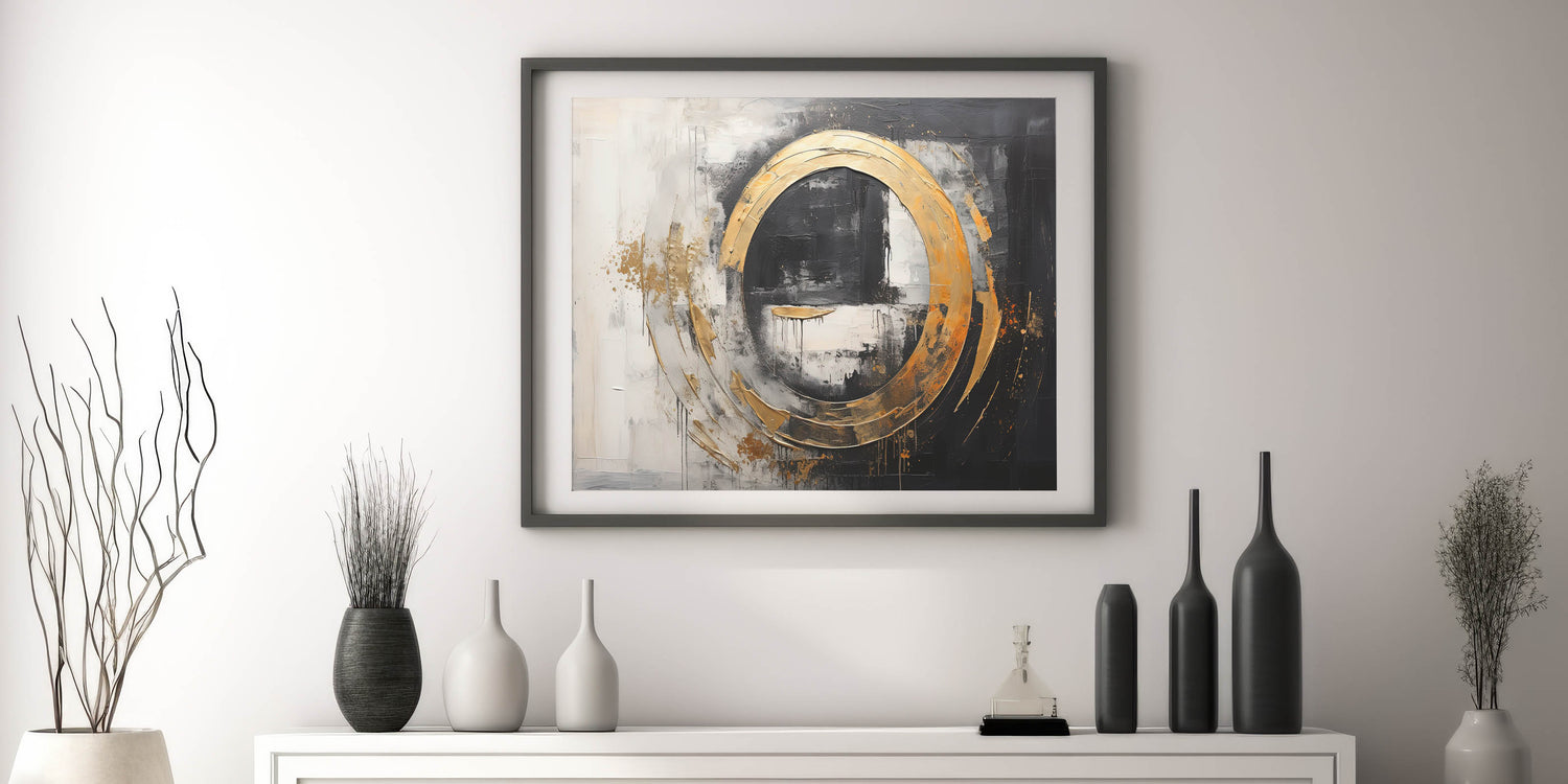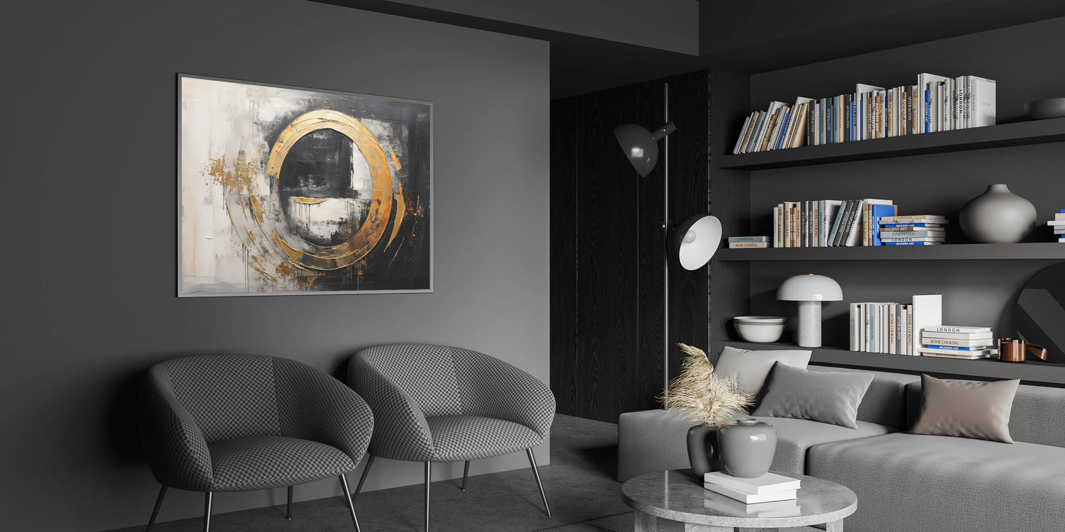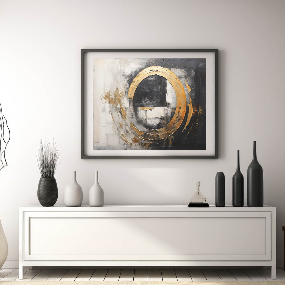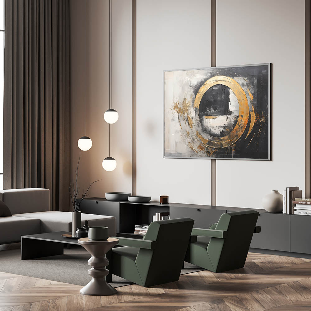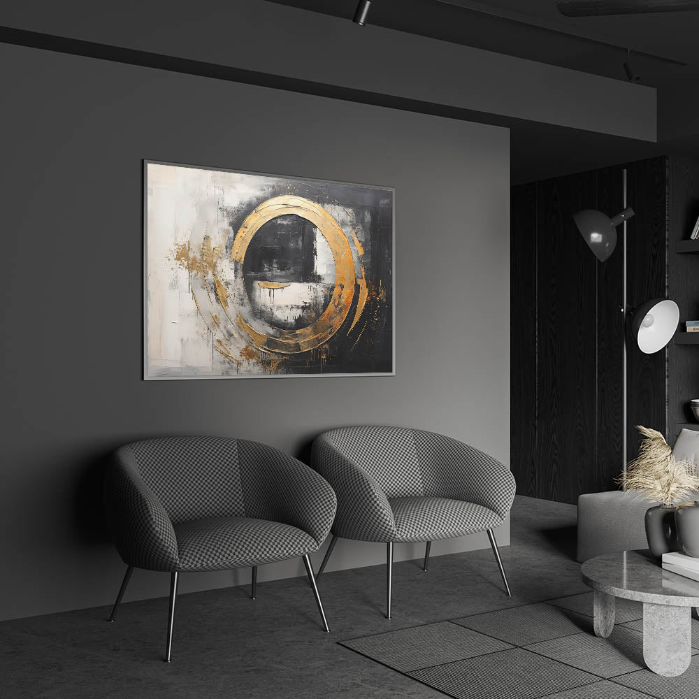 Introduce a touch of luxury to your space with this Gold and Black Abstract Strokes Canvas, featuring a bold geometric design and dynamic brush strokes. The artwork combines a sleek black and white background with metallic gold accents, creating a striking contrast that draws the eye. The circular patterns and splashes of gold give the piece a modern yet timeless appeal, making it a perfect choice for contemporary and industrial interiors.