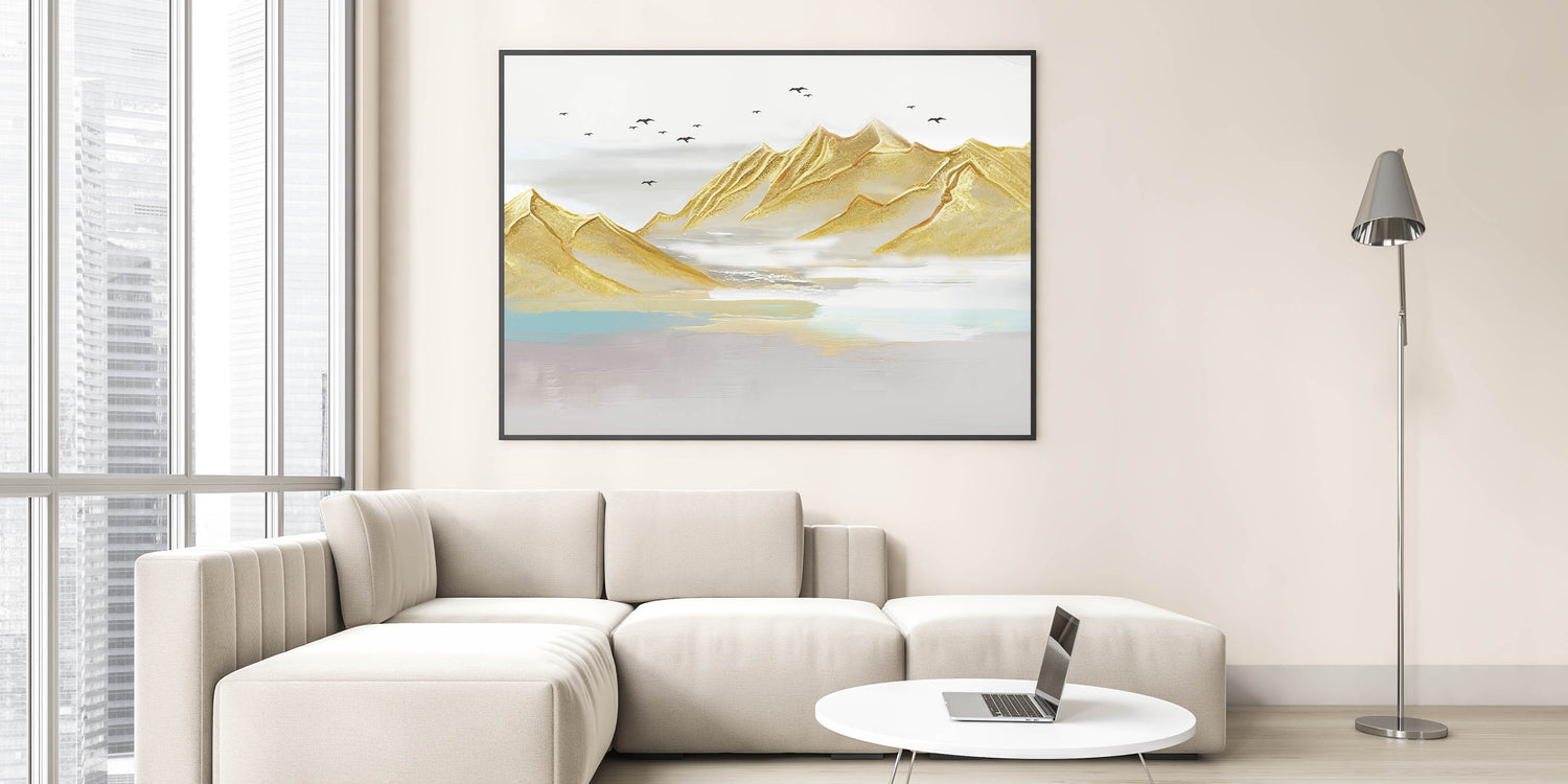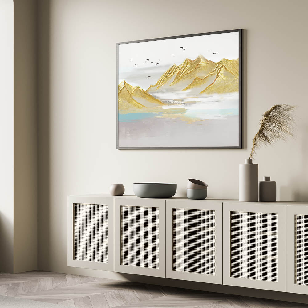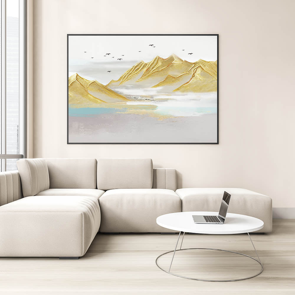 - Design: Stunning abstract strokes and lines forming a golden mountain range, perfect for enhancing your living space with a touch of elegance.