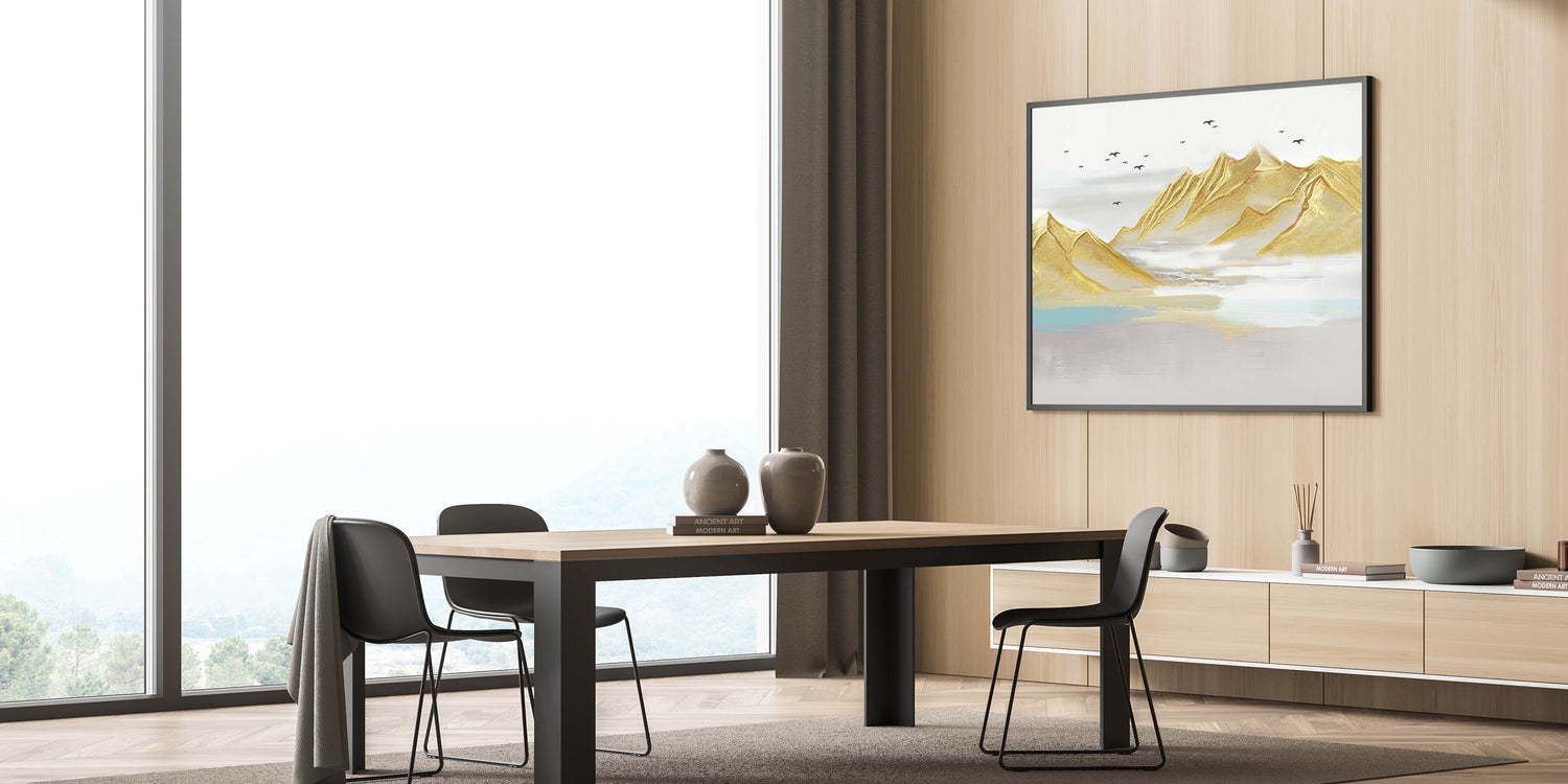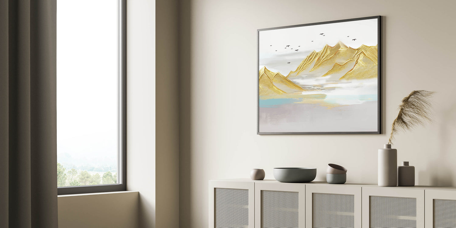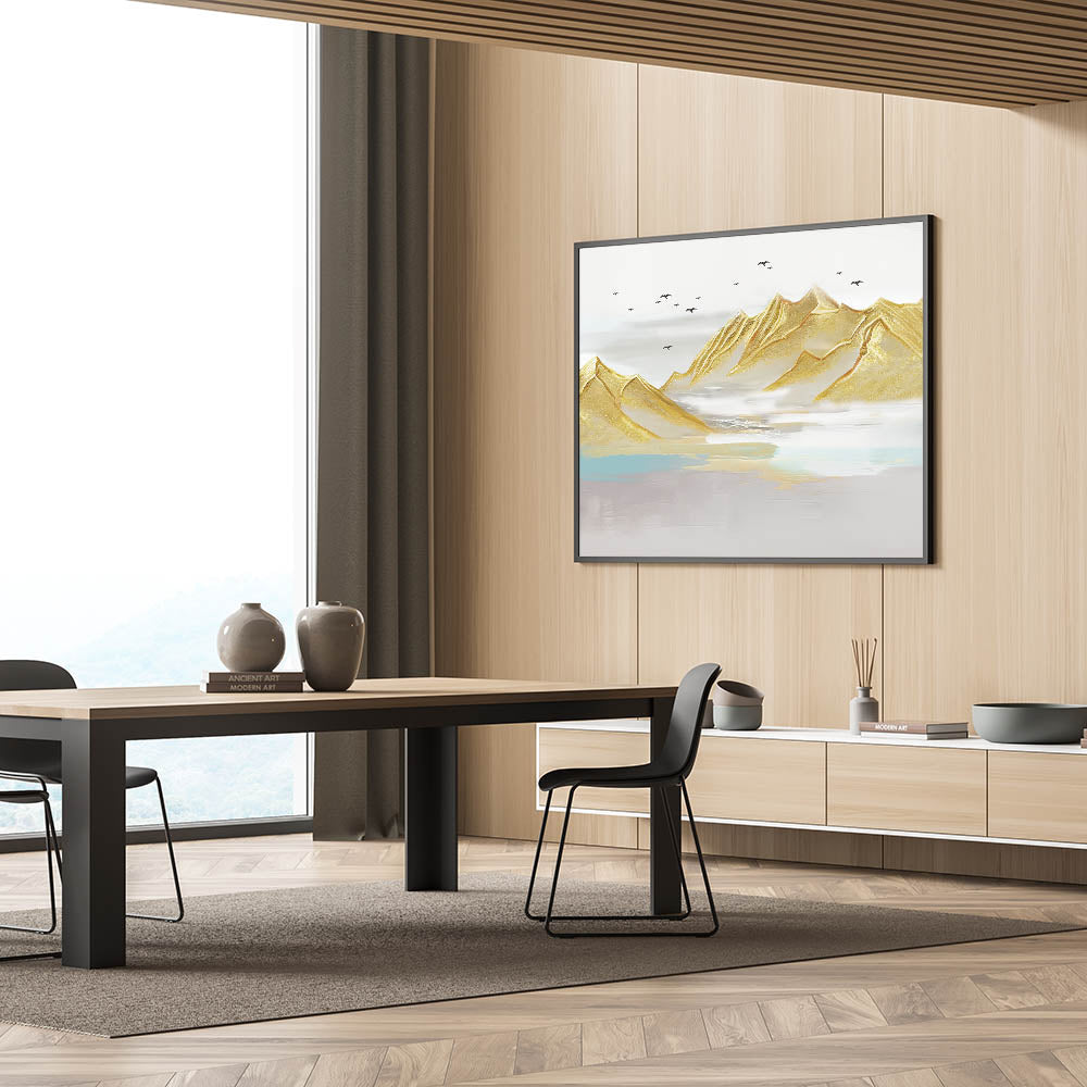 - Design: Stunning abstract strokes and lines forming a golden mountain range, perfect for enhancing your living space with a touch of elegance.