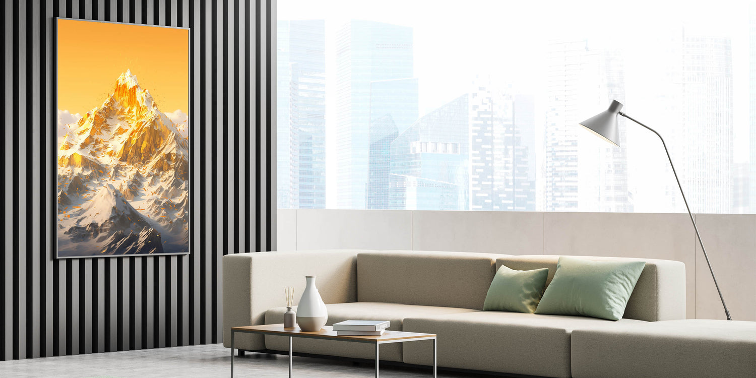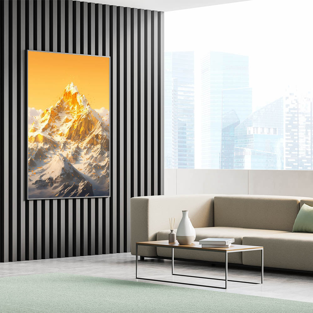 Elevate your décor with the mesmerizing beauty of this golden mountain canvas art. Its dazzling warmth and serene snow details are sure to captivate and inspire.