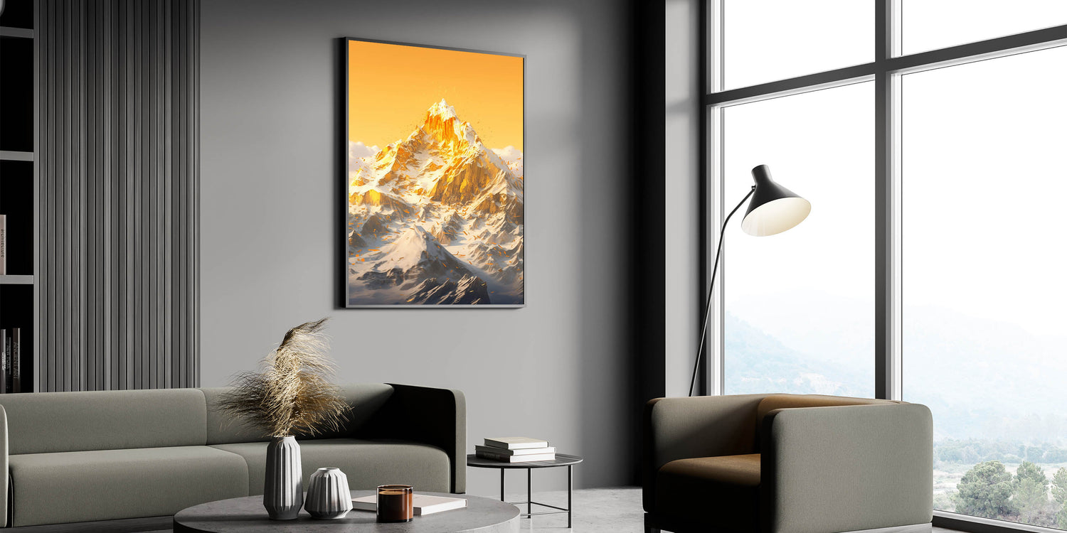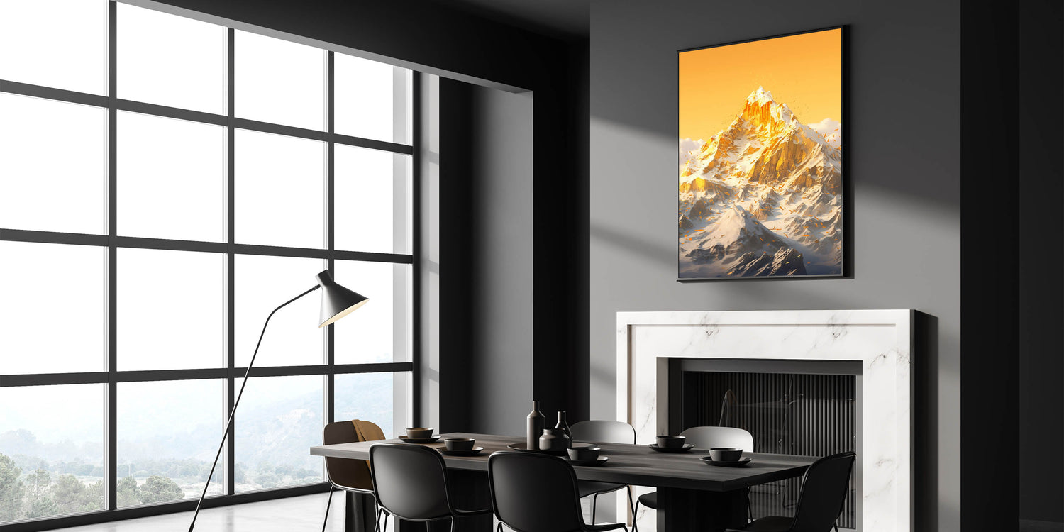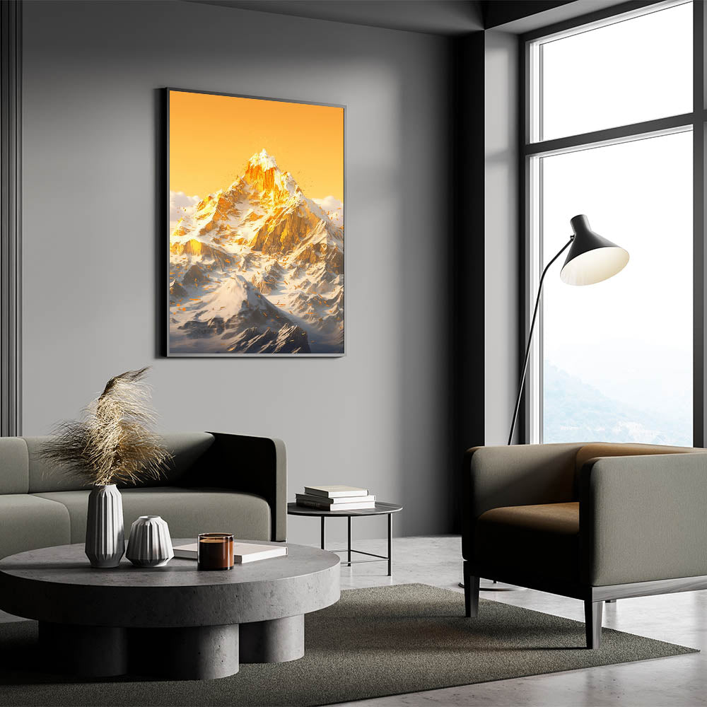 Bring the ethereal beauty of a golden mountain sunset into your home with this luxurious canvas artwork. Featuring a majestic peak bathed in radiant golden light, this piece evokes a sense of wonder and serenity. The intricate texture of the snow-capped mountains contrasts beautifully with the glowing amber sky, creating a dramatic and captivating visual experience.