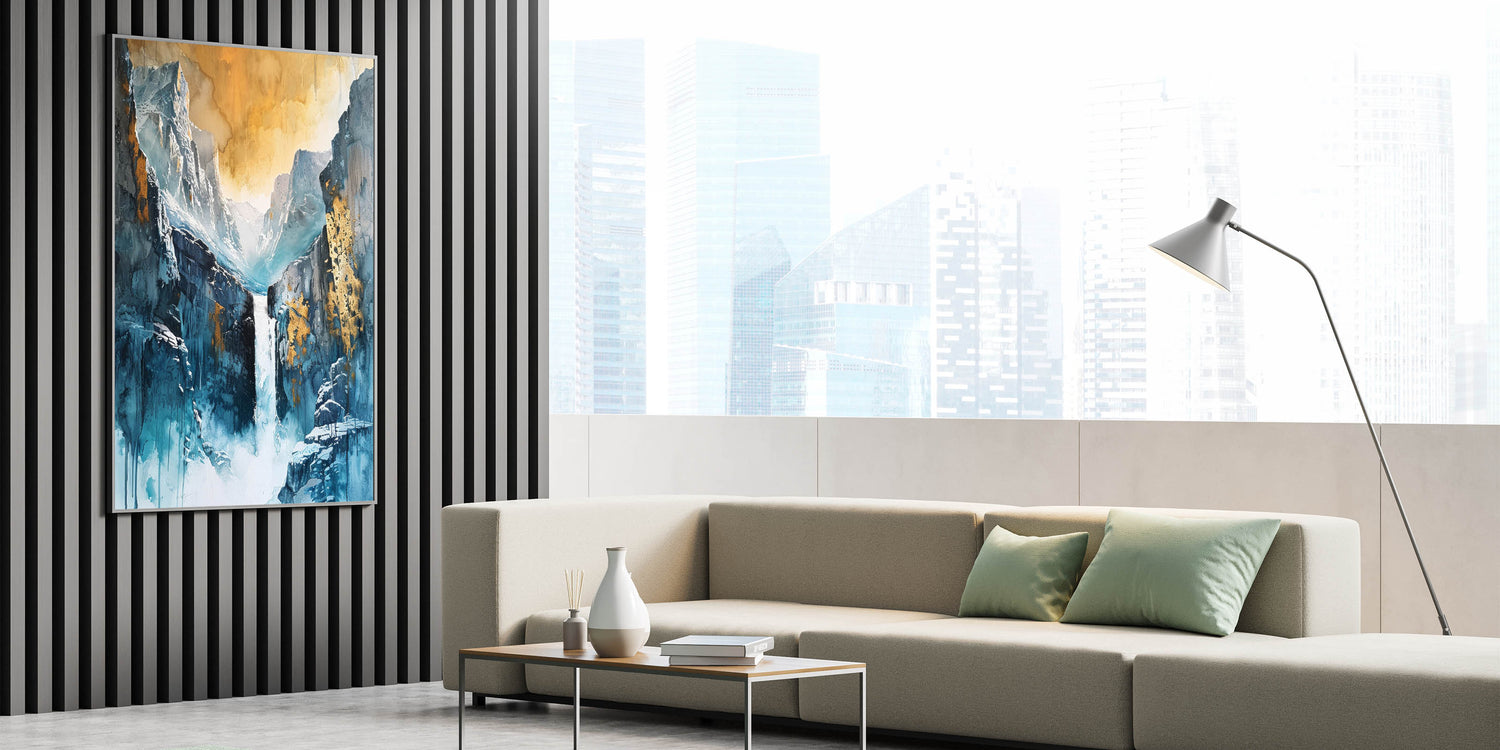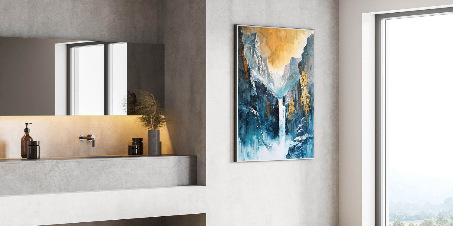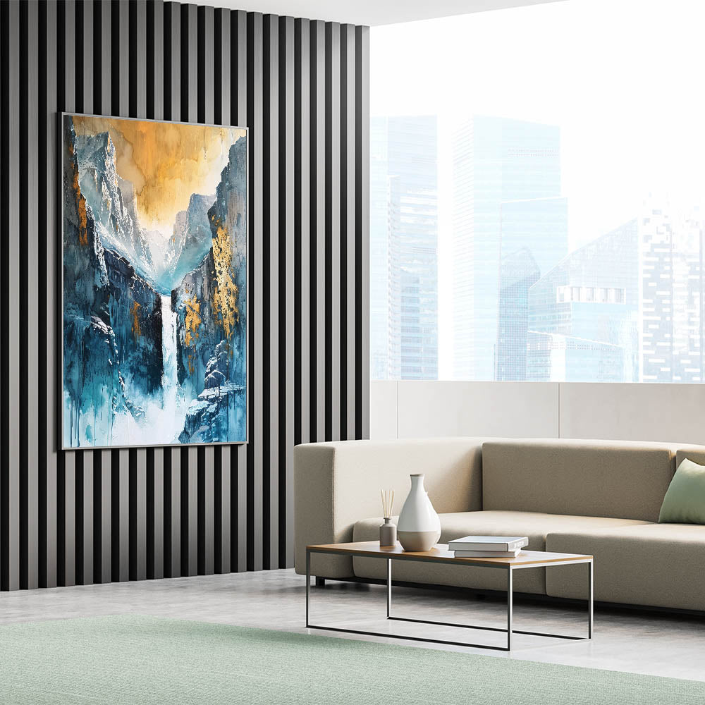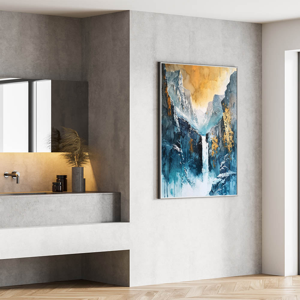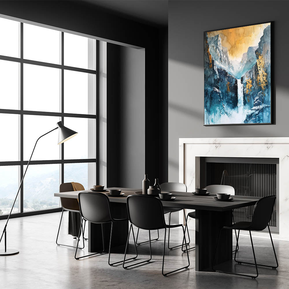 Bring the awe-inspiring beauty of nature into your home with this captivating artwork featuring towering, snow-covered mountains and a powerful waterfall. The serene blue tones evoke a sense of calm and tranquility, while the shimmering gold accents add a touch of elegance and luxury to the rugged wilderness. The contrast between the cool, icy peaks and the warm golden light creates a mesmerizing visual balance, making this piece an ideal statement artwork for any space.