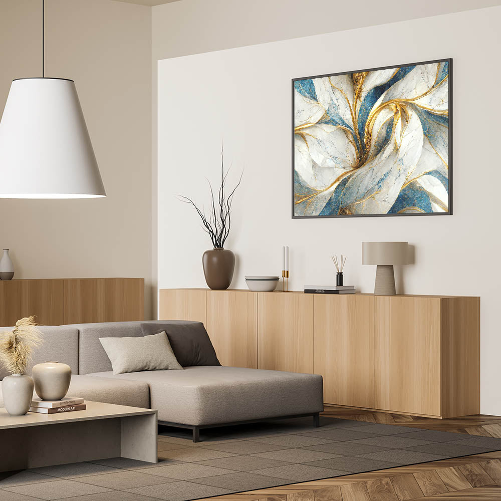 Introduce a touch of luxury and elegance to your space with this Intricate Abstract Line Art. Featuring a stunning blend of gold and blue strokes, this piece captures the essence of sophistication and opulence, making it a perfect statement for any contemporary or classic interior setting.