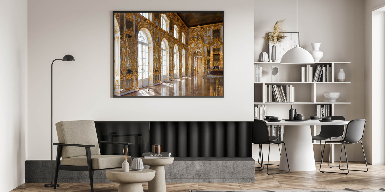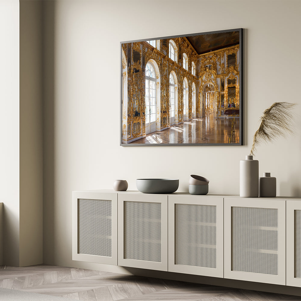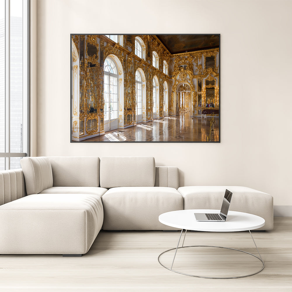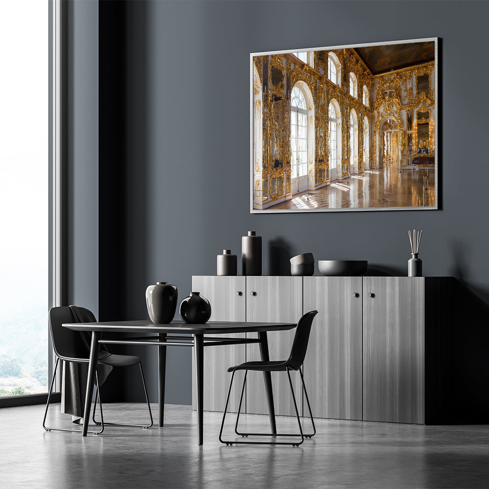 Step into the opulence of Baroque architecture with this breathtaking wall art, featuring a richly decorated palace interior adorned with gilded mirrors and ornate detailing. The golden accents and intricate carvings are meticulously captured, reflecting the grandeur and elegance of royal design. This piece is ideal for those who appreciate luxurious decor and the timeless beauty of historical palaces, making it a stunning addition to any living space.