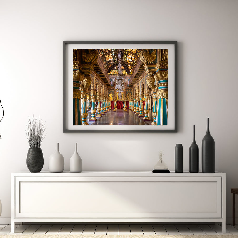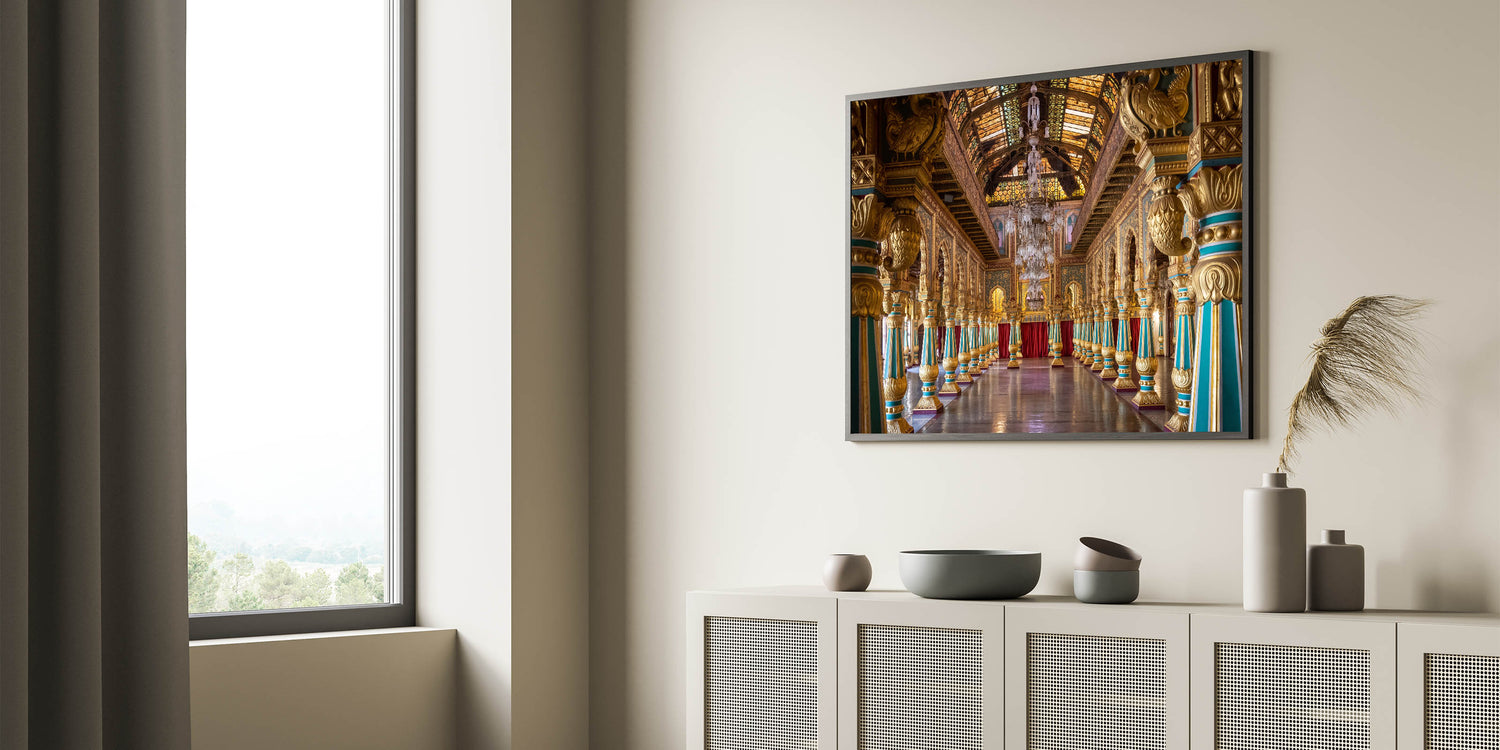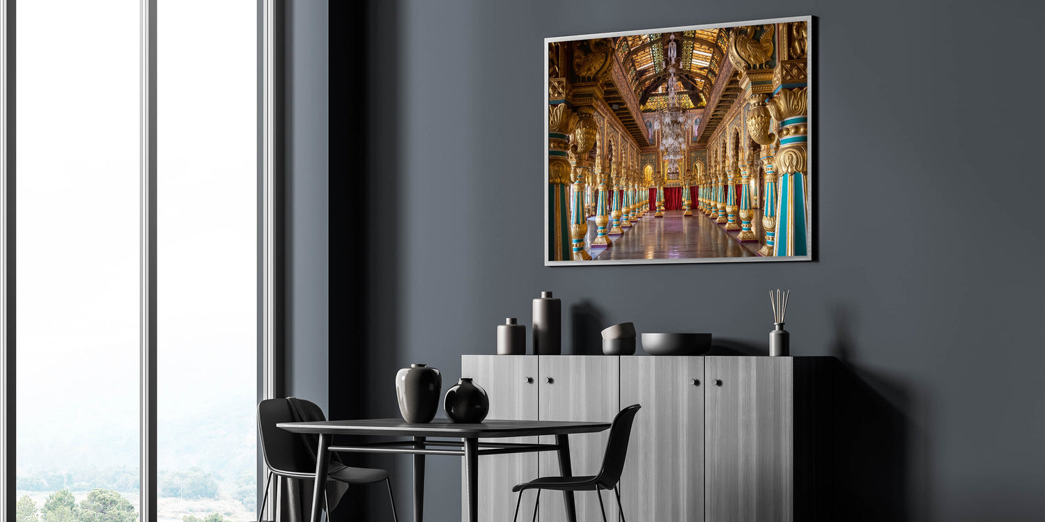 - Detailed Craftsmanship: The print showcases the intricate designs and stunning architecture of the palace interior, highlighting the beauty of its ornate columns and chandeliers.