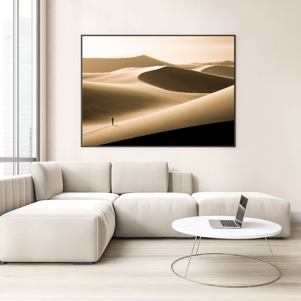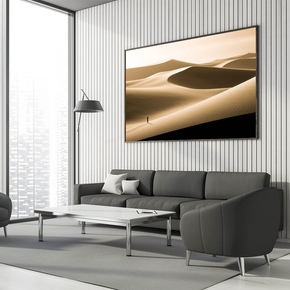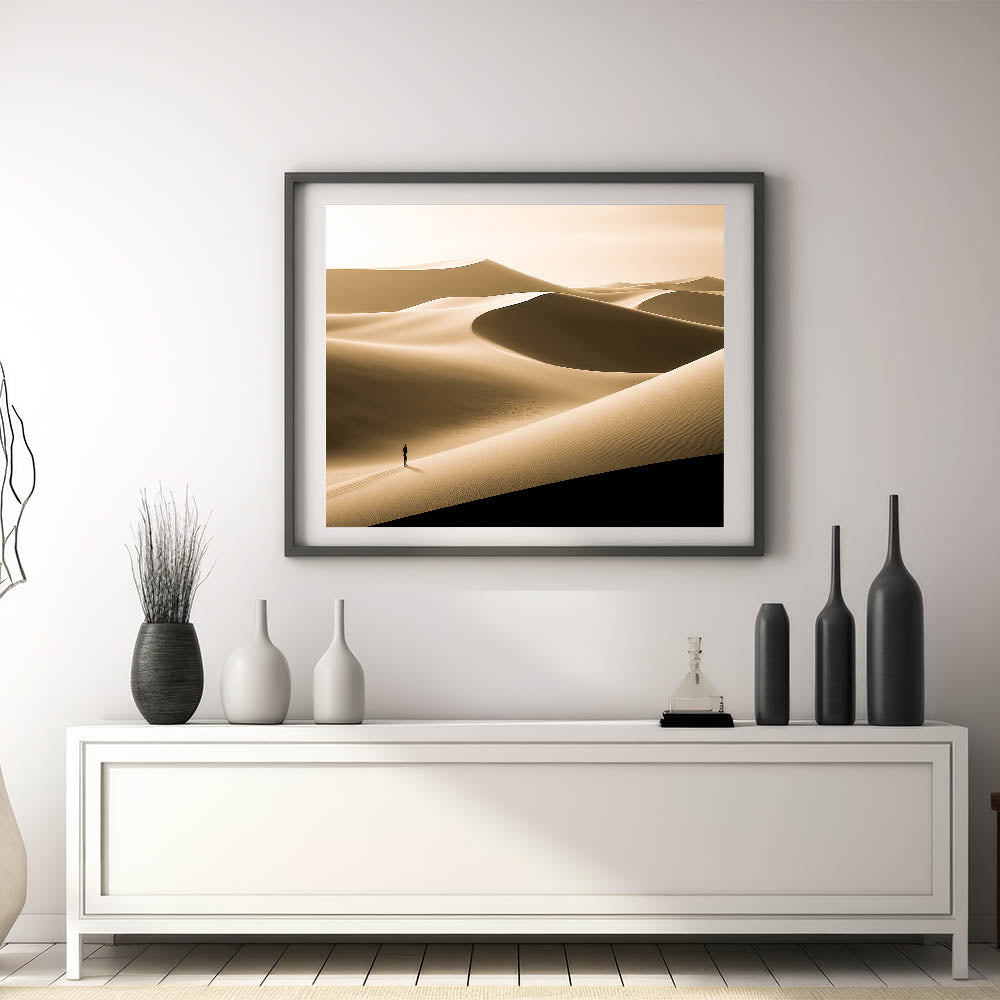 Immerse your space in the quiet beauty of this minimalist dune wall art, featuring a serene desert landscape bathed in soft gold tones. The smooth, flowing lines of the dunes create a peaceful and expansive scene, while the solitary figure adds a sense of scale and contemplation. This artwork is perfect for those who appreciate the simplicity and elegance of nature.