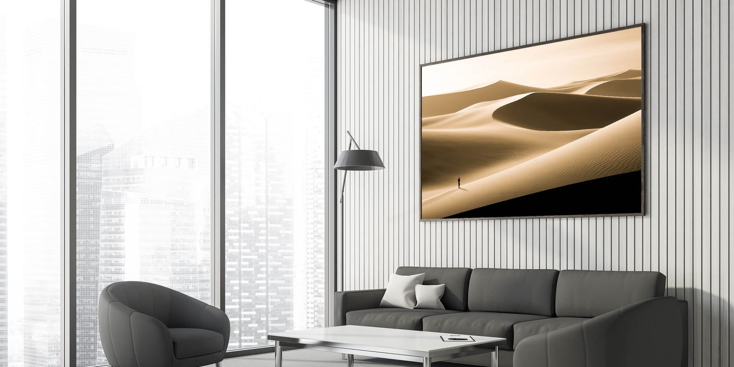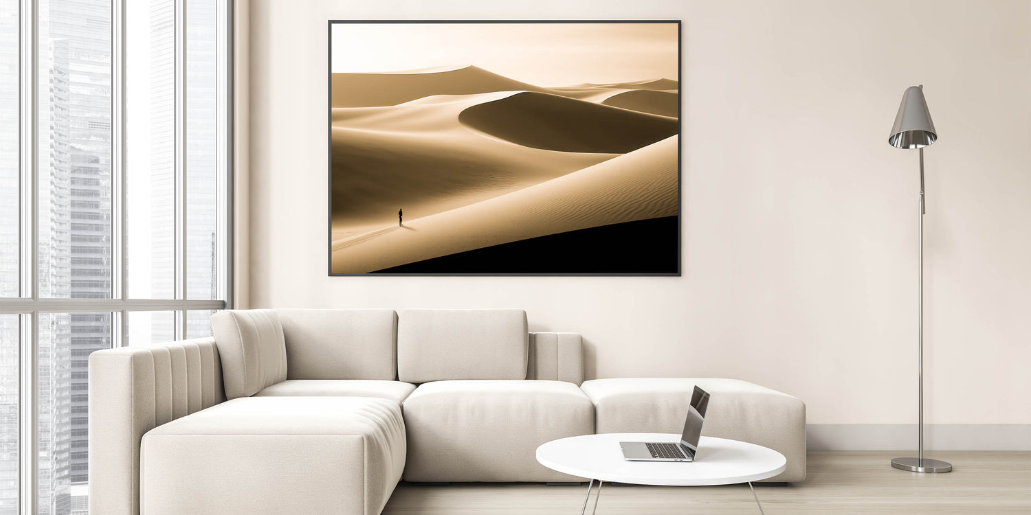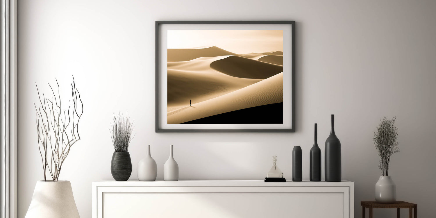 Immerse your space in the quiet beauty of this minimalist dune wall art, featuring a serene desert landscape bathed in soft gold tones. The smooth, flowing lines of the dunes create a peaceful and expansive scene, while the solitary figure adds a sense of scale and contemplation. This artwork is perfect for those who appreciate the simplicity and elegance of nature.