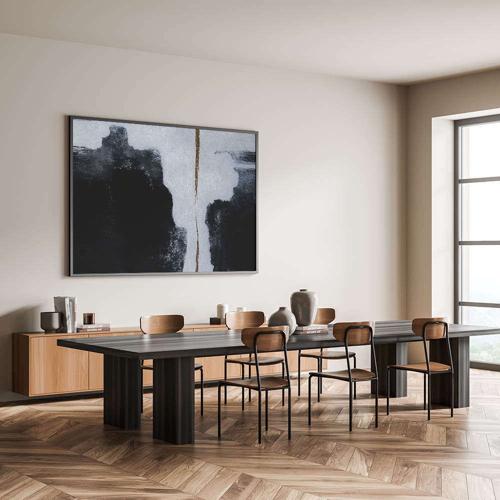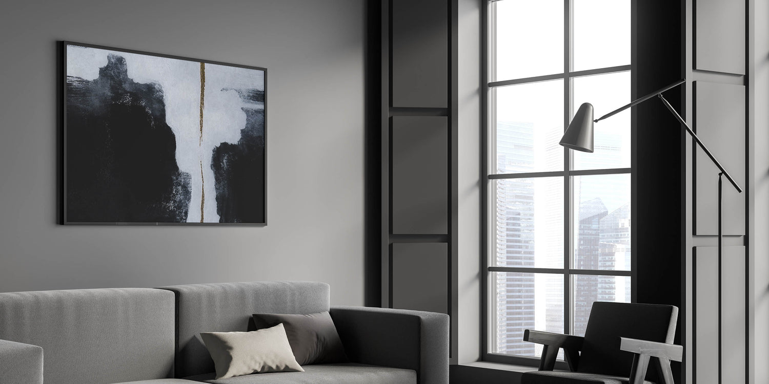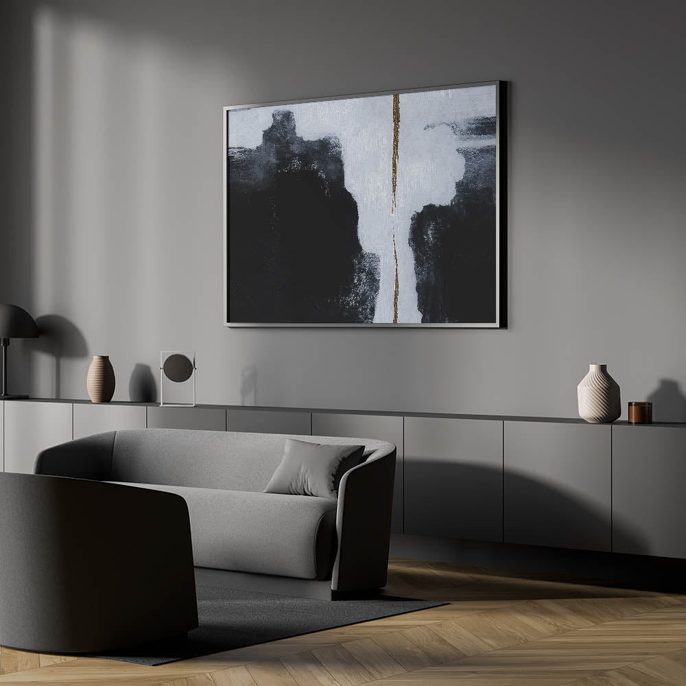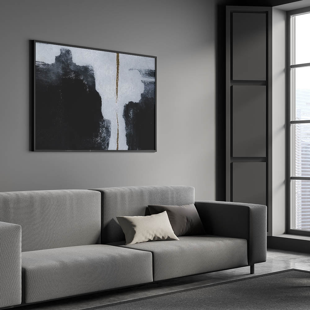 Add a bold statement to your space with this minimalist strokes and lines abstract art. This piece features a striking contrast of deep black and crisp white, divided by a subtle yet impactful gold accent. The sharp lines and monochrome palette create a powerful visual, perfect for modern and contemporary interiors looking to make a statement.
