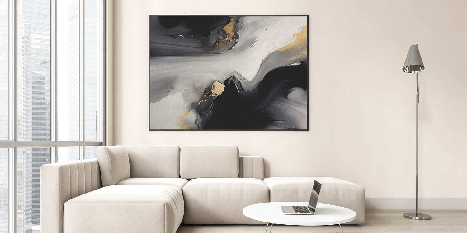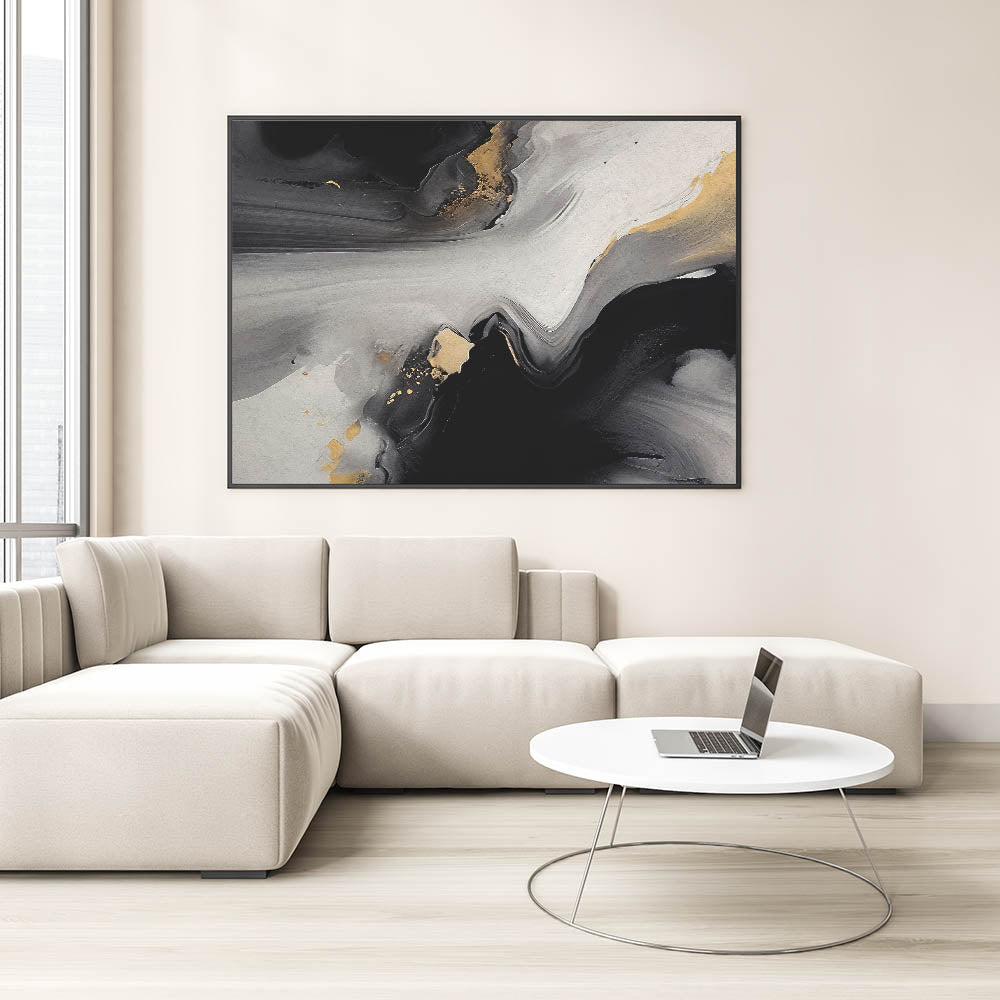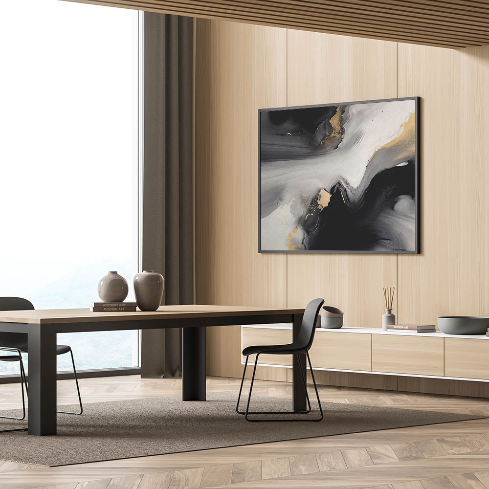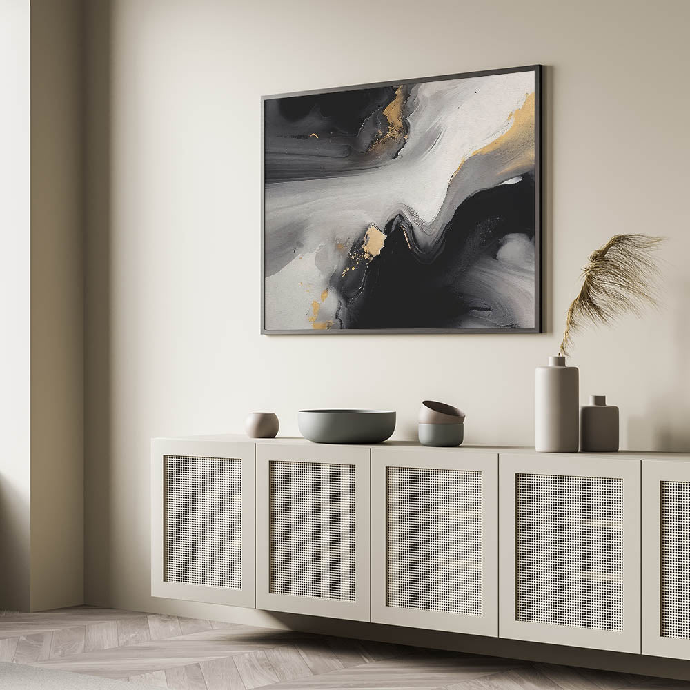 Elevate your space with this captivating Modern Abstract Strokes and Lines Art. This artwork features a dramatic blend of black, gray, and gold tones, creating a striking visual impact. The fluid brush strokes and metallic accents give the piece a sense of movement and depth, making it a perfect addition to any modern or contemporary interior.