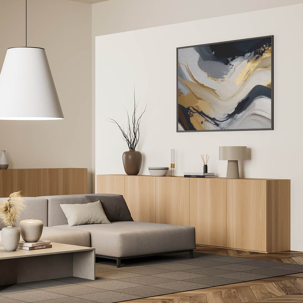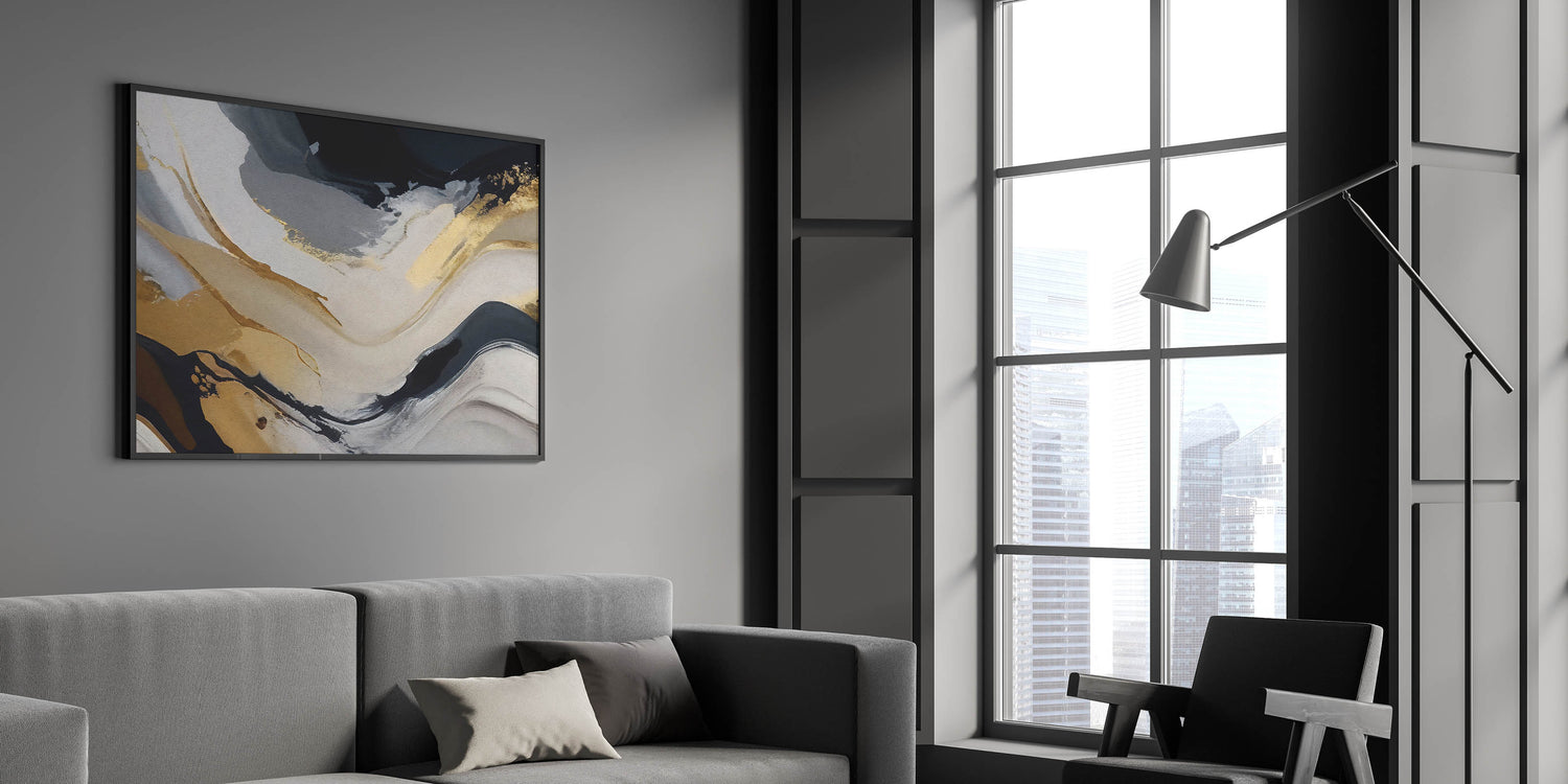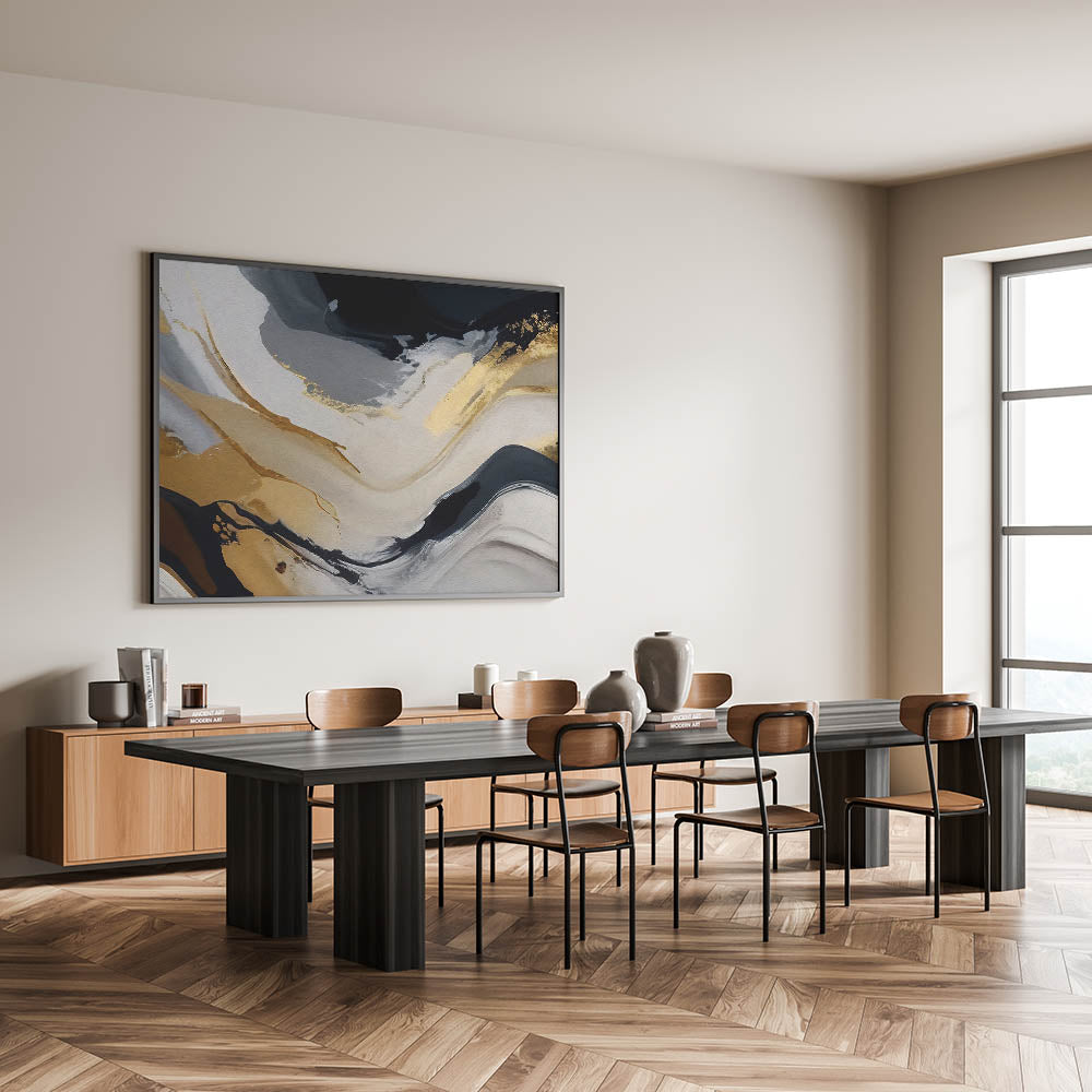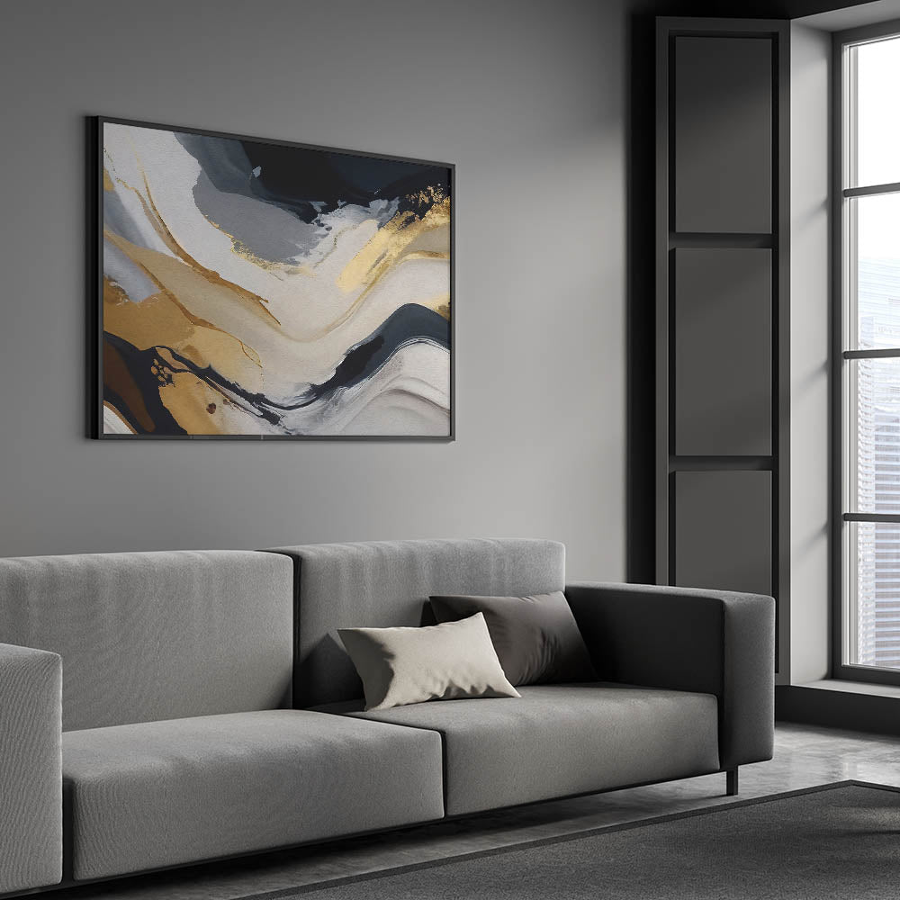 Transform your space with this Modern Flowing Strokes Abstract Art, a dynamic blend of black, gold, and gray tones that create a sense of movement and depth. This artwork captures the fluidity of abstract lines and strokes, bringing a contemporary and elegant touch to any room. The contrast between the bold black and the soft grays, highlighted by luxurious gold accents, makes this piece a versatile choice for both modern and classic interiors.