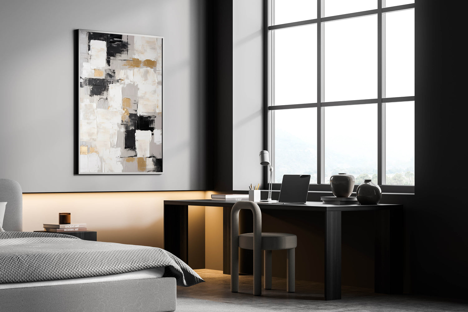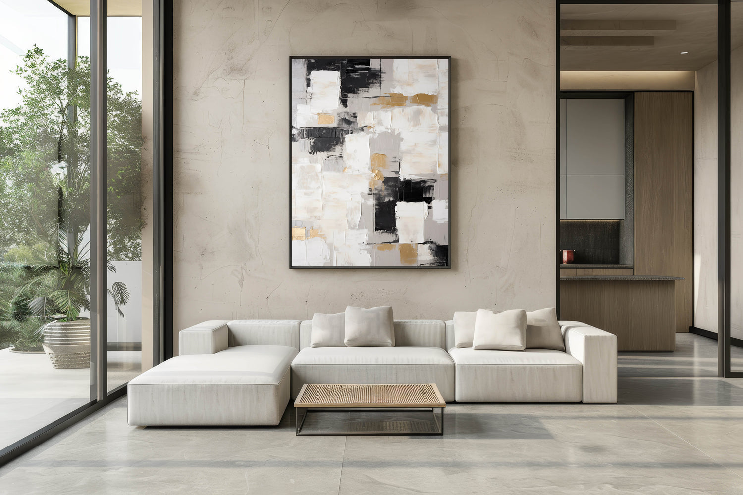 Elevate your home decor with this Modern Neutral Abstract Art with Gold Accents. This artwork exudes sophistication and contemporary style with its neutral palette of black, white, gray, and subtle gold accents. The textured brushstrokes and geometric patterns create a sense of depth and movement, making it a perfect statement piece for any modern or minimalist interior.
