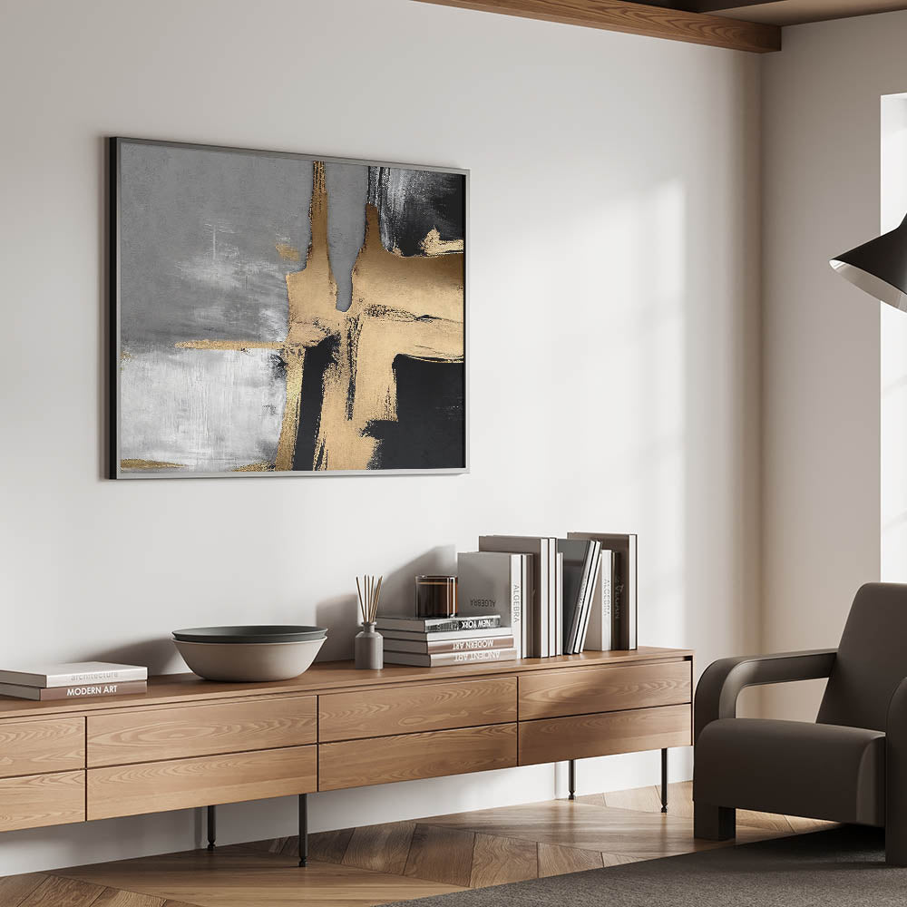 Elevate your space with this modern strokes and lines abstract art that exudes urban sophistication. This piece features a striking combination of rich gold and muted gray tones, interwoven with bold black strokes that create a powerful visual statement. The textured brushwork and geometric elements add depth and character, making it a perfect focal point for any contemporary or industrial interior.