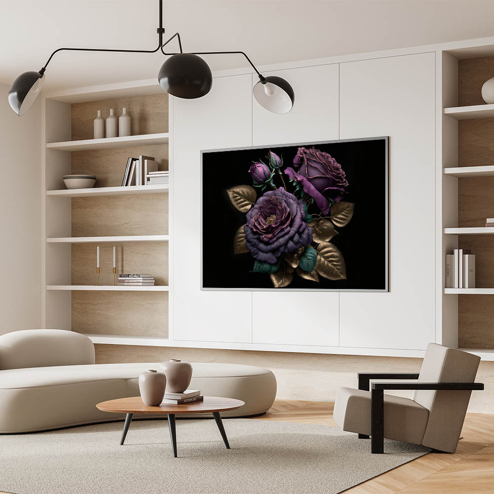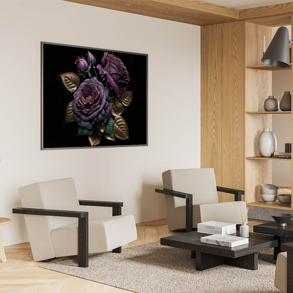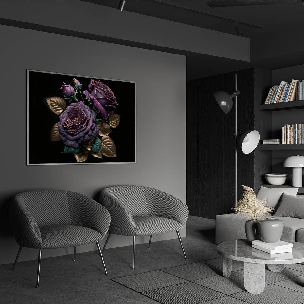 Add a touch of luxury to your space with this exquisite purple rose wall art, featuring deep purple blooms accented by shimmering gold leaves. The rich colors and metallic detailing make this floral rose artwork a sophisticated statement piece that will enhance any room's décor. Perfect for those who appreciate elegance and bold design, this piece offers a timeless blend of opulence and modern style.