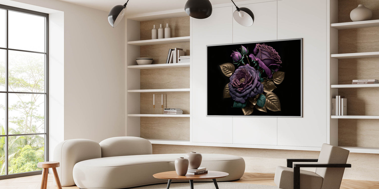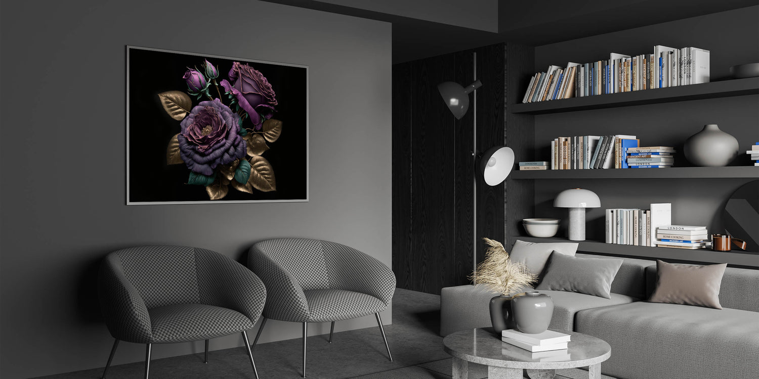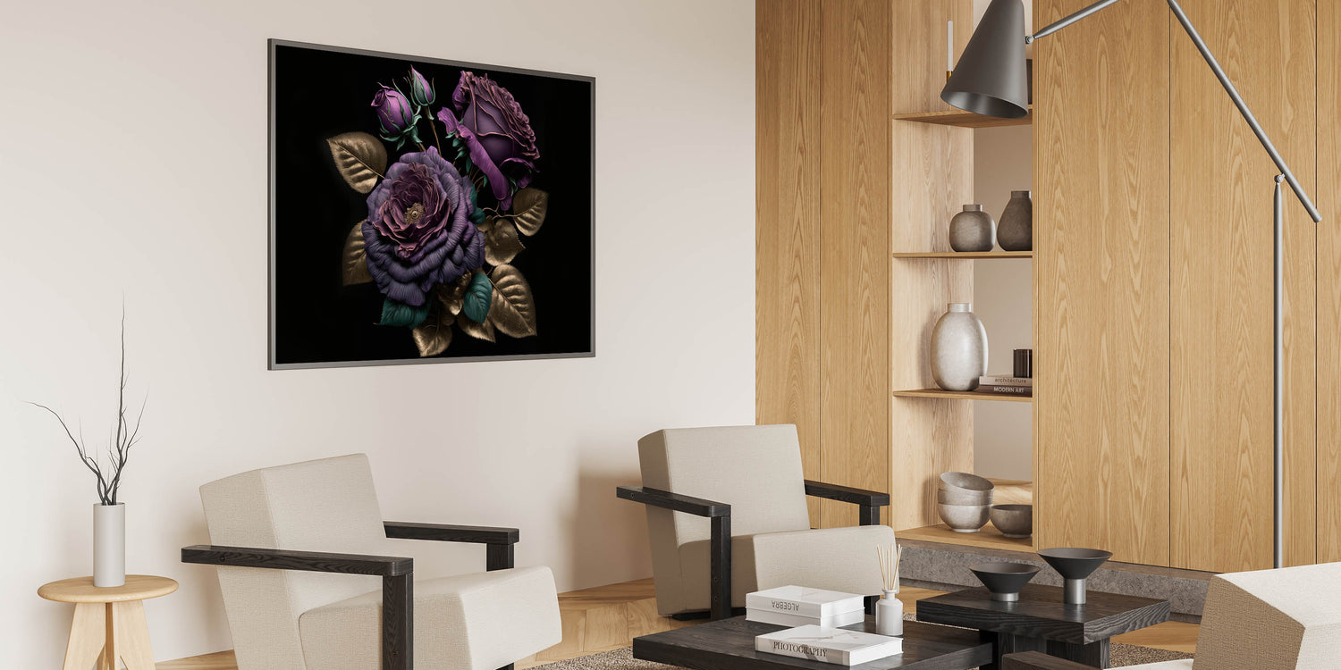 Add a touch of luxury to your space with this exquisite purple rose wall art, featuring deep purple blooms accented by shimmering gold leaves. The rich colors and metallic detailing make this floral rose artwork a sophisticated statement piece that will enhance any room's décor. Perfect for those who appreciate elegance and bold design, this piece offers a timeless blend of opulence and modern style.